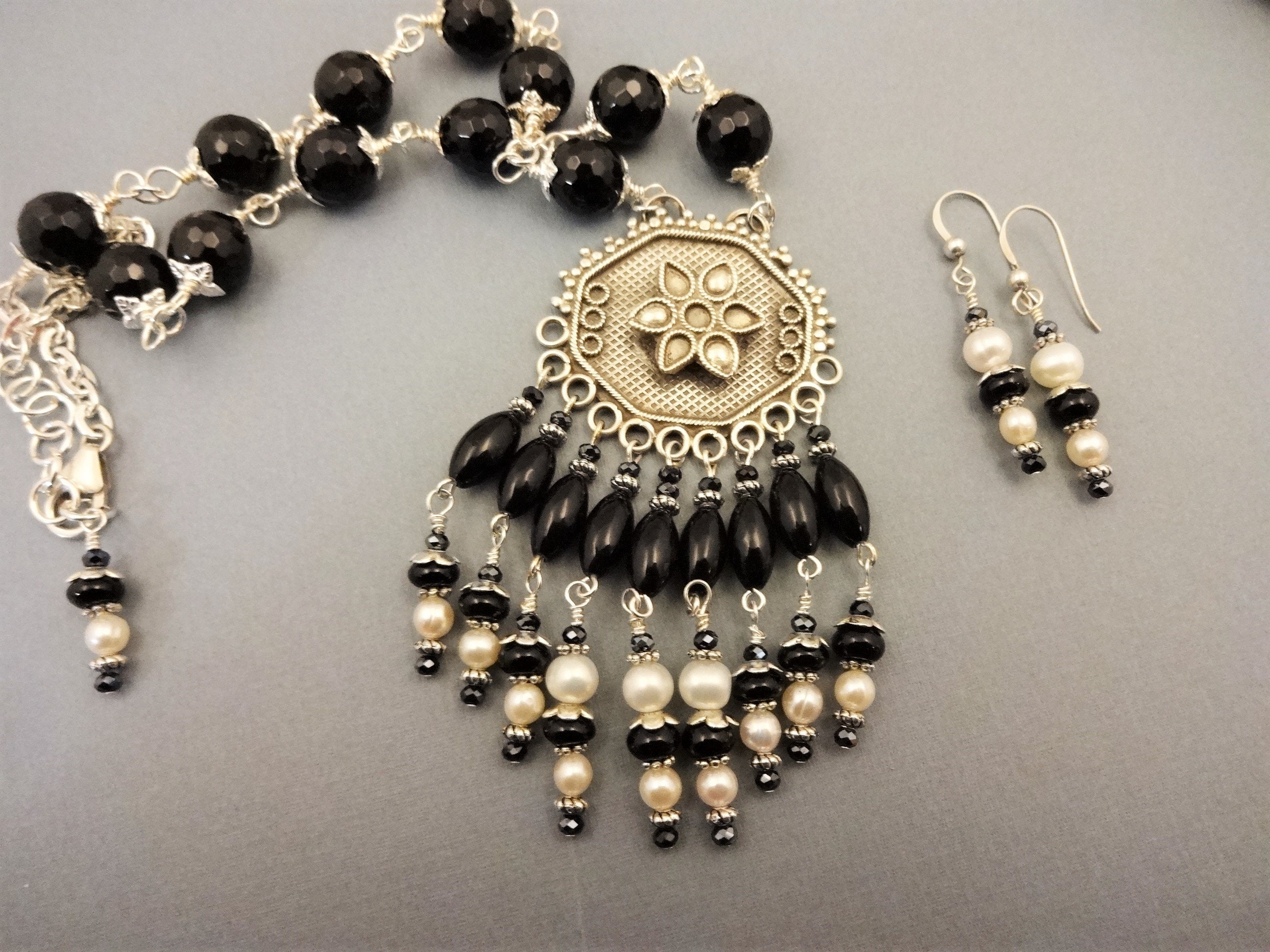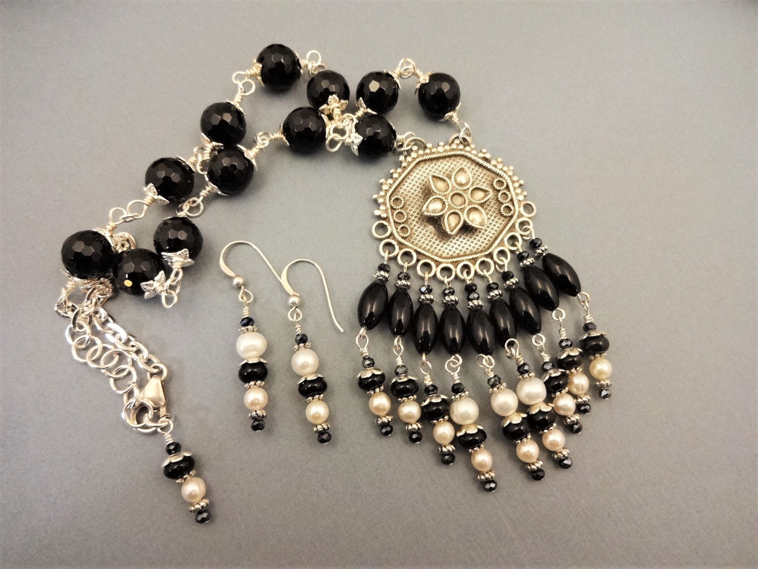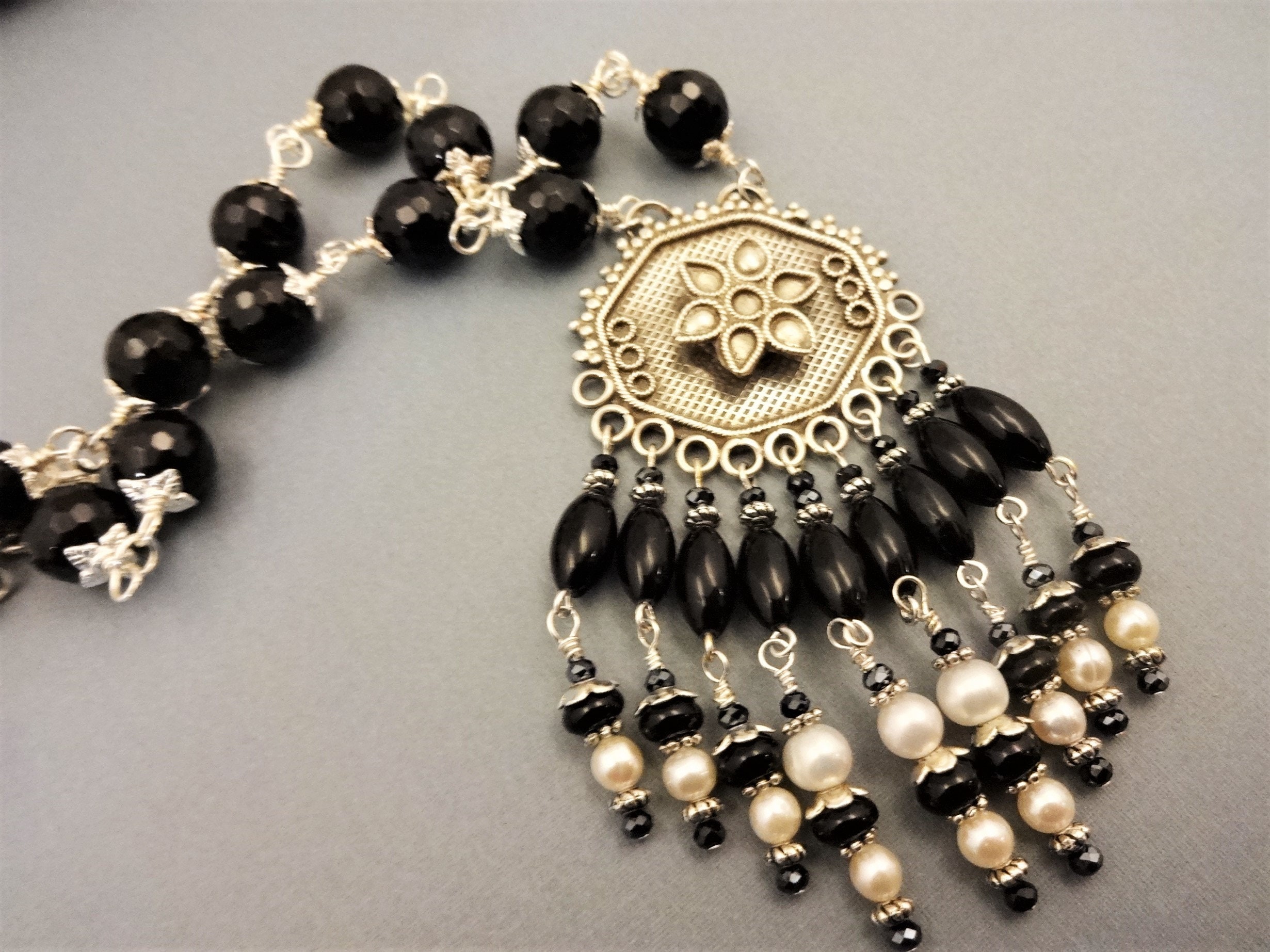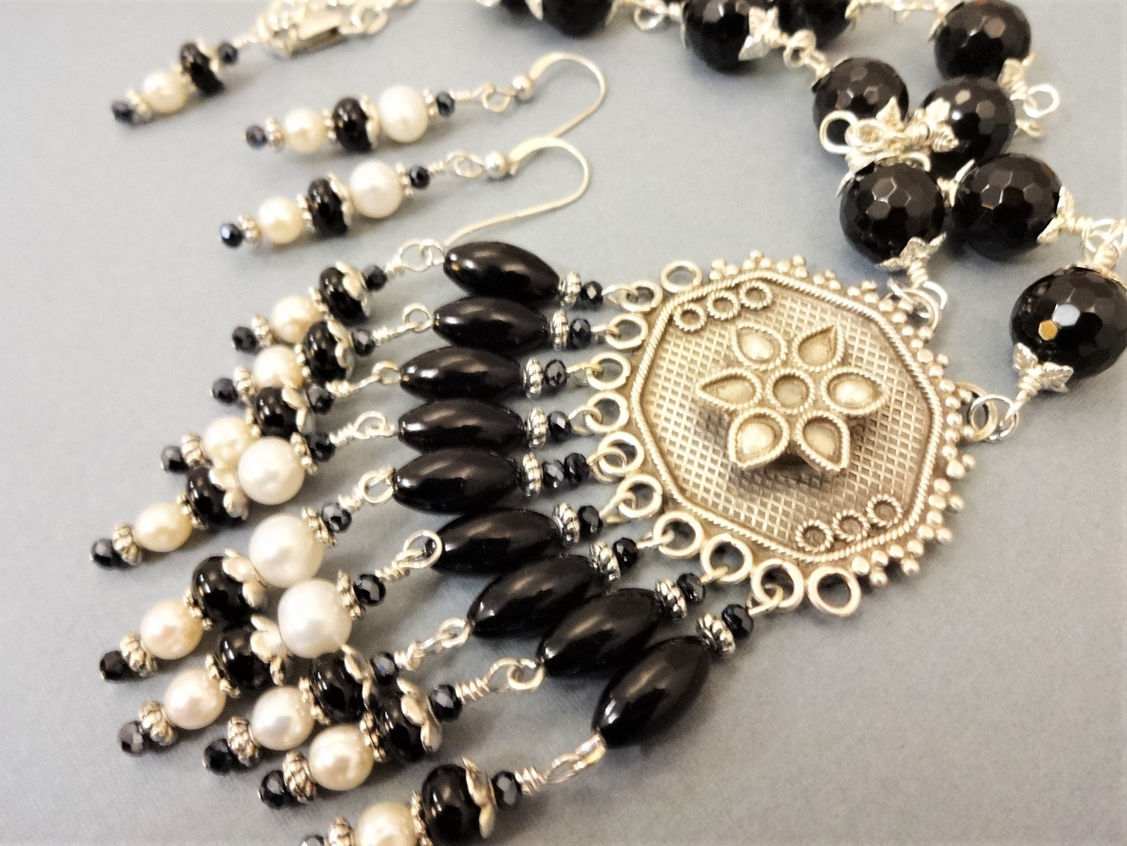 Sterling Silver Fringe Necklace with Black Onyx White Pearls and Gray Crystals, Statement Fringe Necklace, Black and White Jewelry Set