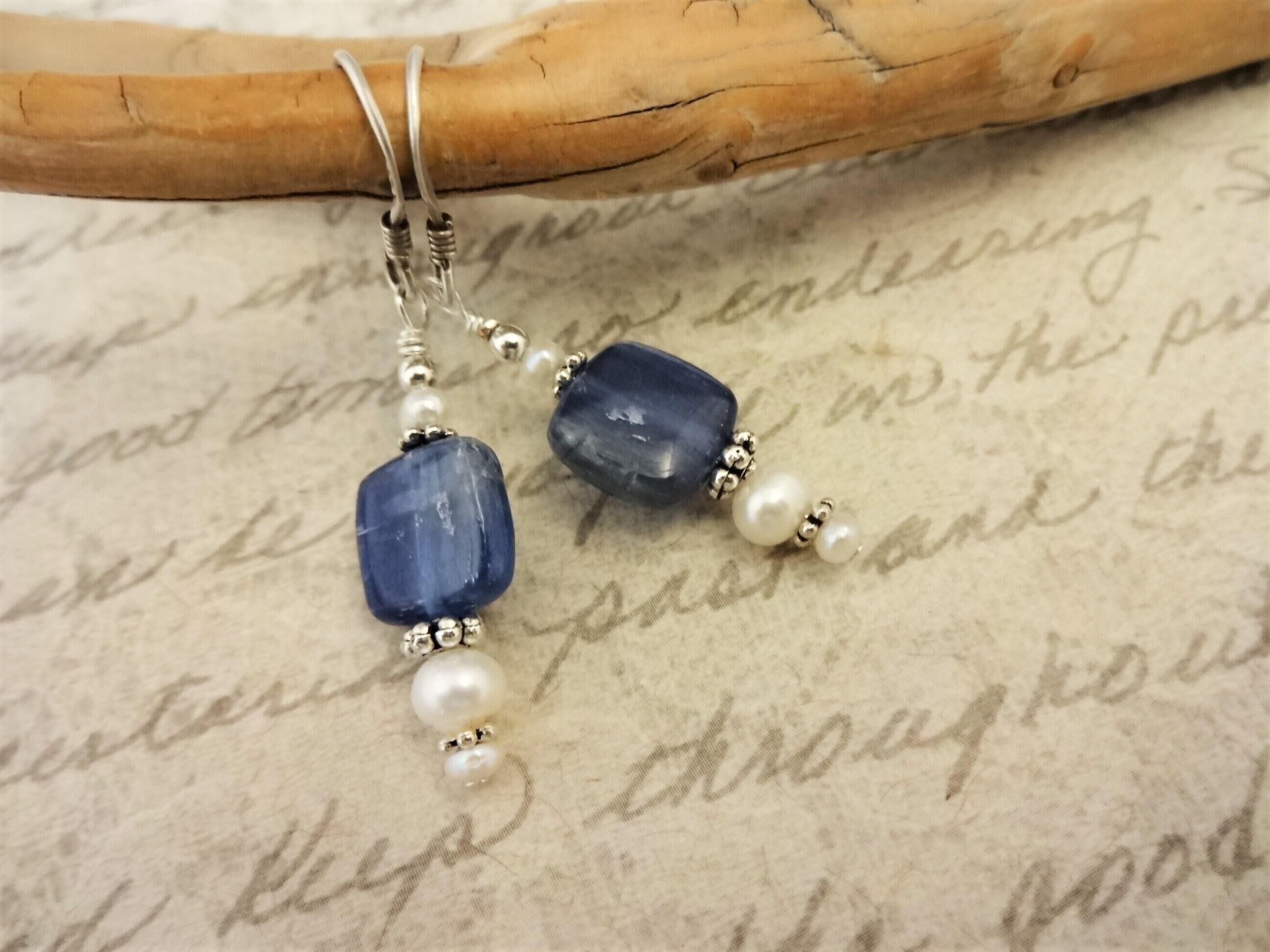 Kyanite and White Pearl Earrings, Blue Gemstone Earrings, Blue Kyanite Jewelry, Gift for Mom, Gift for Wife