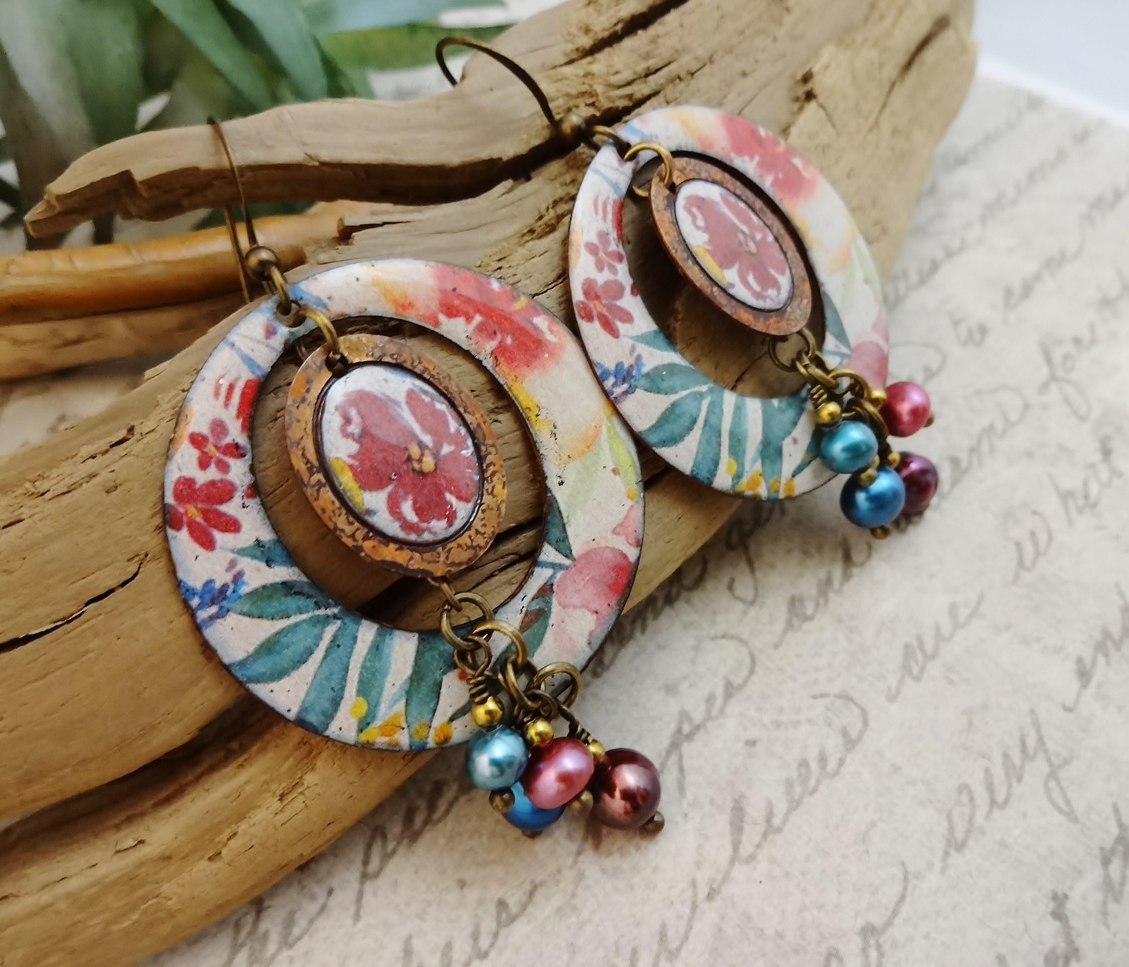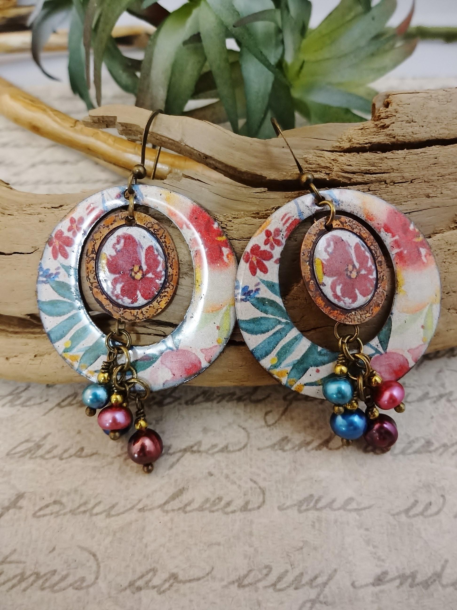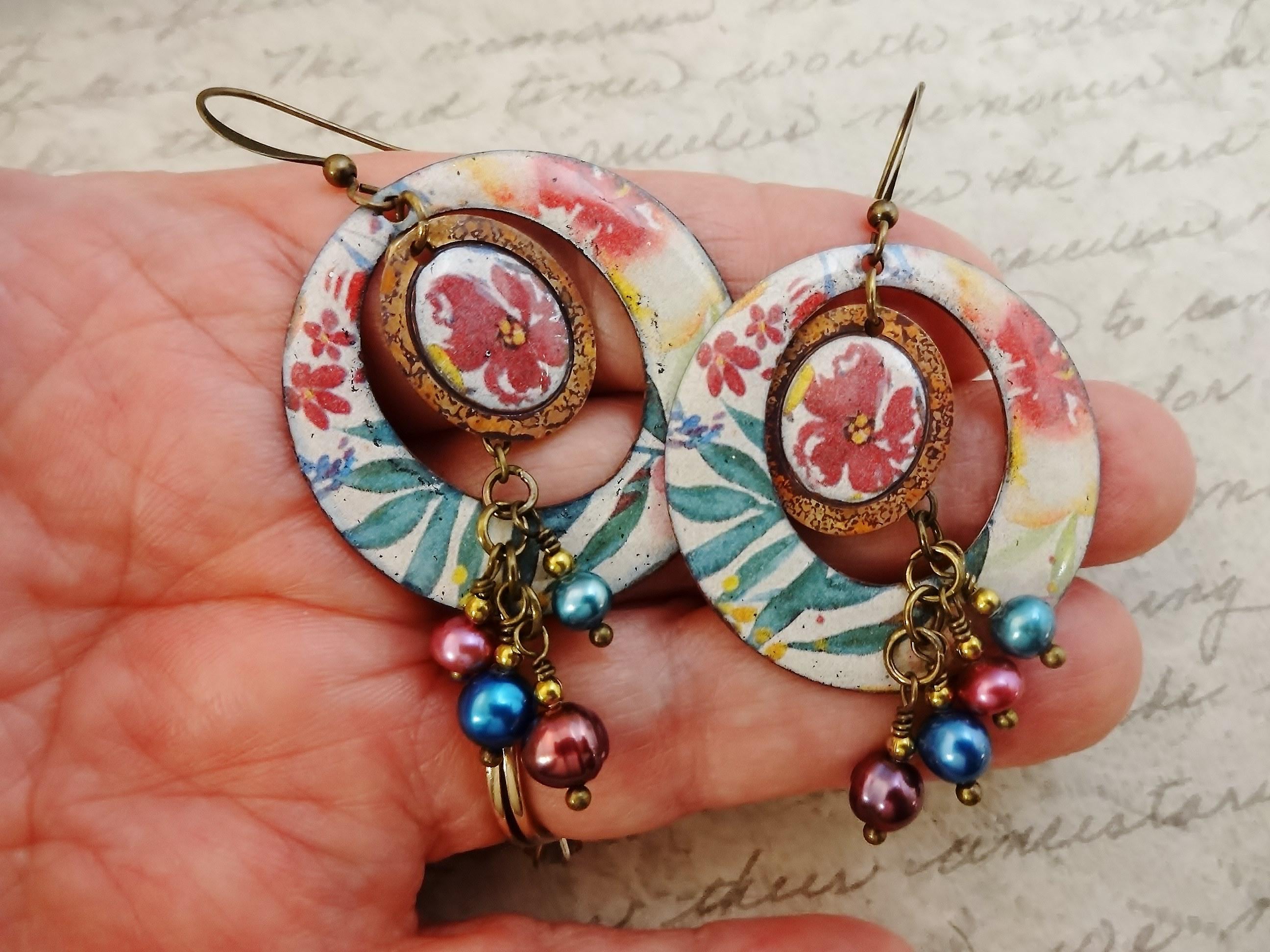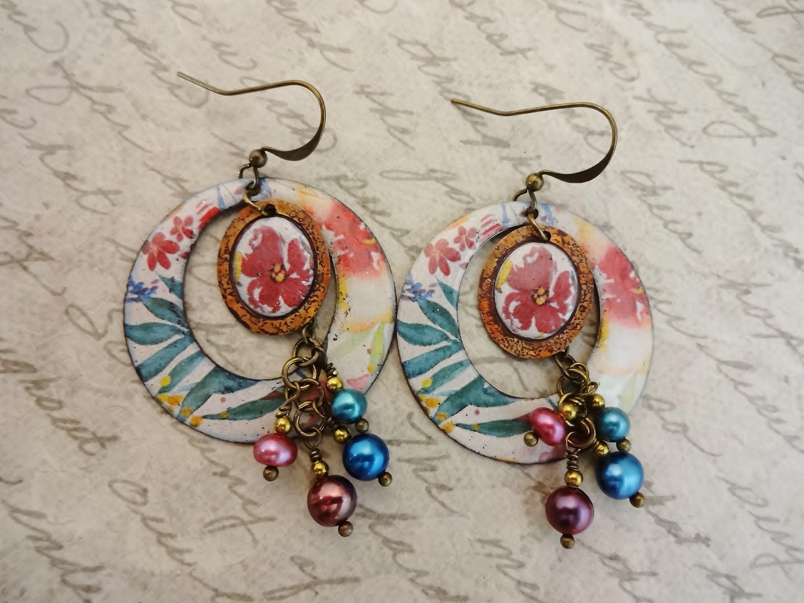 I kept the design very simple to highlight the enamels. I used antique brass jump rings and ear wires to keep the rustic, vintage feel. Four pearls in rose and aqua dangle from a chain behind the inner oval spilling over the bottom of the outer oval.