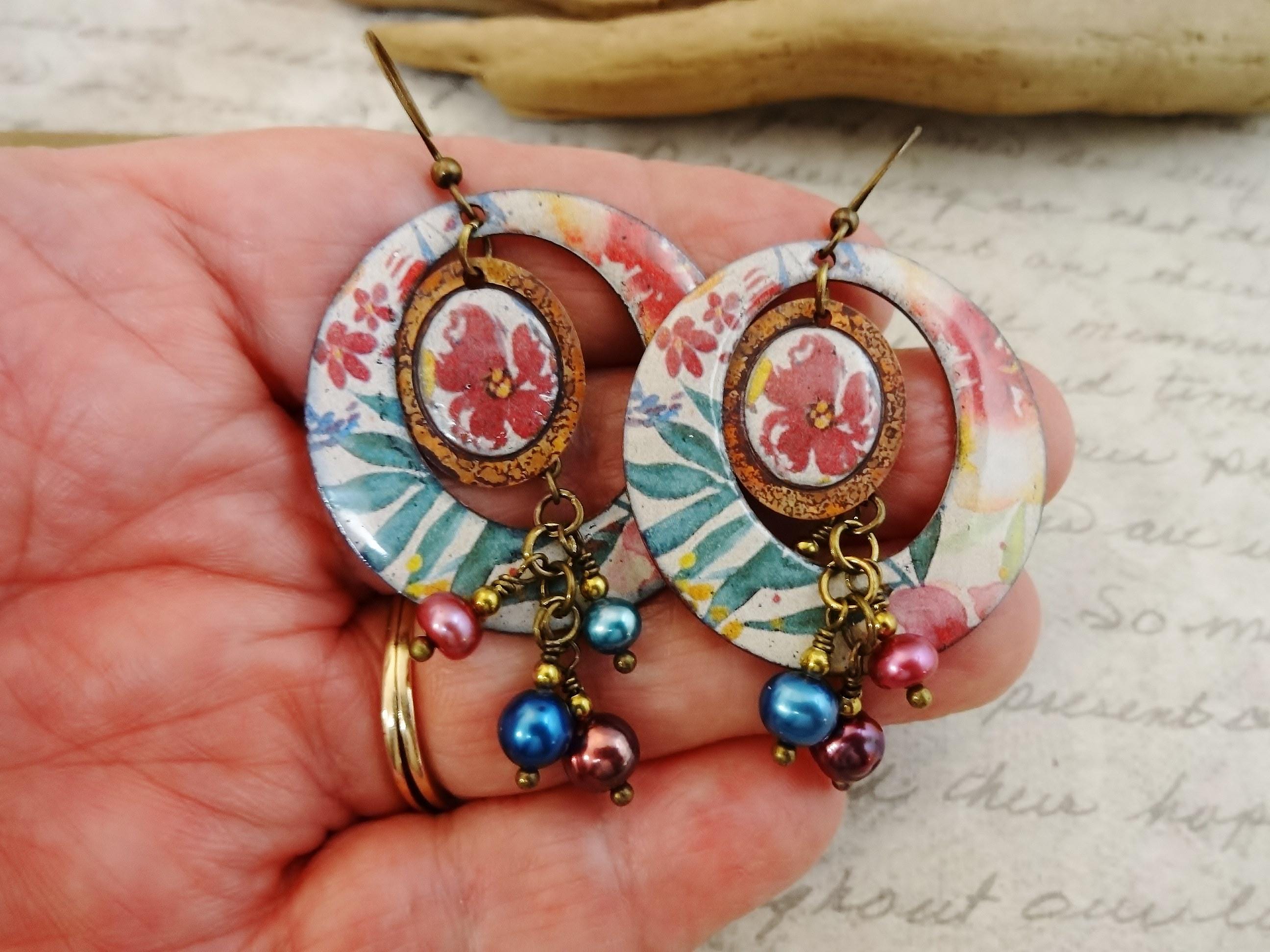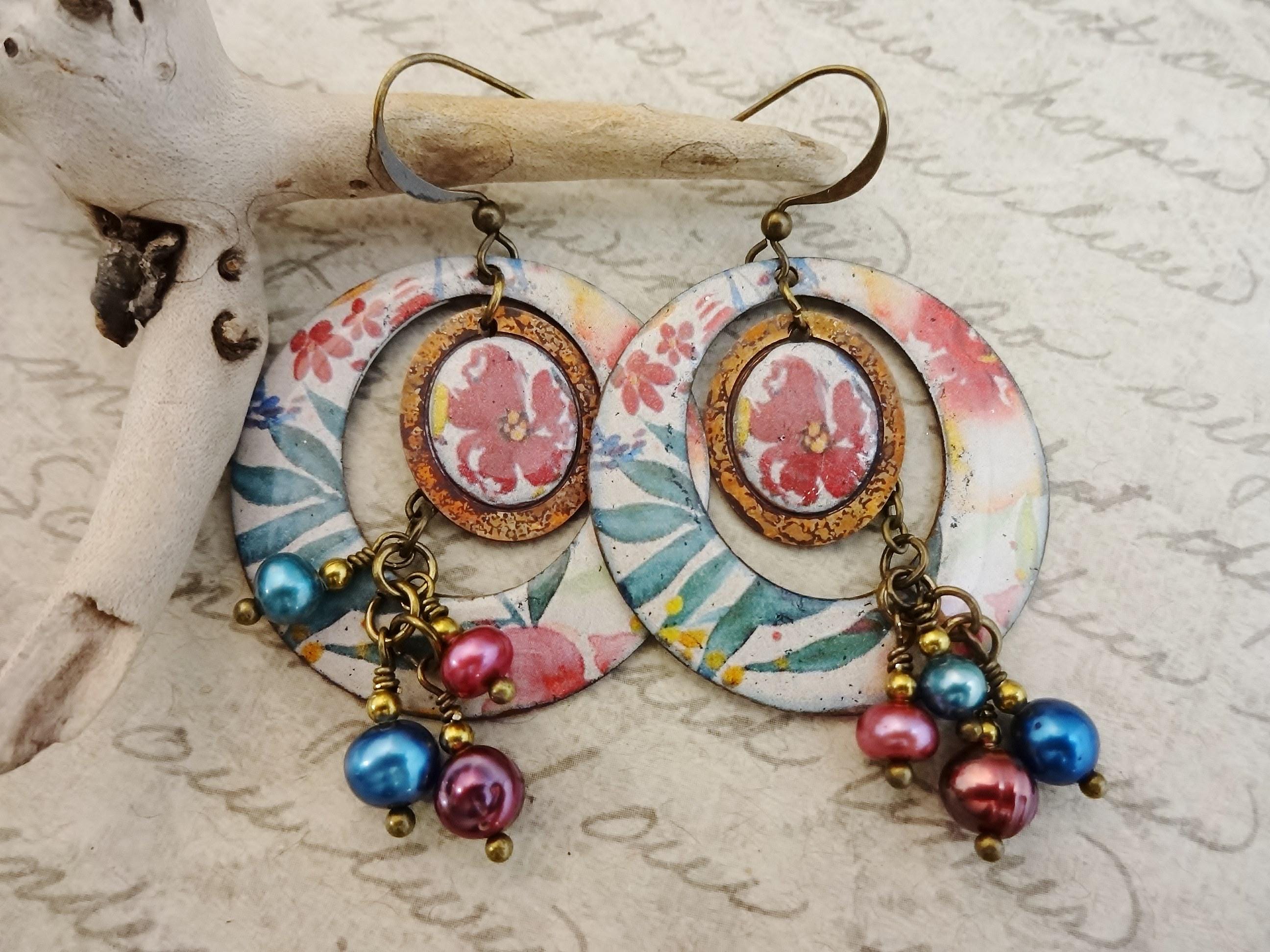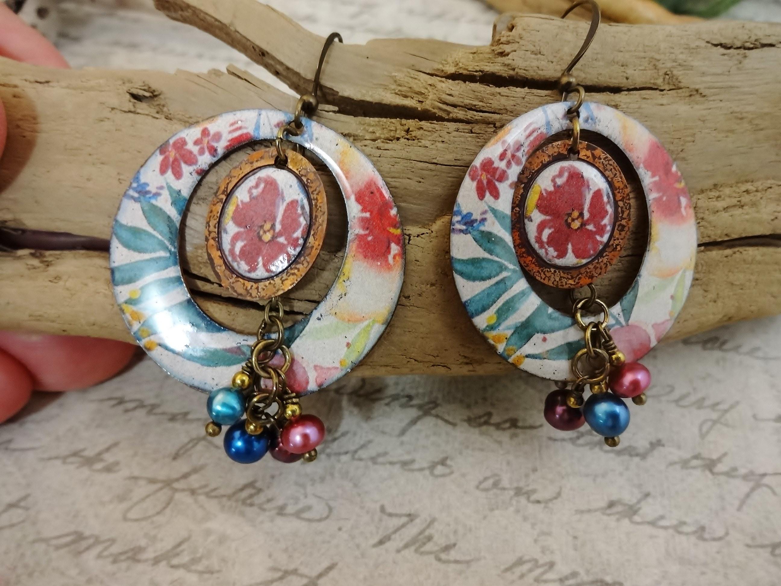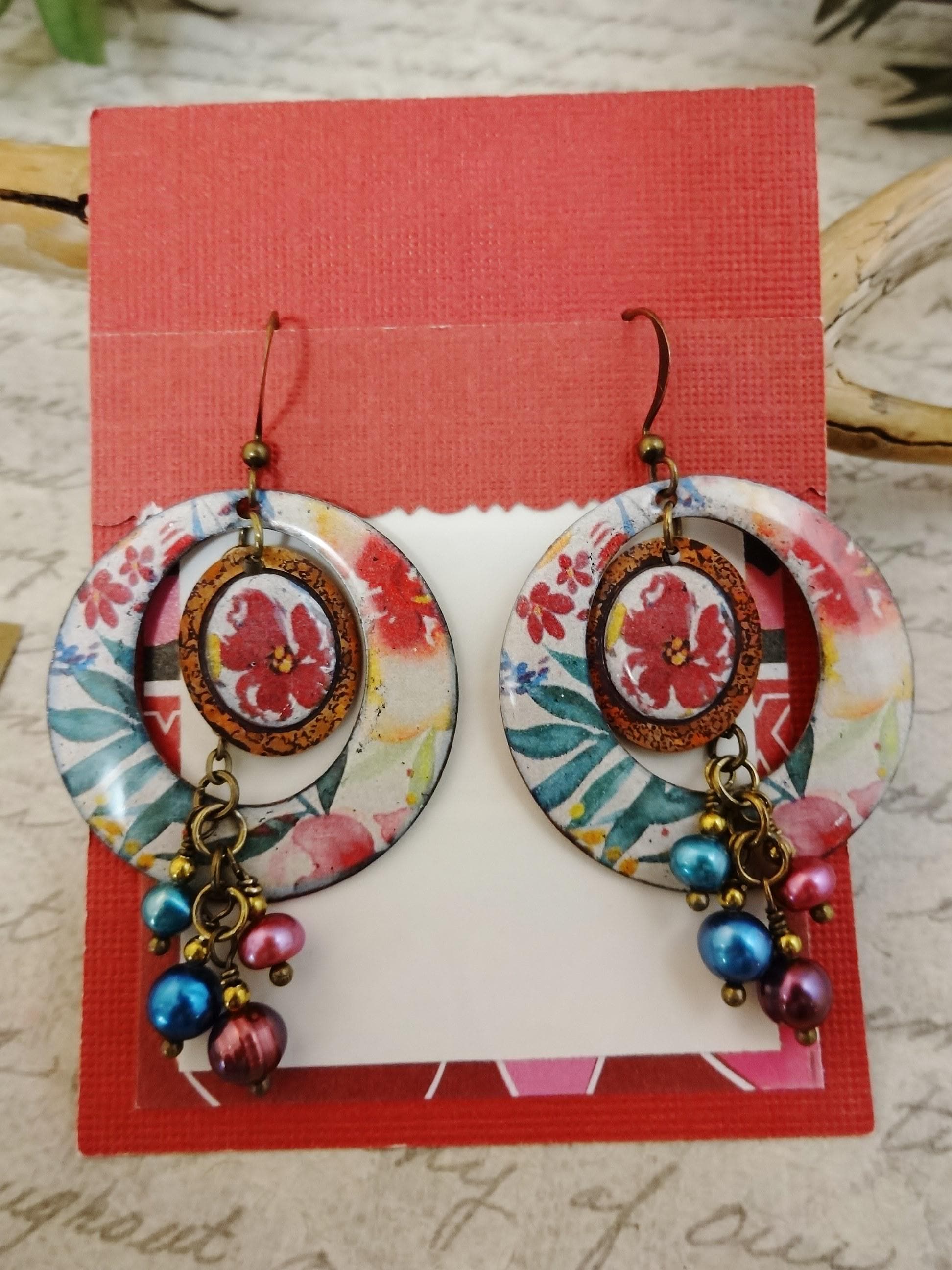 I kept the design very simple to highlight the enamels. I used antique brass jump rings and ear wires to keep the rustic, vintage feel. Four pearls in rose and aqua dangle from a chain behind the inner oval spilling over the bottom of the outer oval.