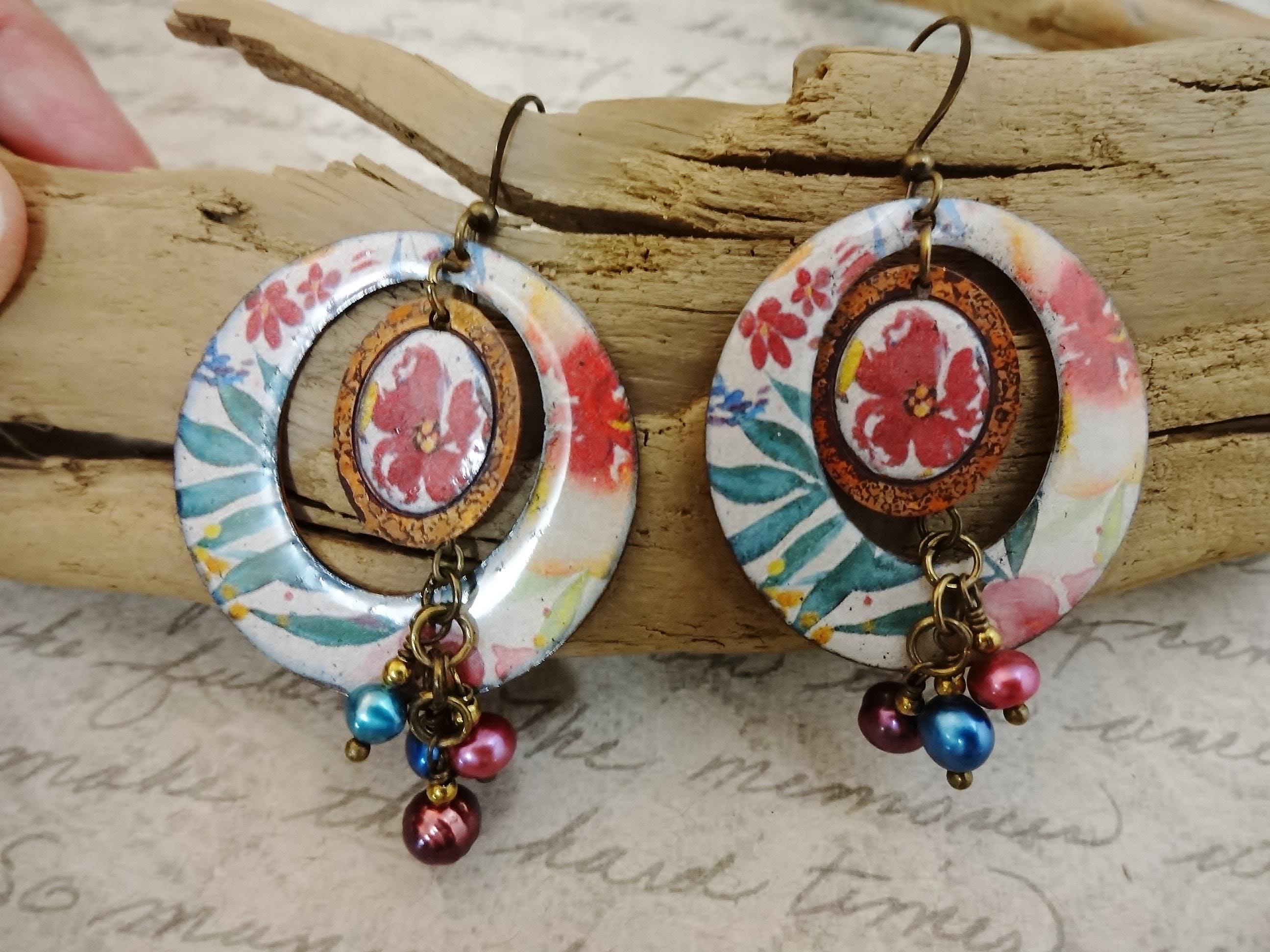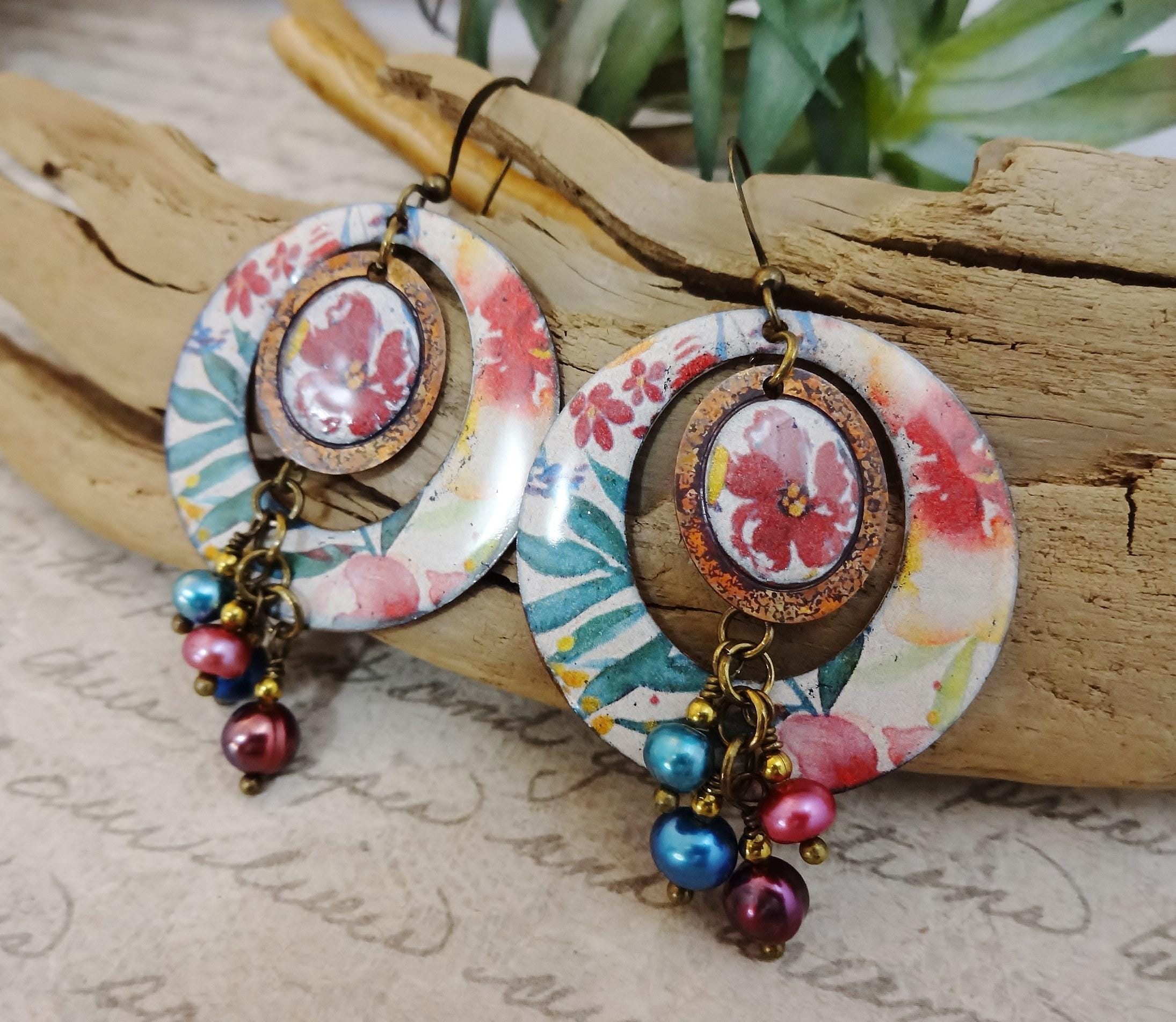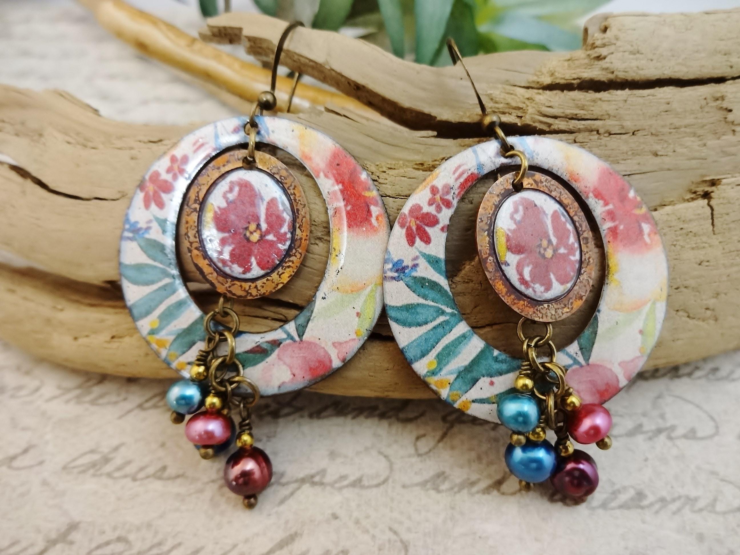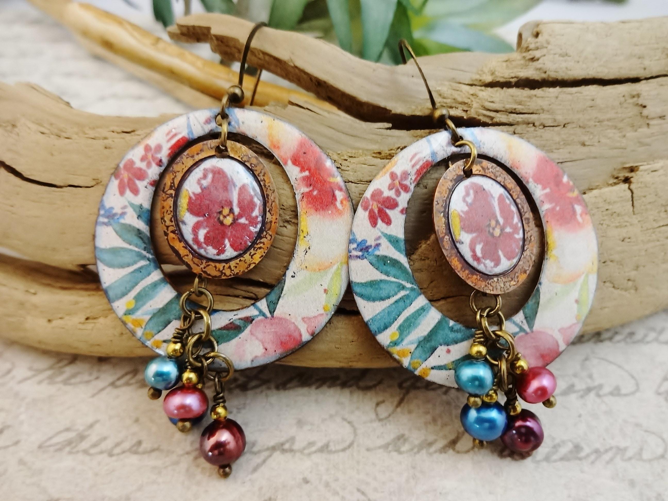 I kept the design very simple to highlight the enamels. I used antique brass jump rings and ear wires to keep the rustic, vintage feel. Four pearls in rose and aqua dangle from a chain behind the inner oval spilling over the bottom of the outer oval.