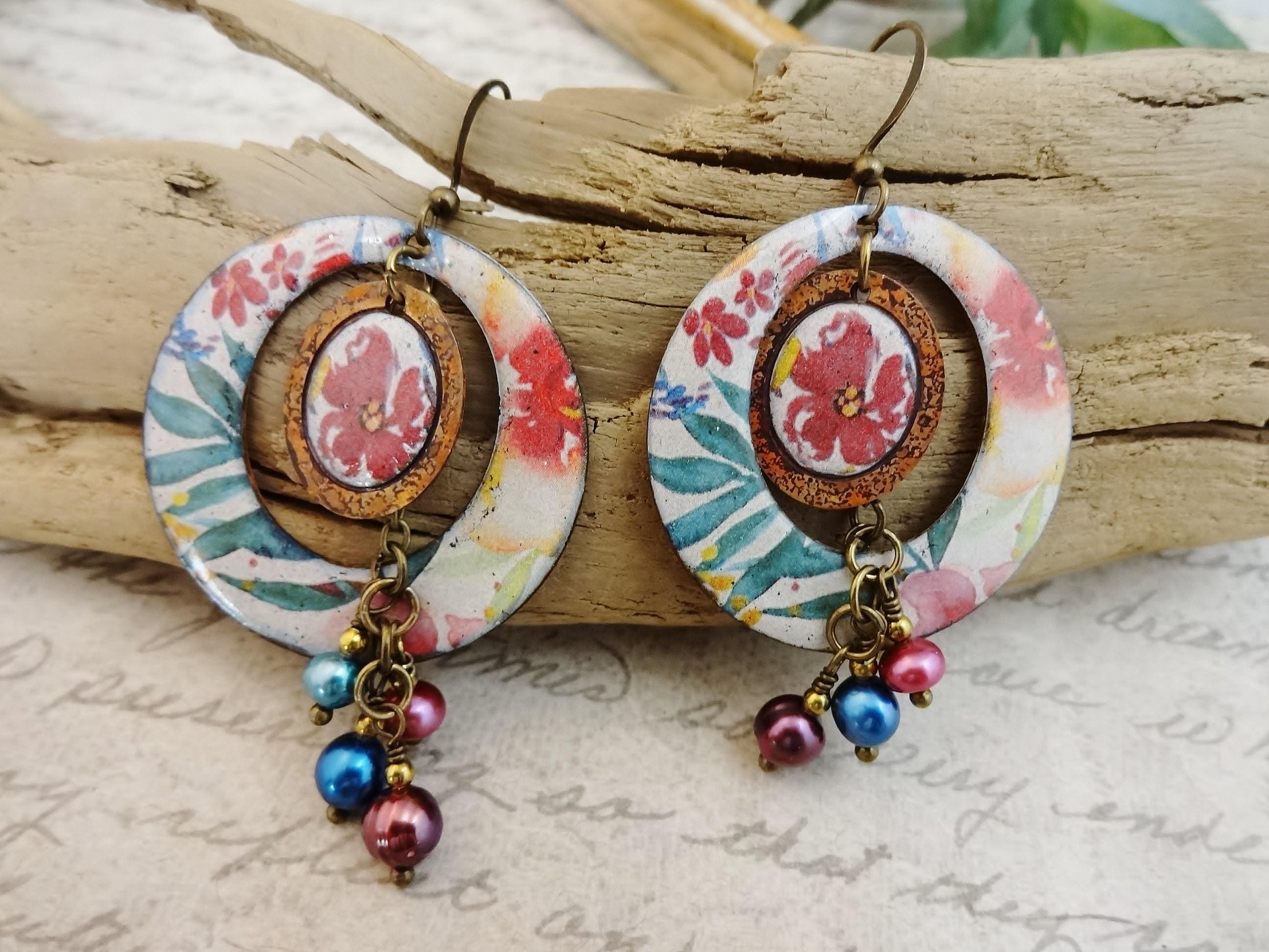 Artisan Enamel and Pearl Earrings, Red and Blue One of a Kind Artisan Earrings, Handmade Earrings, Gift for Her, French Enamels