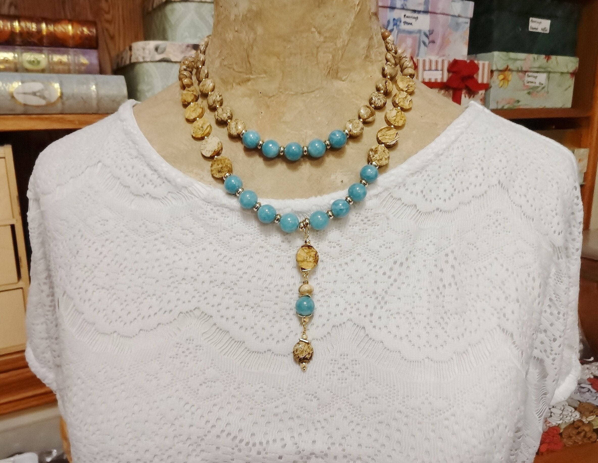The pendant on the longer necklace features more Picture Jasper coins and rondelles, and Angelite 8mm rounds.