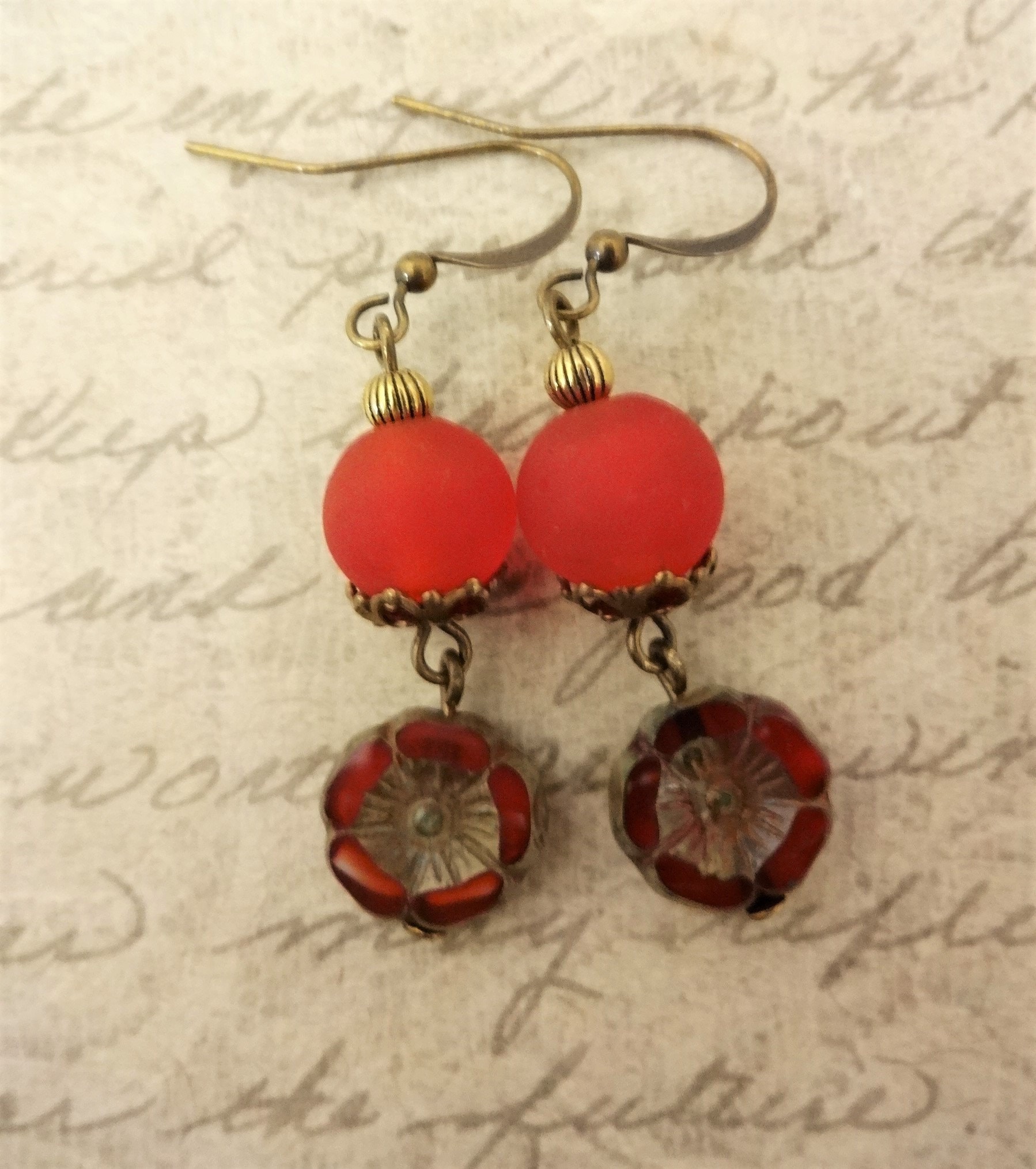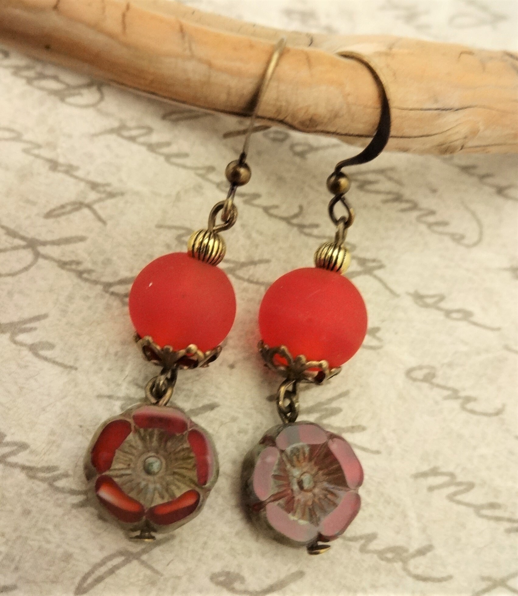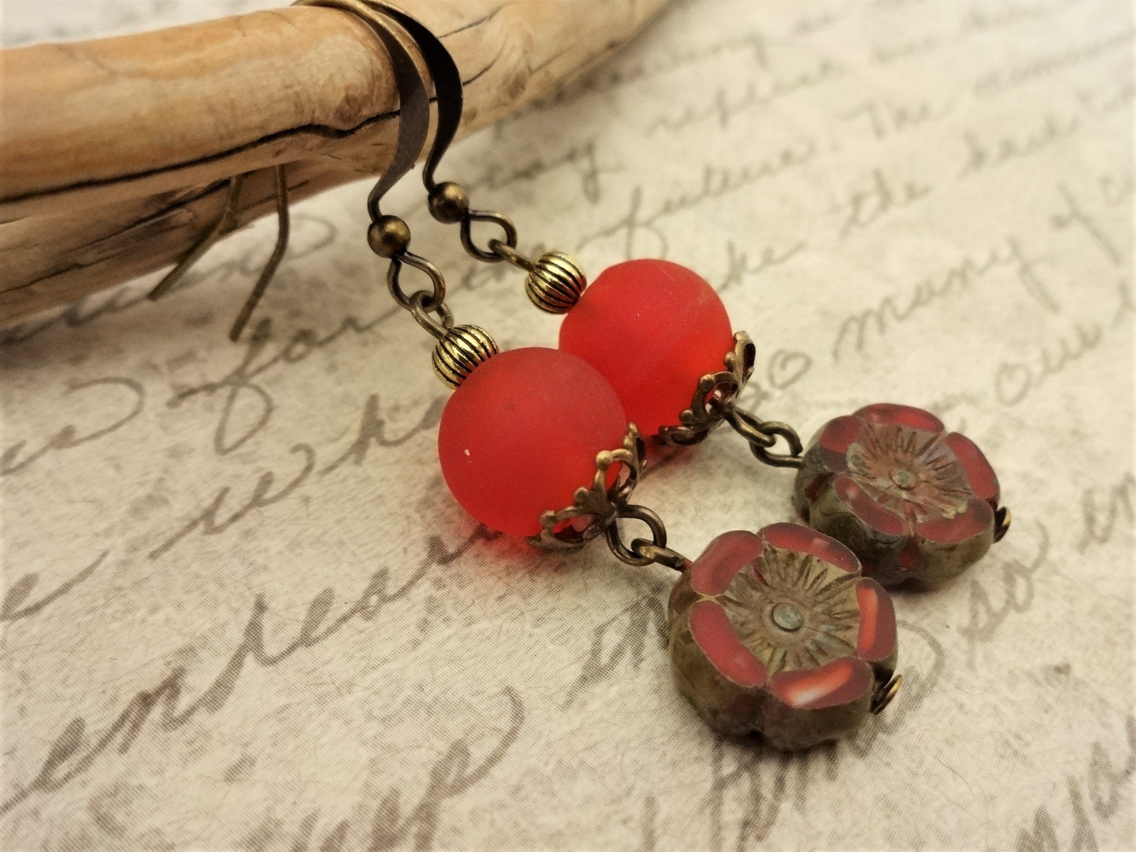 These striking earrings feature 16mm round Red Lampwork Glass beads seated in scalloped antique brass beadcaps. Dangling below are Garnet red Czech Glass Hawaiin flowers. Antique brass spacer beads and wire enhance the vintage vibe.