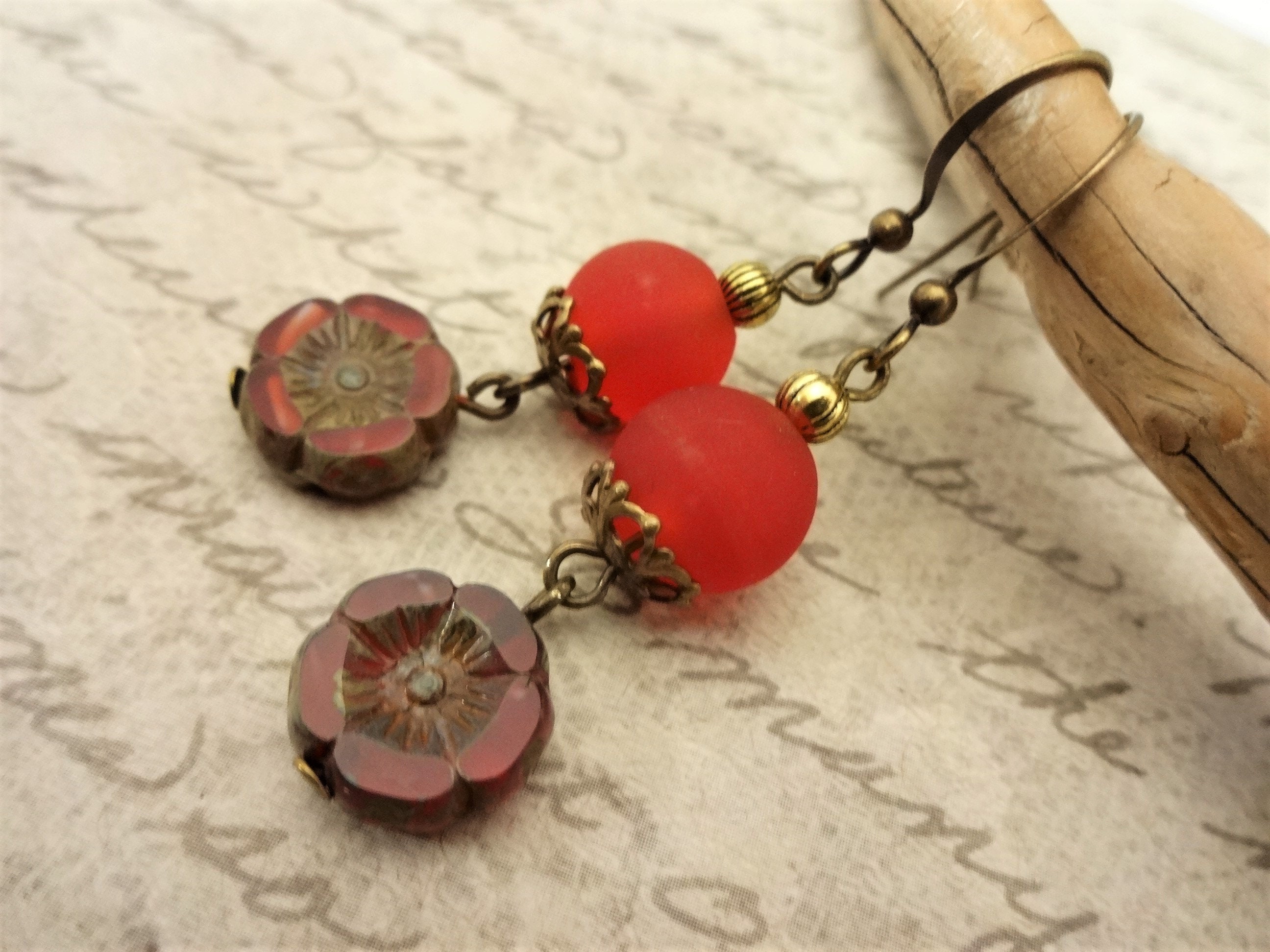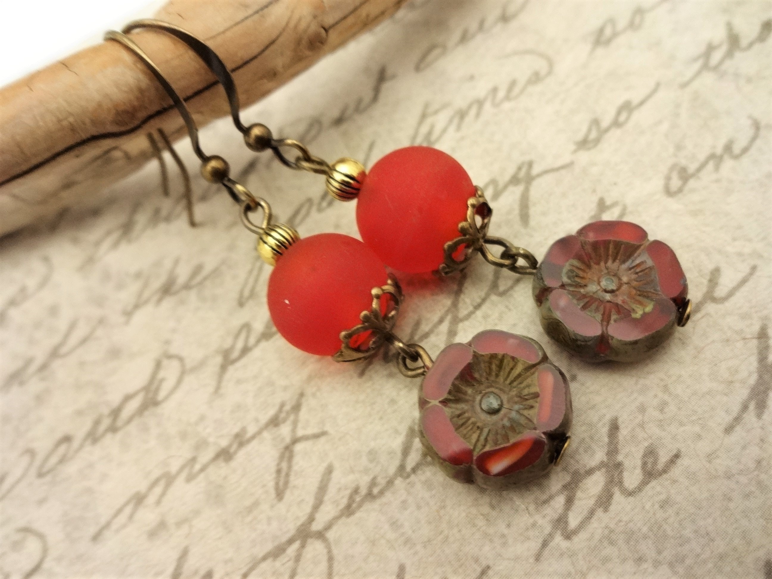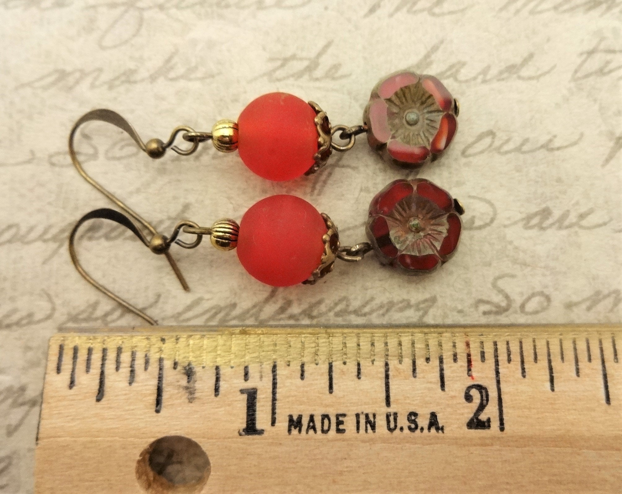 These striking earrings feature 16mm round Red Lampwork Glass beads seated in scalloped antique brass beadcaps. Dangling below are Garnet red Czech Glass Hawaiin flowers. Antique brass spacer beads and wire enhance the vintage vibe.