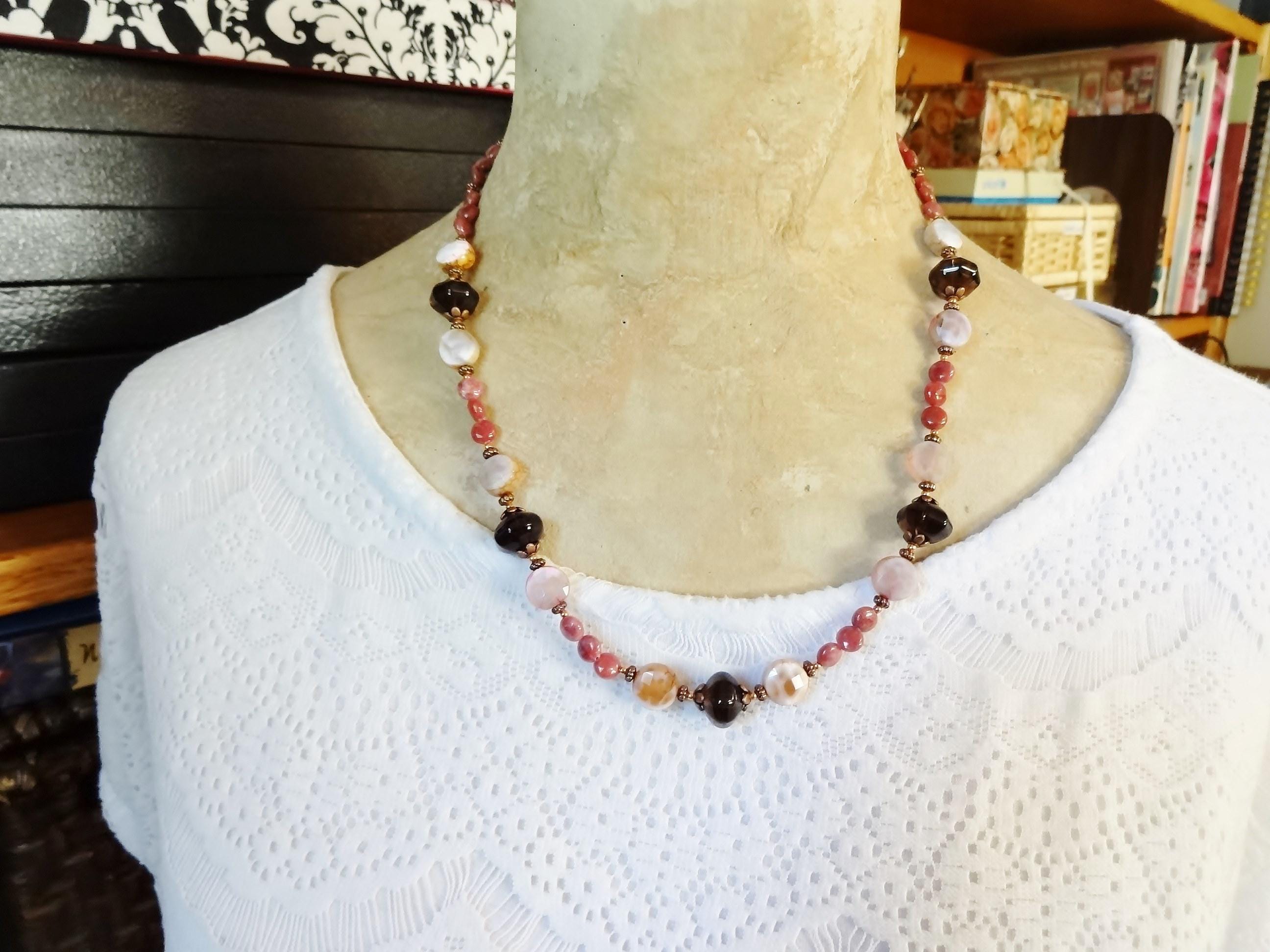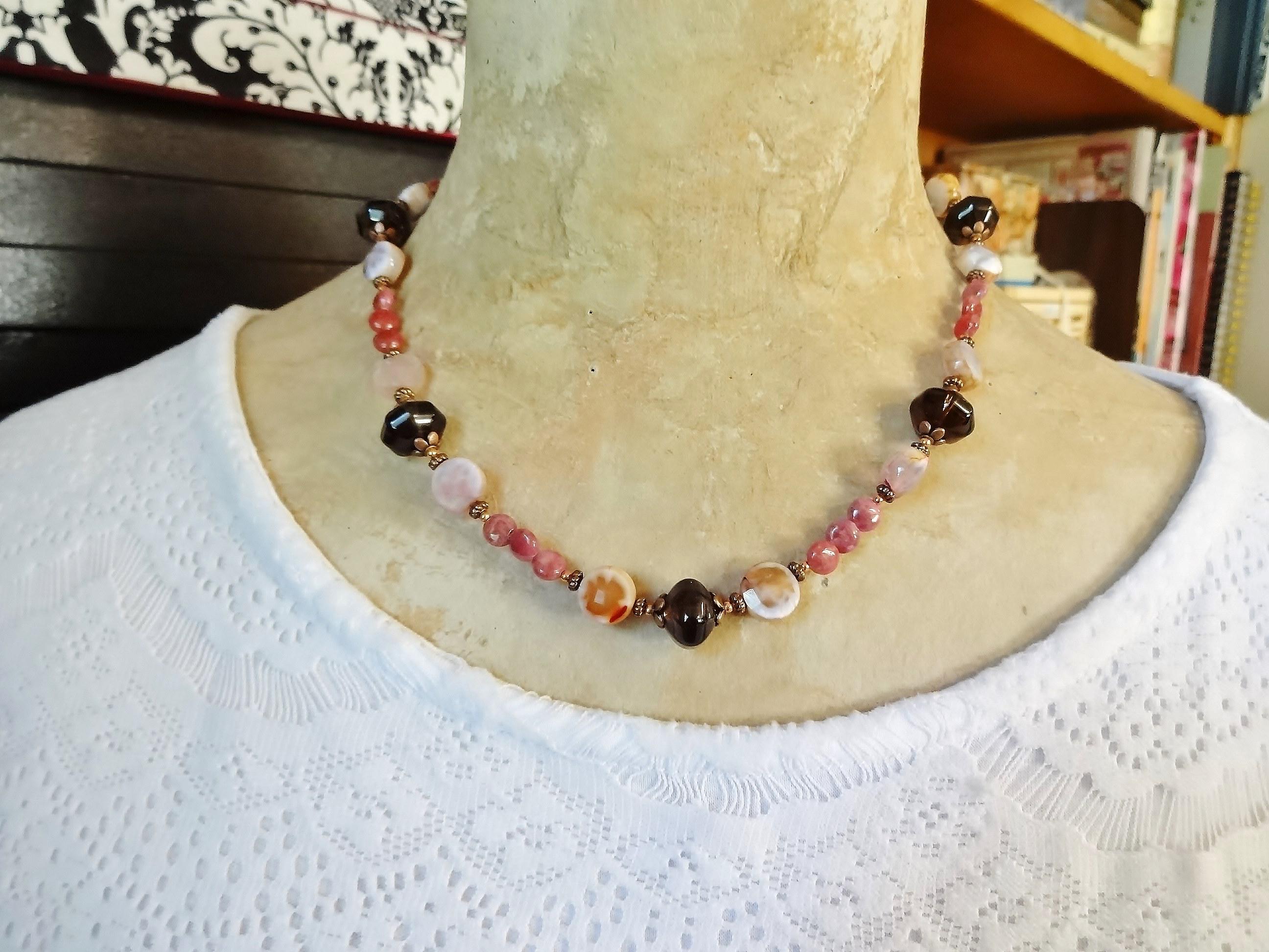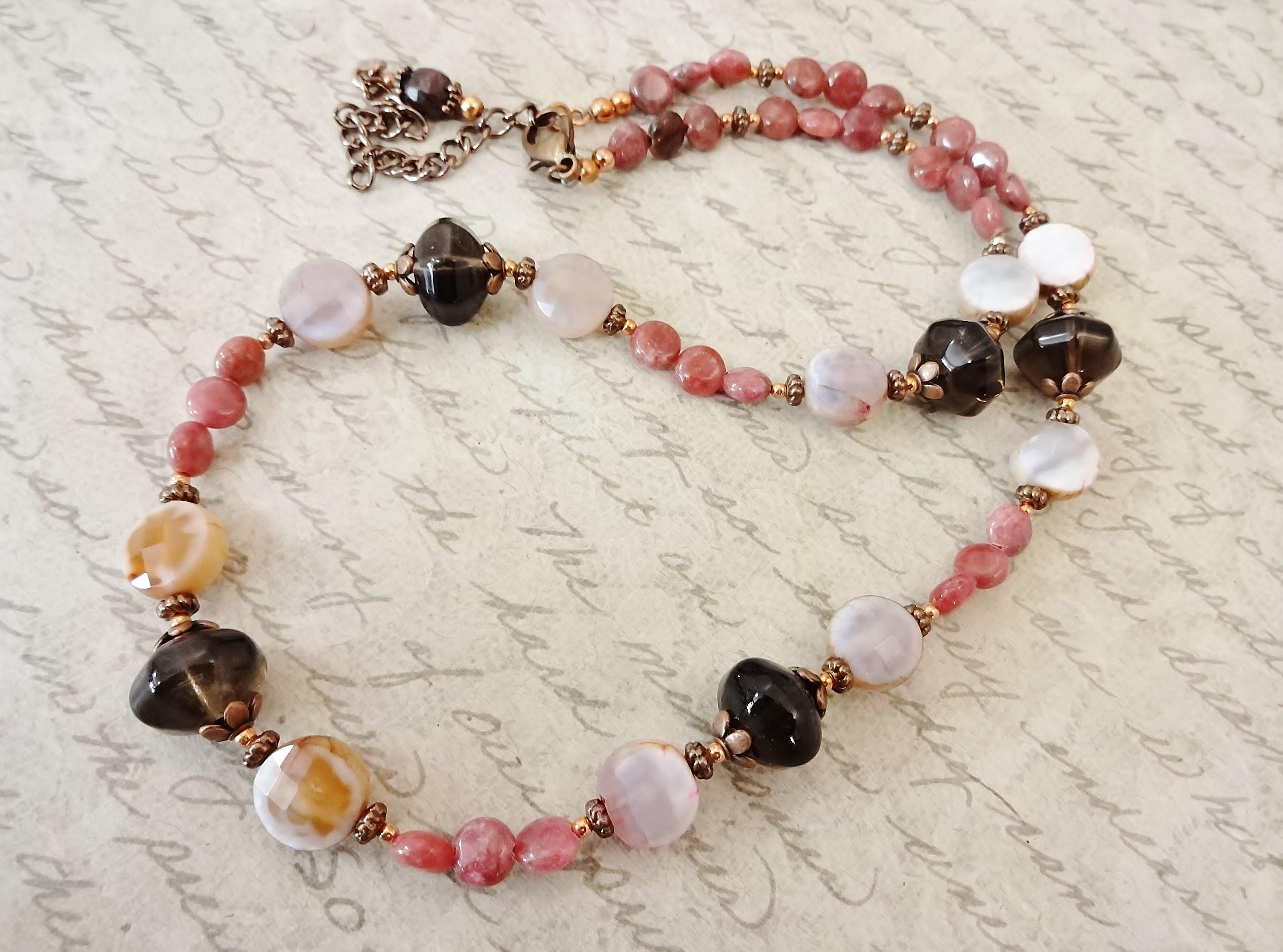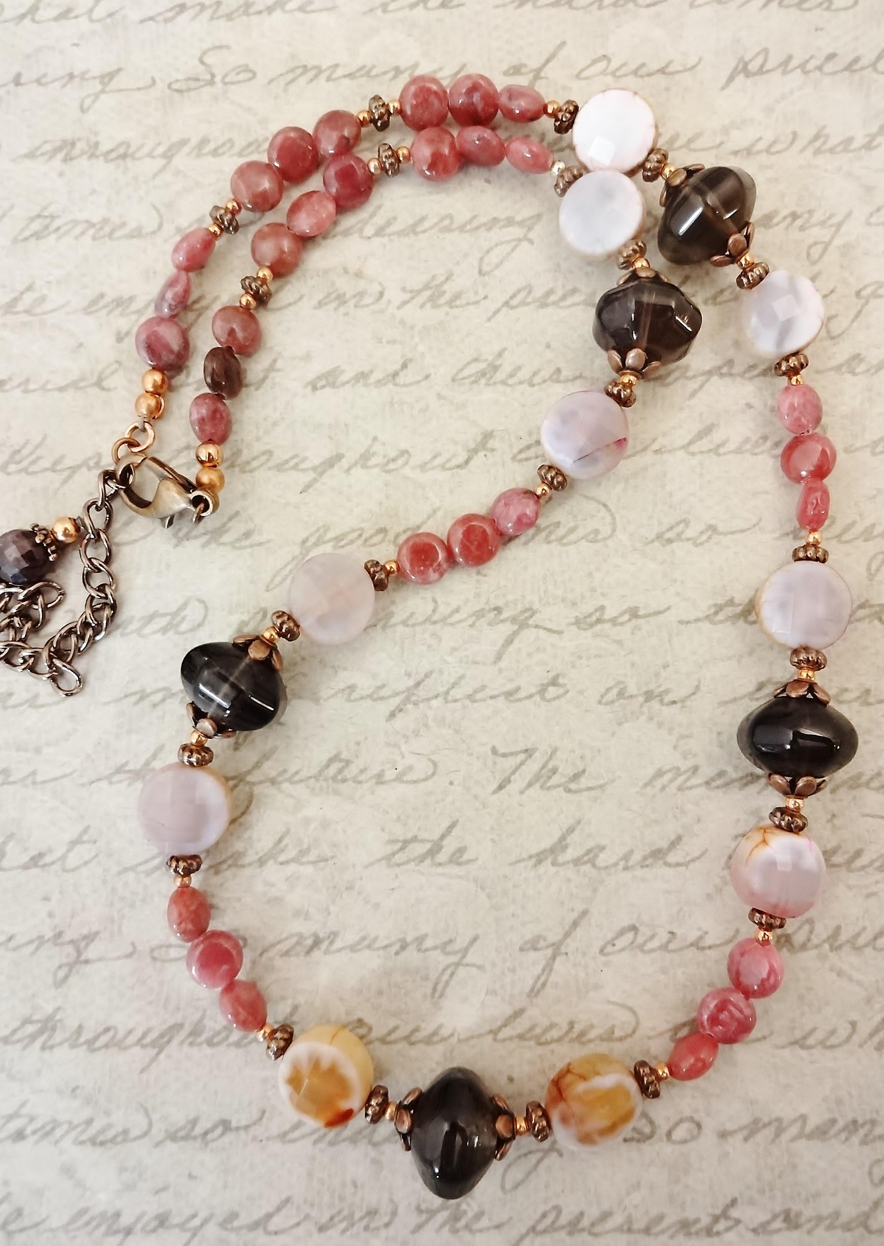 The necklace features lantern shaped Smoky Quartz set between antique copper flower bead caps. On either side of the quartz are faceted coin shaped Pink Crackle Agates nestled between antique copper spacers. Between each of these sections and finishing the necklace are tiny 4-5mm coins of Rhodonite in a deep rose.