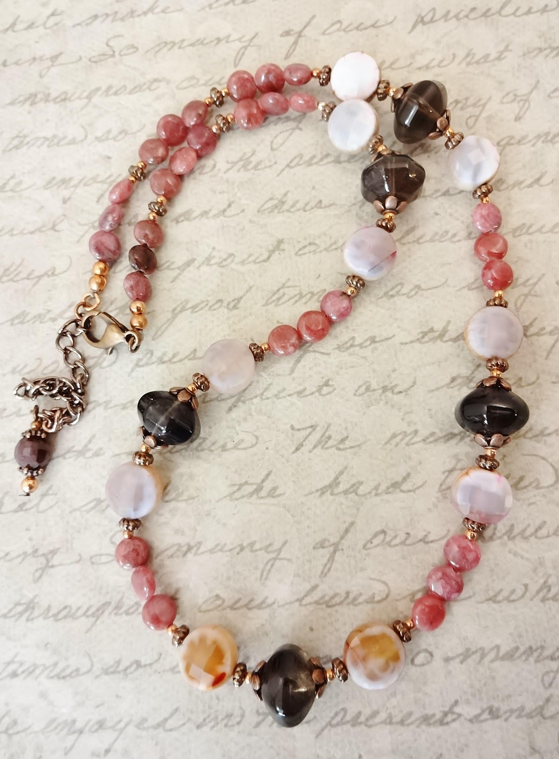 Rhodonite, Smoky Quartz, Pink Crackle Agate: Gemstone Necklace and Earring Set, Eclectic Gemstone Jewelry, Gift for Her