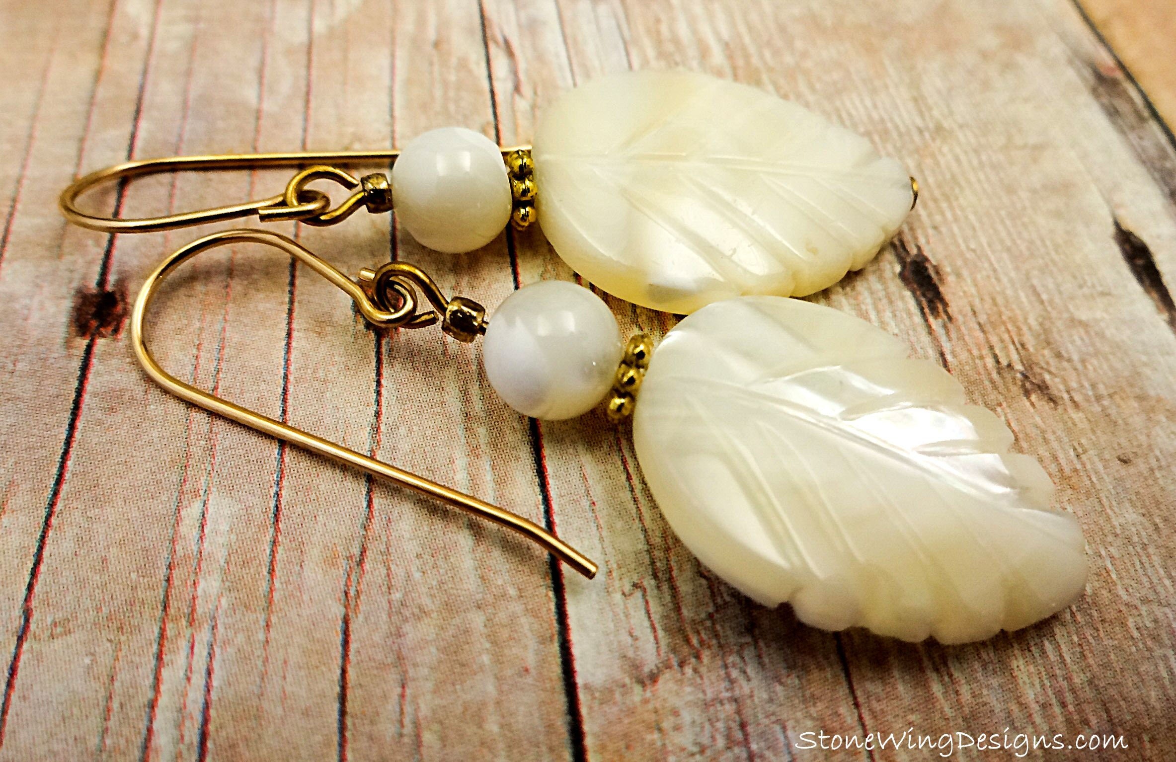 These earrings feature large Mother-of-Pearl Leaves topped with 6mm rounds.