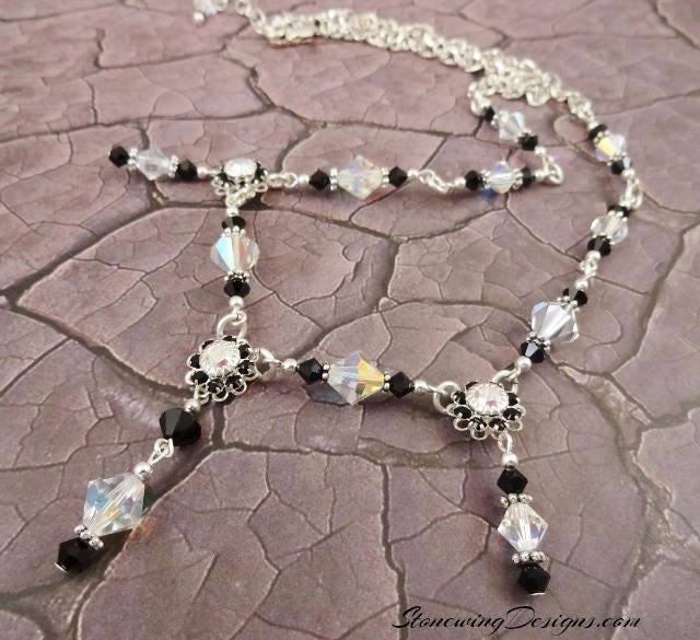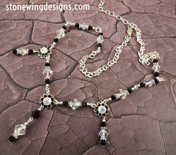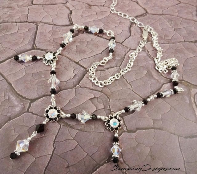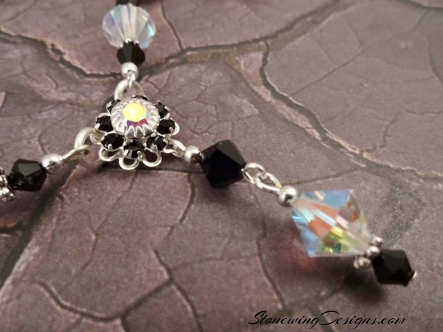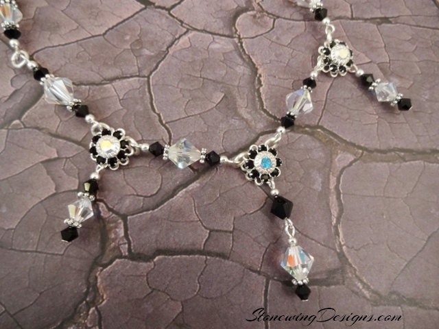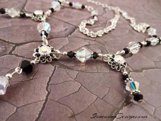 Each flower has a small drop of bicone crystals in Crystal AB and Jet. They're connected by crystal links with small Jet bicones (4mm) and a little larger Crystal AB bicone (6mm). Finished with a length of silver plated cable chain and a lobster clasp, you can easily adjust the length depending on your neckline.