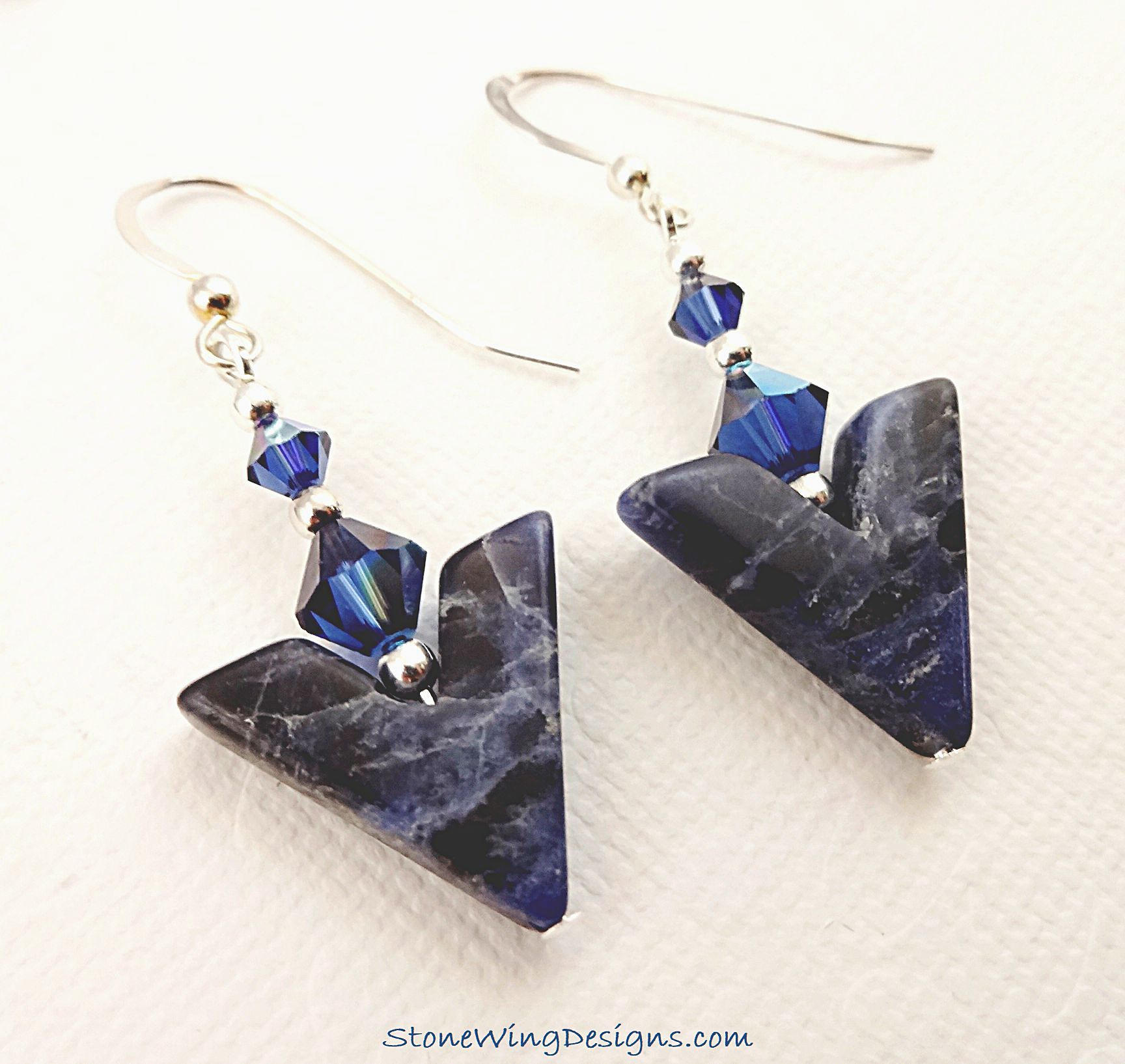 These earring feature Sodalite V's with a 6mm and 4mm Swarovski bicone nestled in the "vee". The 2.5mm spacer beads are Sterling Silver.