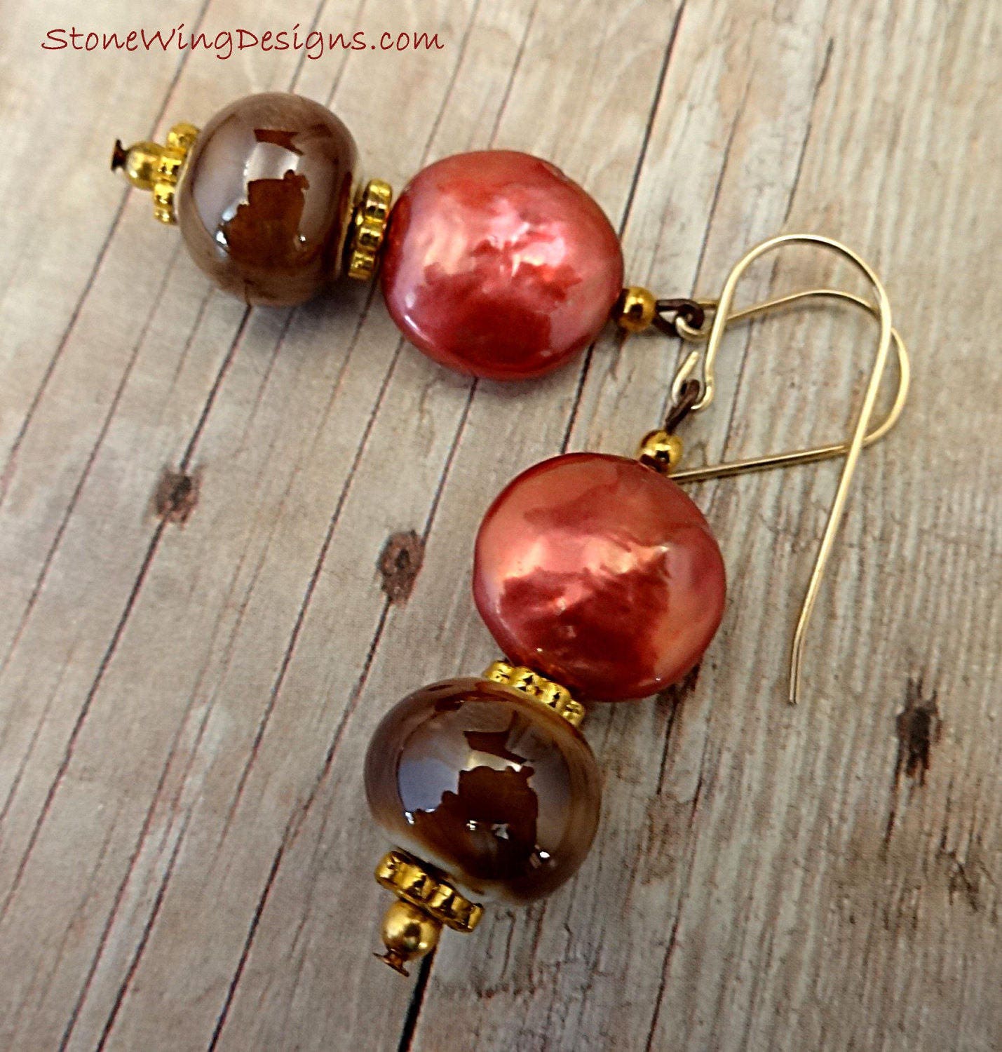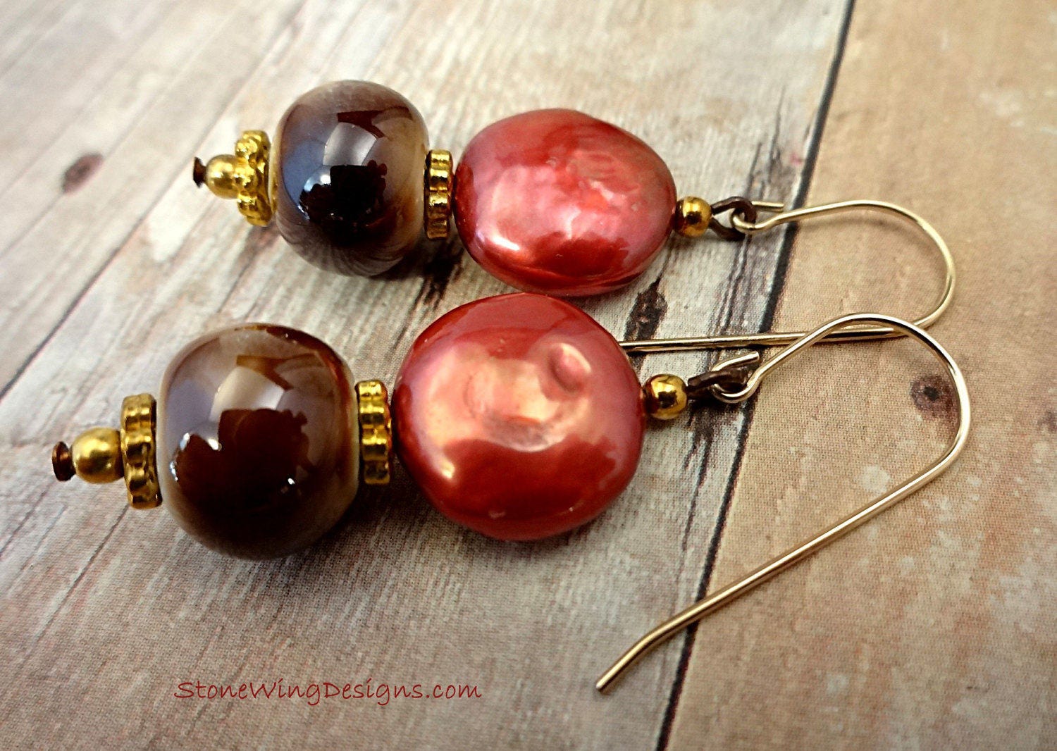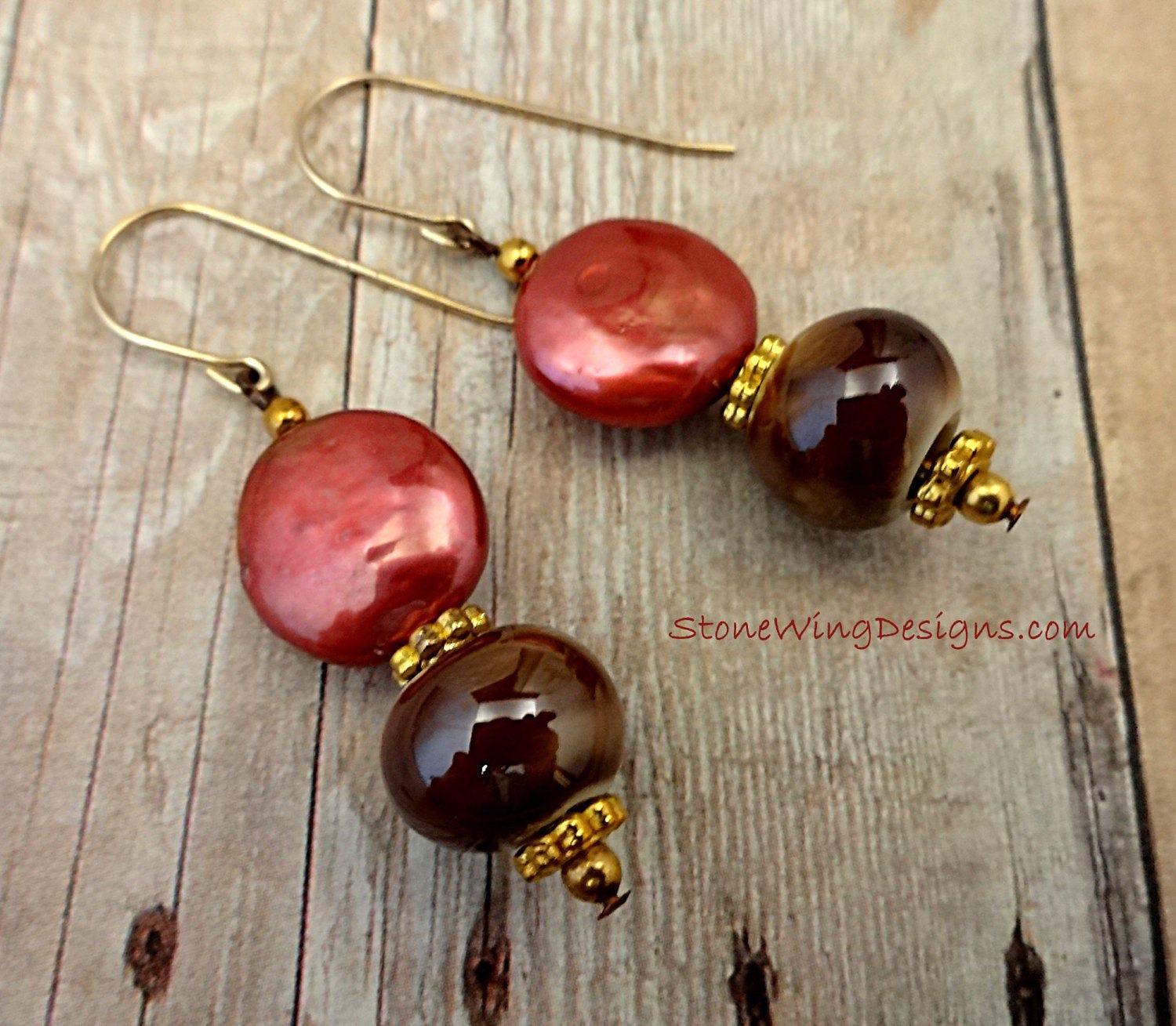 These eclectic earrings feature gorgeous berry-colored coin pearls with brown ceramic rondels.