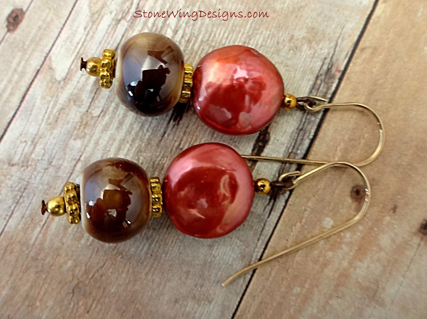 Red Coin Pearl and Ceramic Earrings on 14k Gold Fill Ear Wires