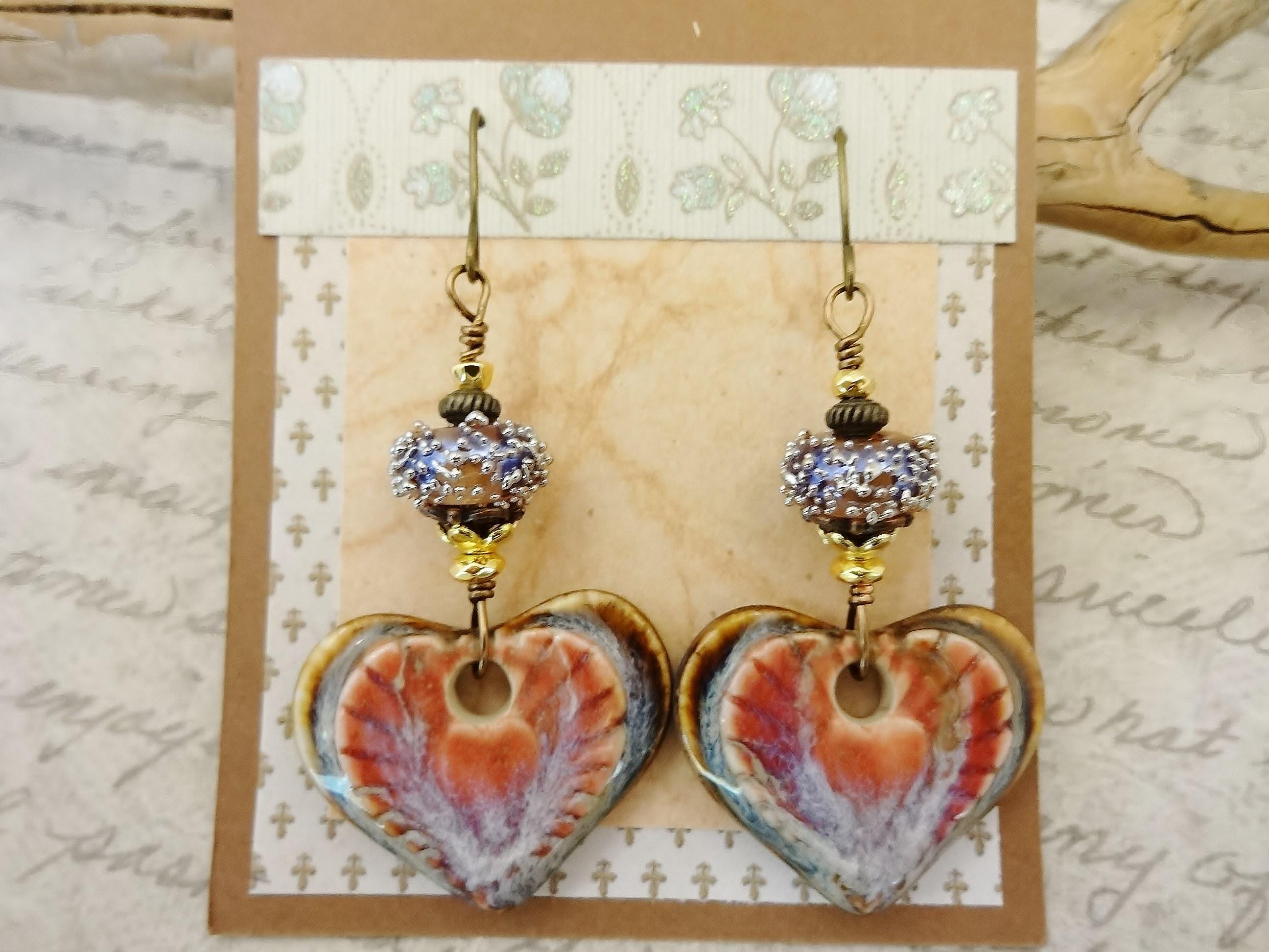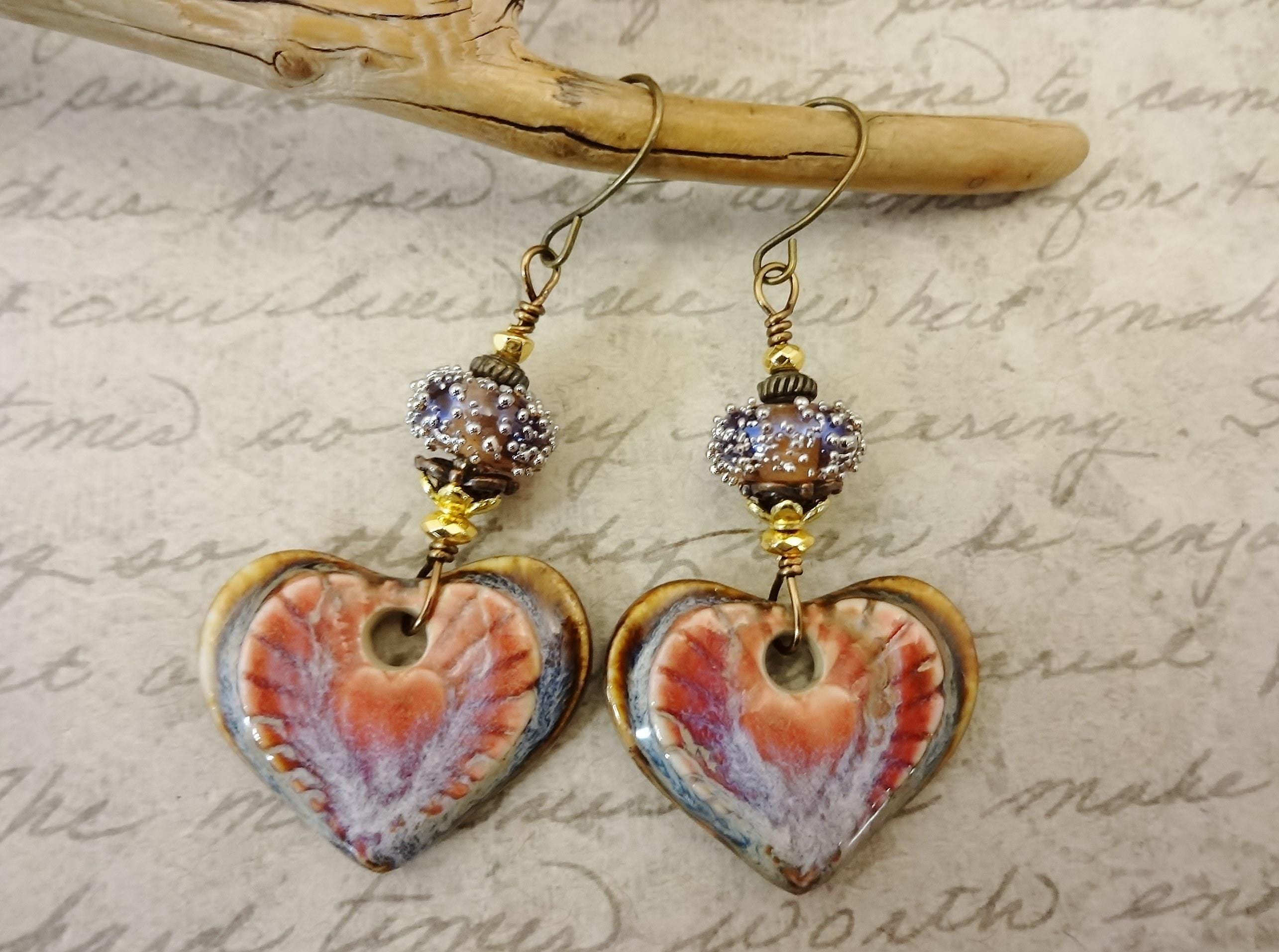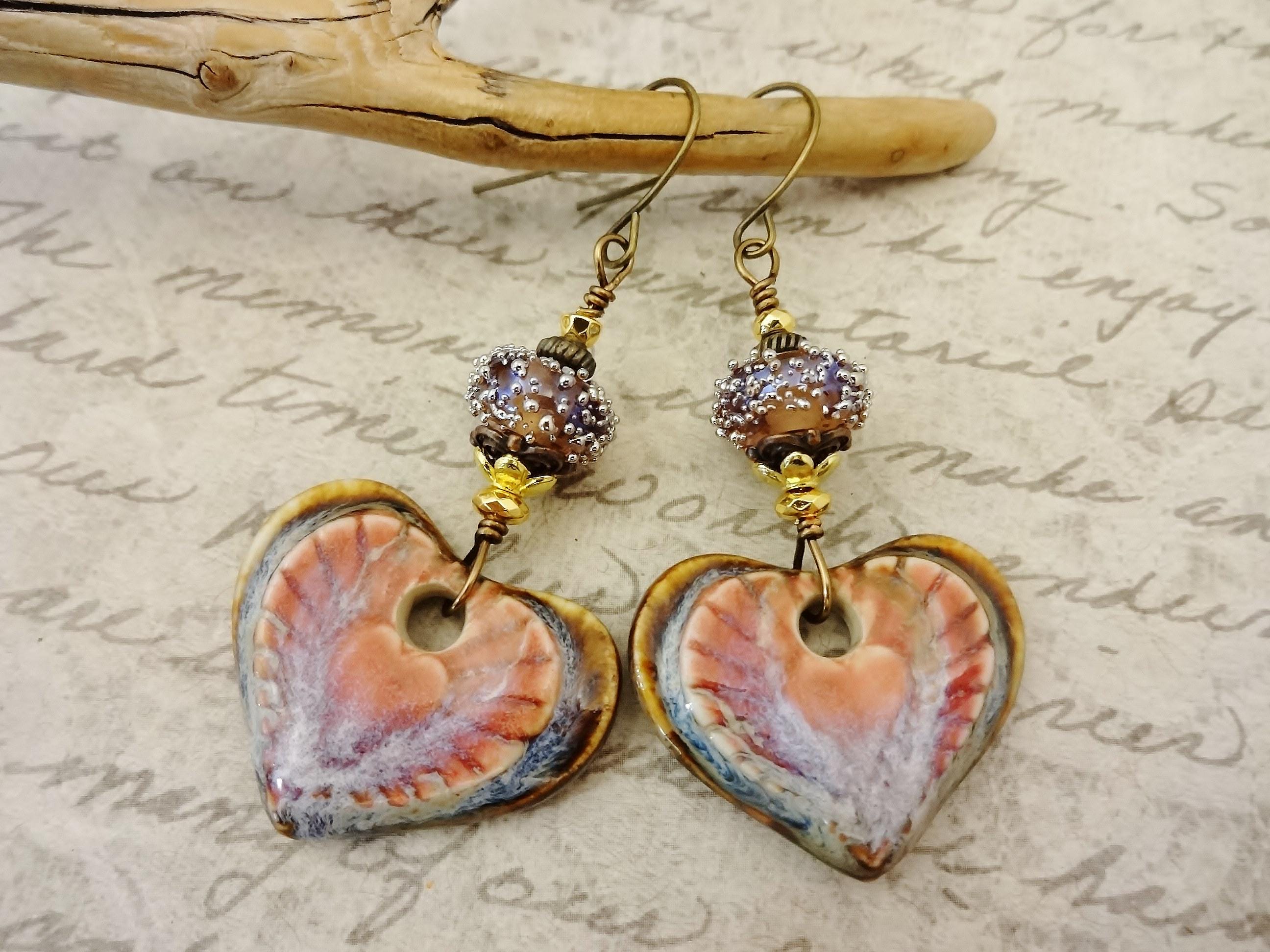 Gorgeous artisan Ceramic components by Mari Carmen Rodriguez Martinez of Majoyoal are the focal in these artisan earrings. Heart shaped in deep rose and brown with radiating lines of darker rose emanating from the center heart.
