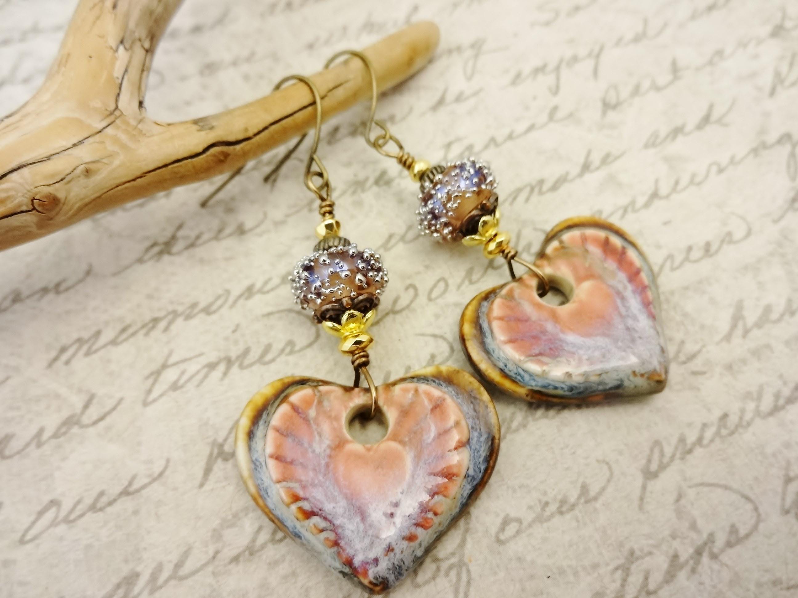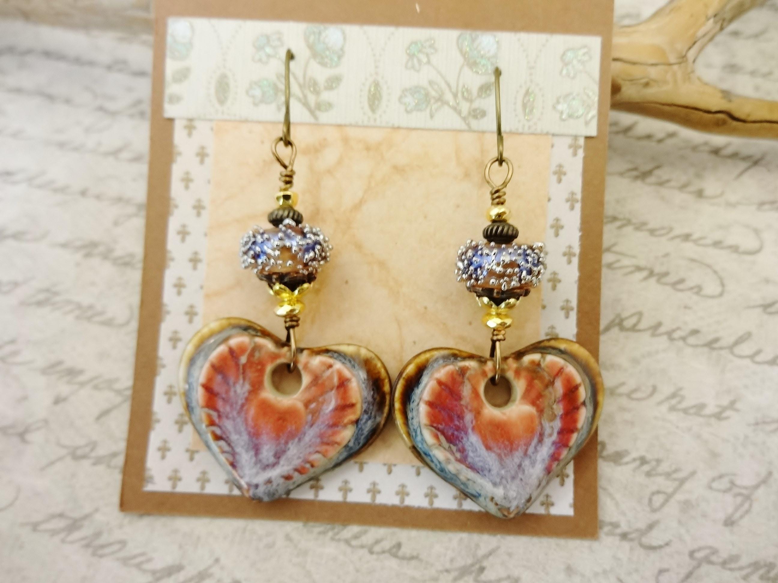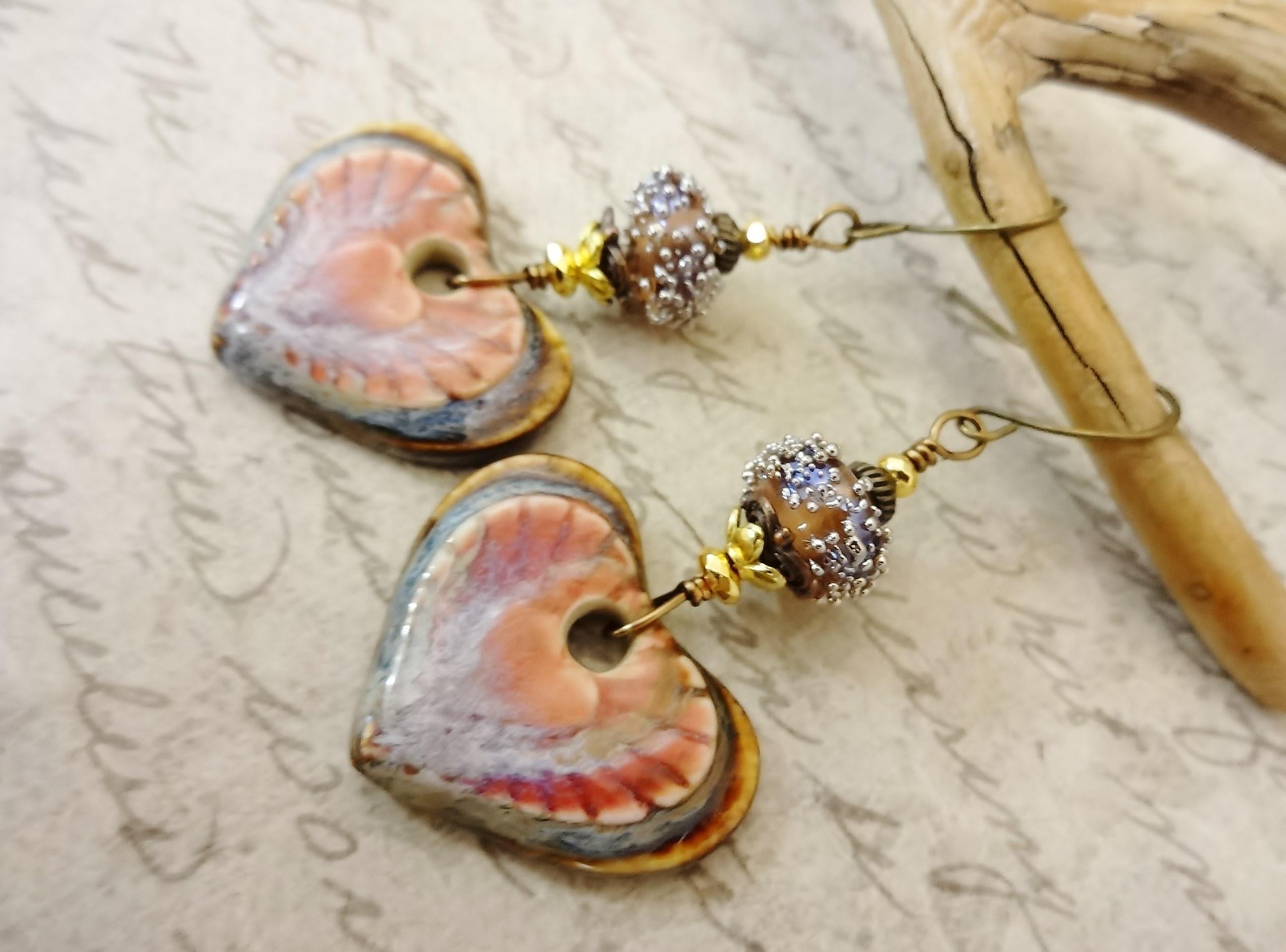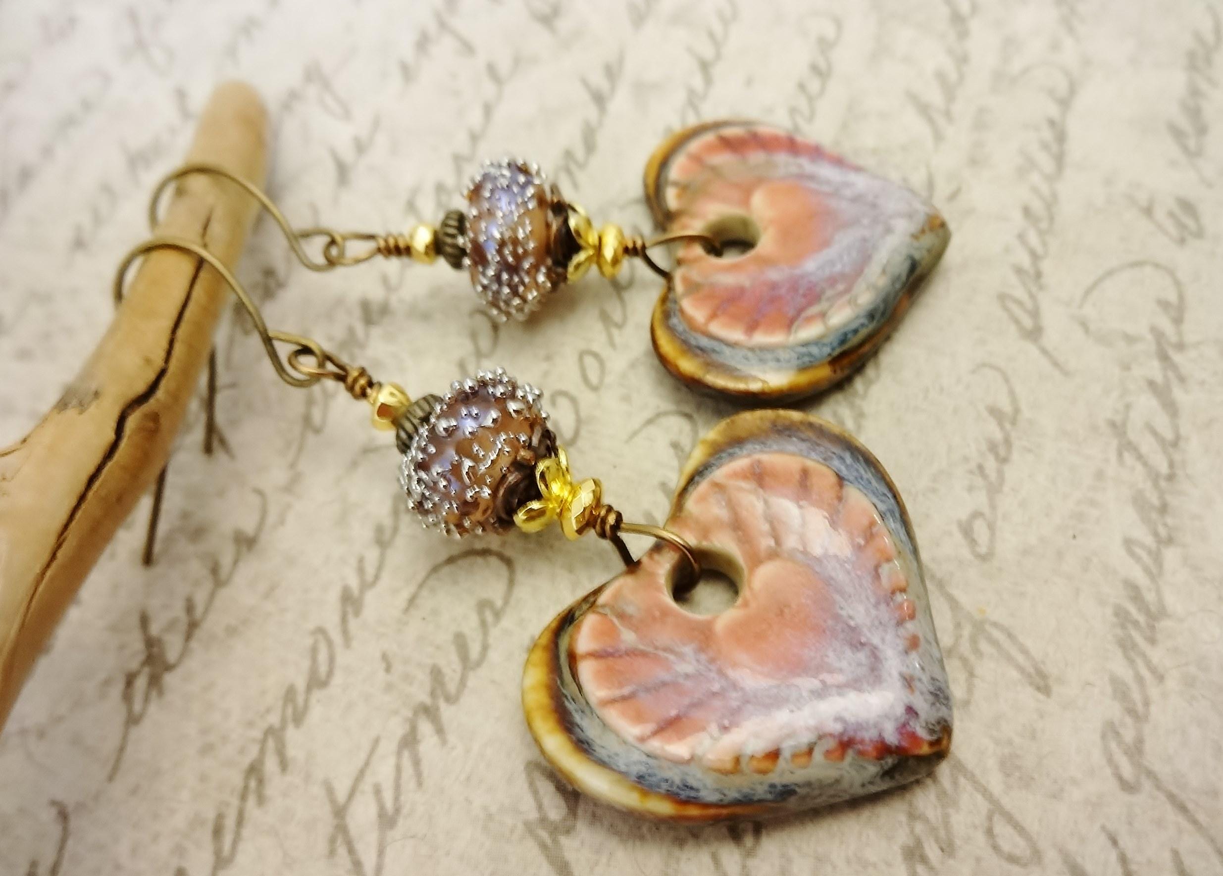 Gorgeous artisan Ceramic components by Mari Carmen Rodriguez Martinez of Majoyoal are the focal in these artisan earrings. Heart shaped in deep rose and brown with radiating lines of darker rose emanating from the center heart.