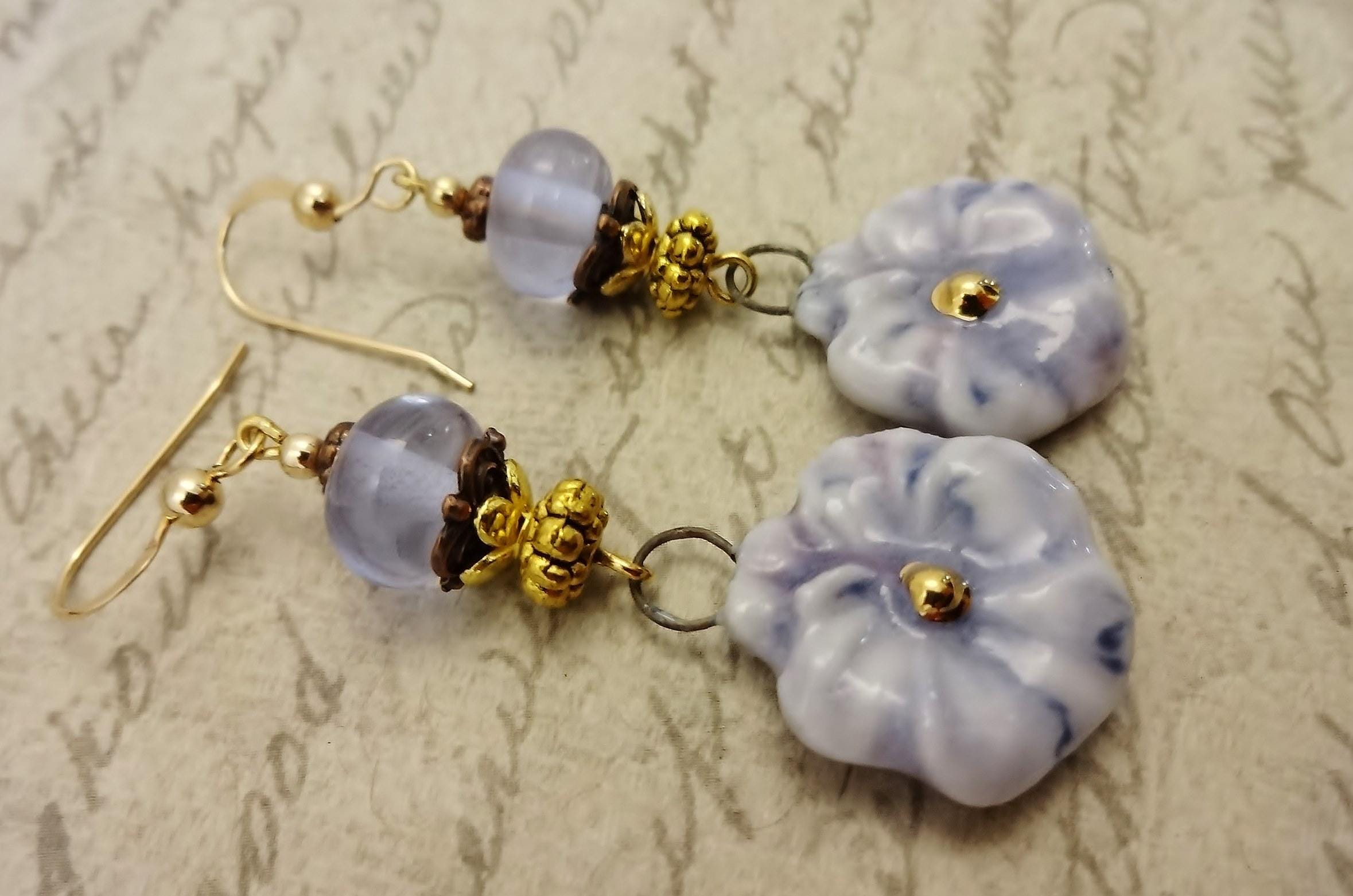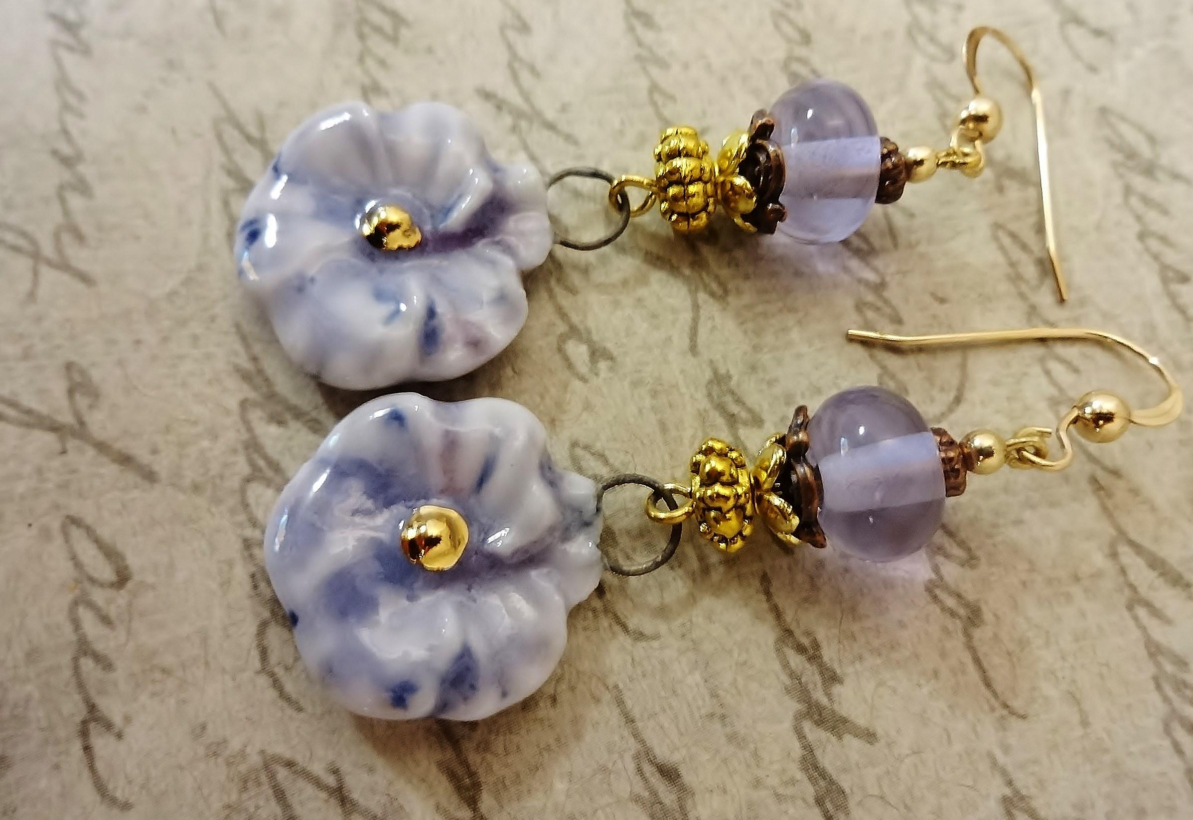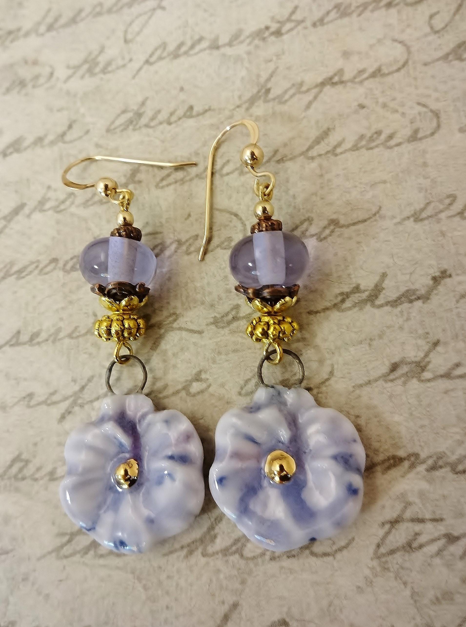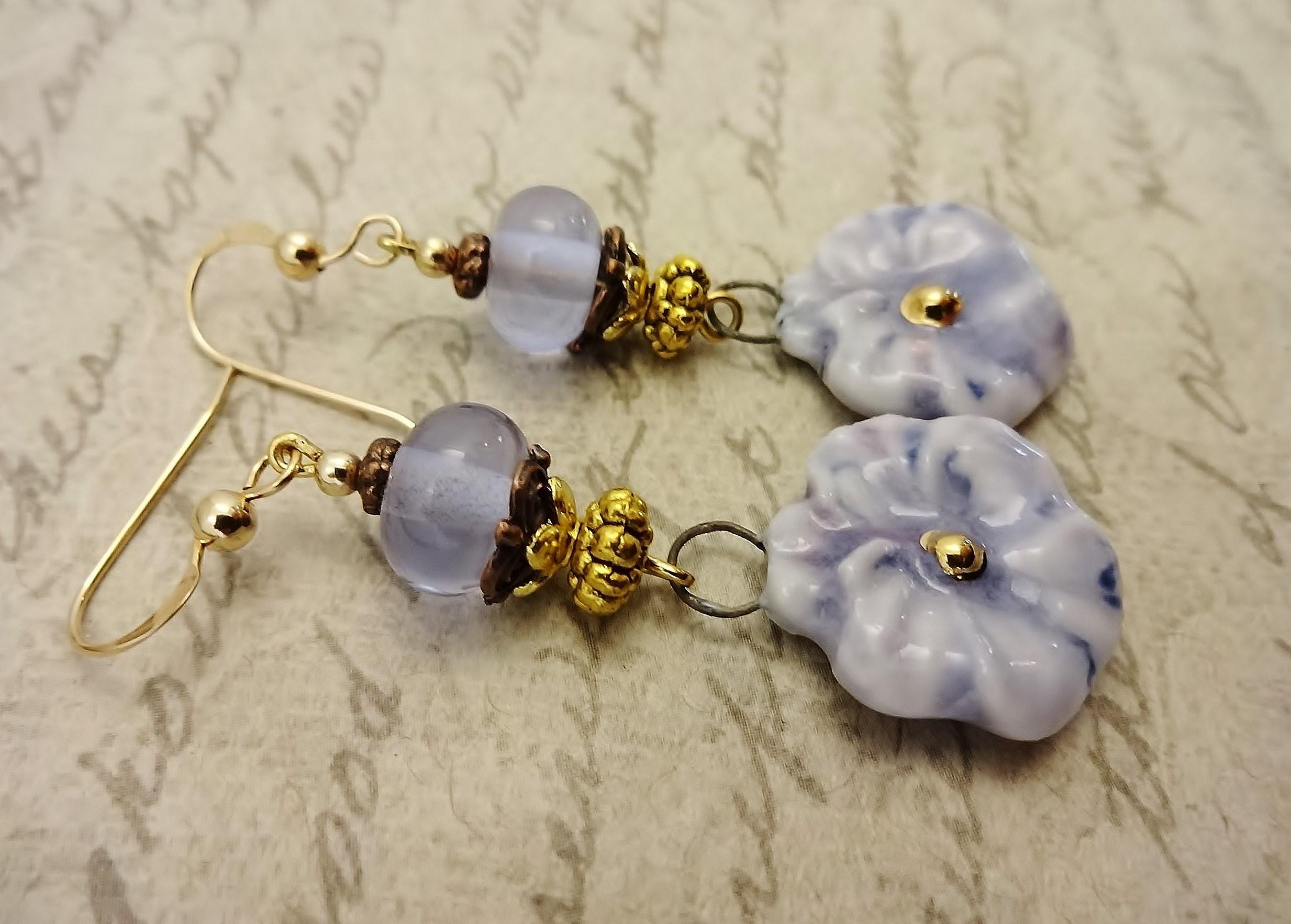 Shabby Chic Ceramic Flower Earrings: Lavender Lamp Glass, Artisan Made