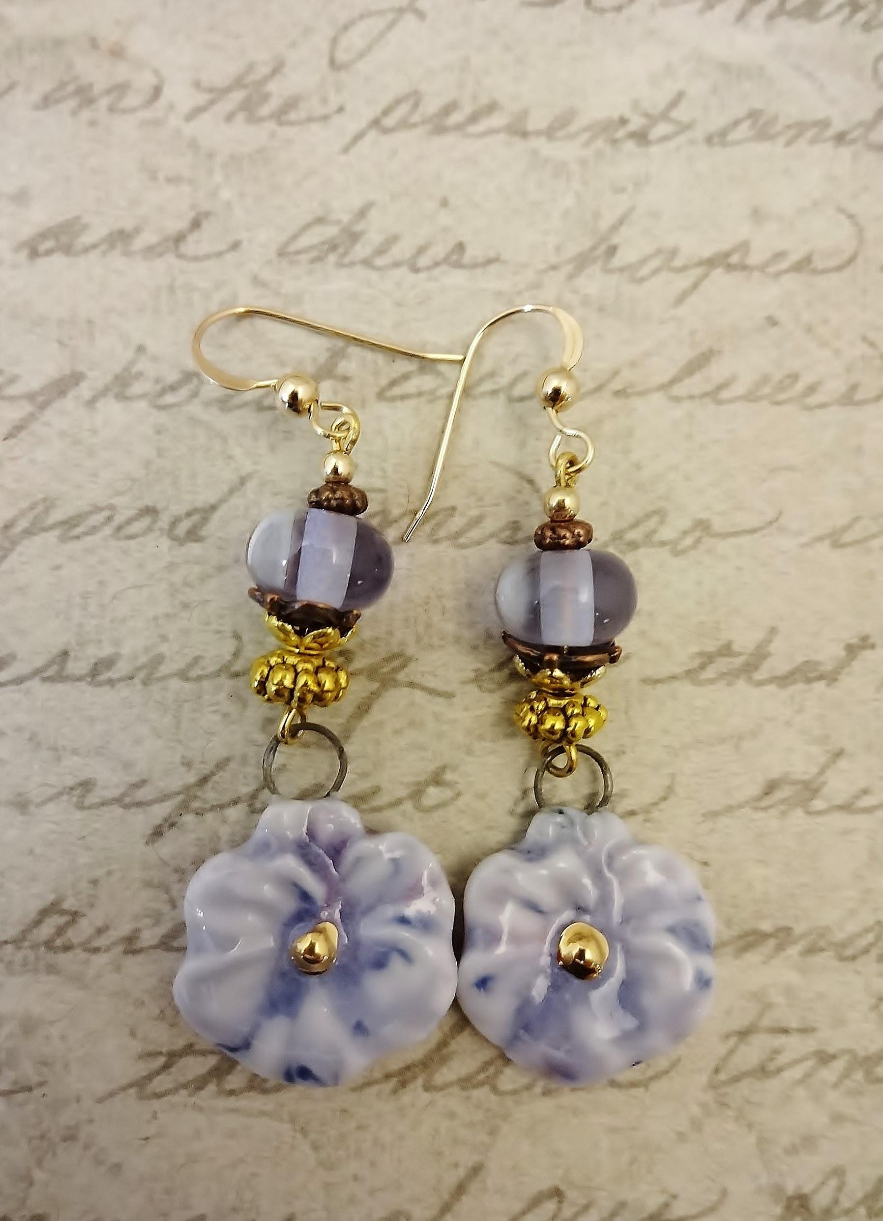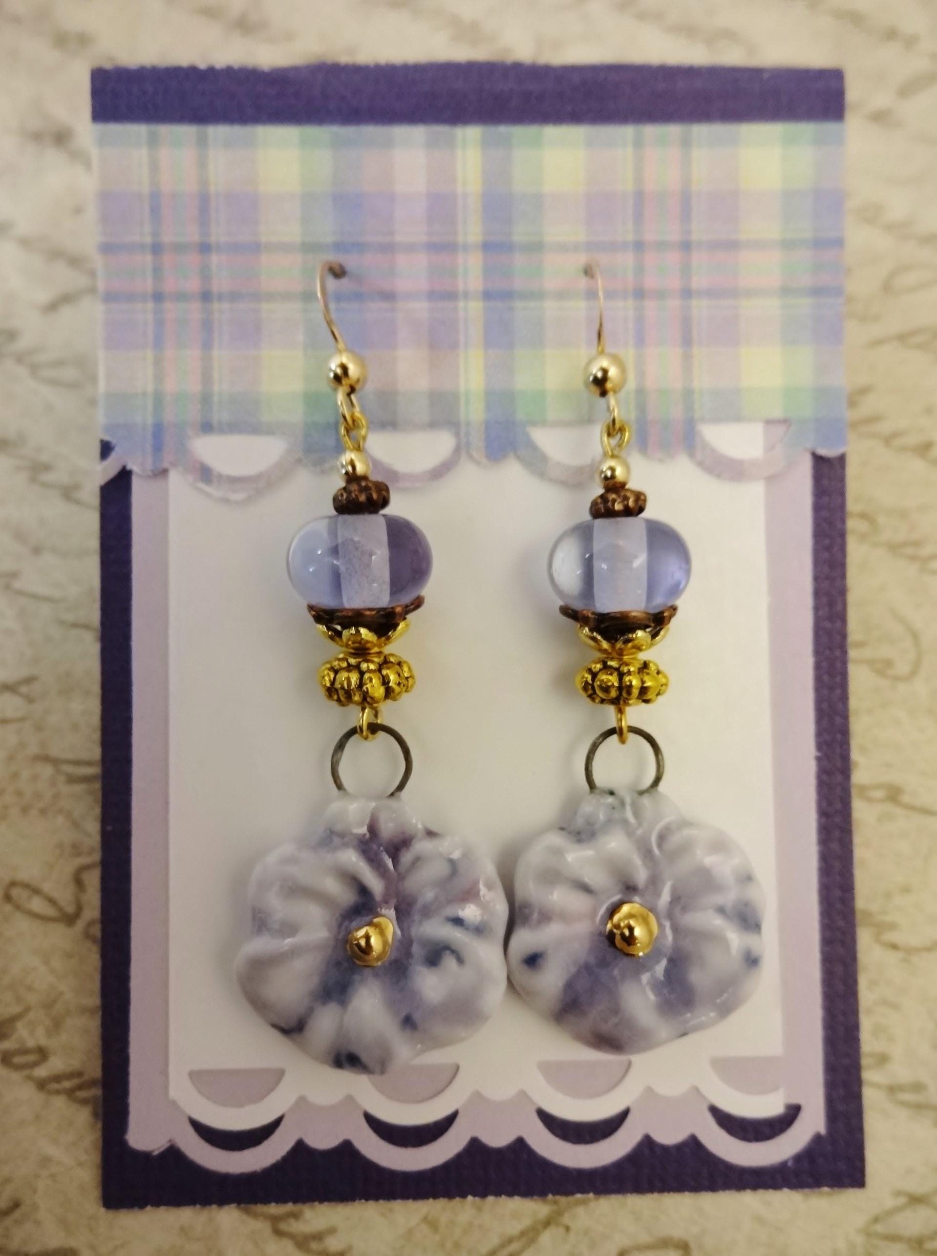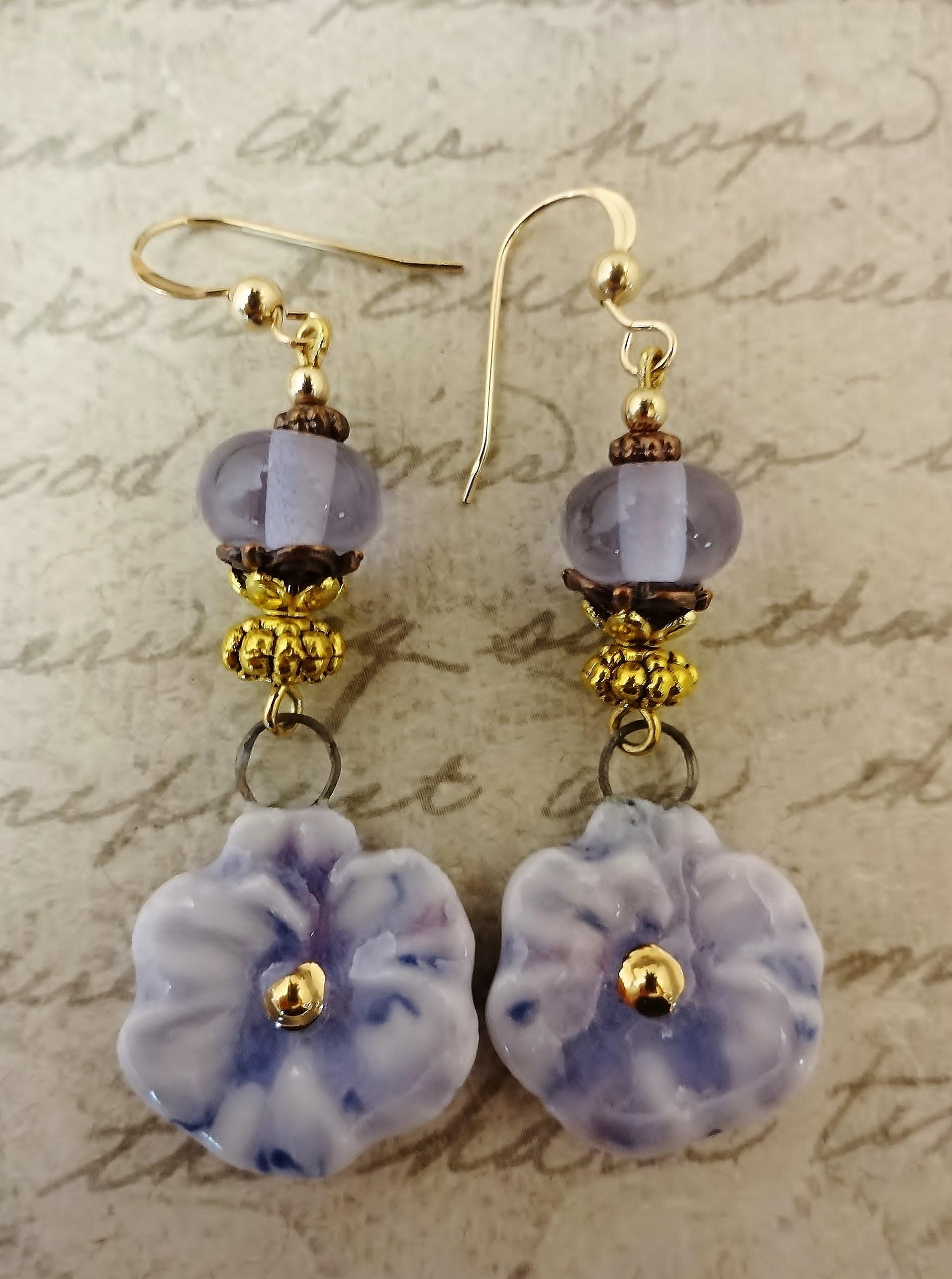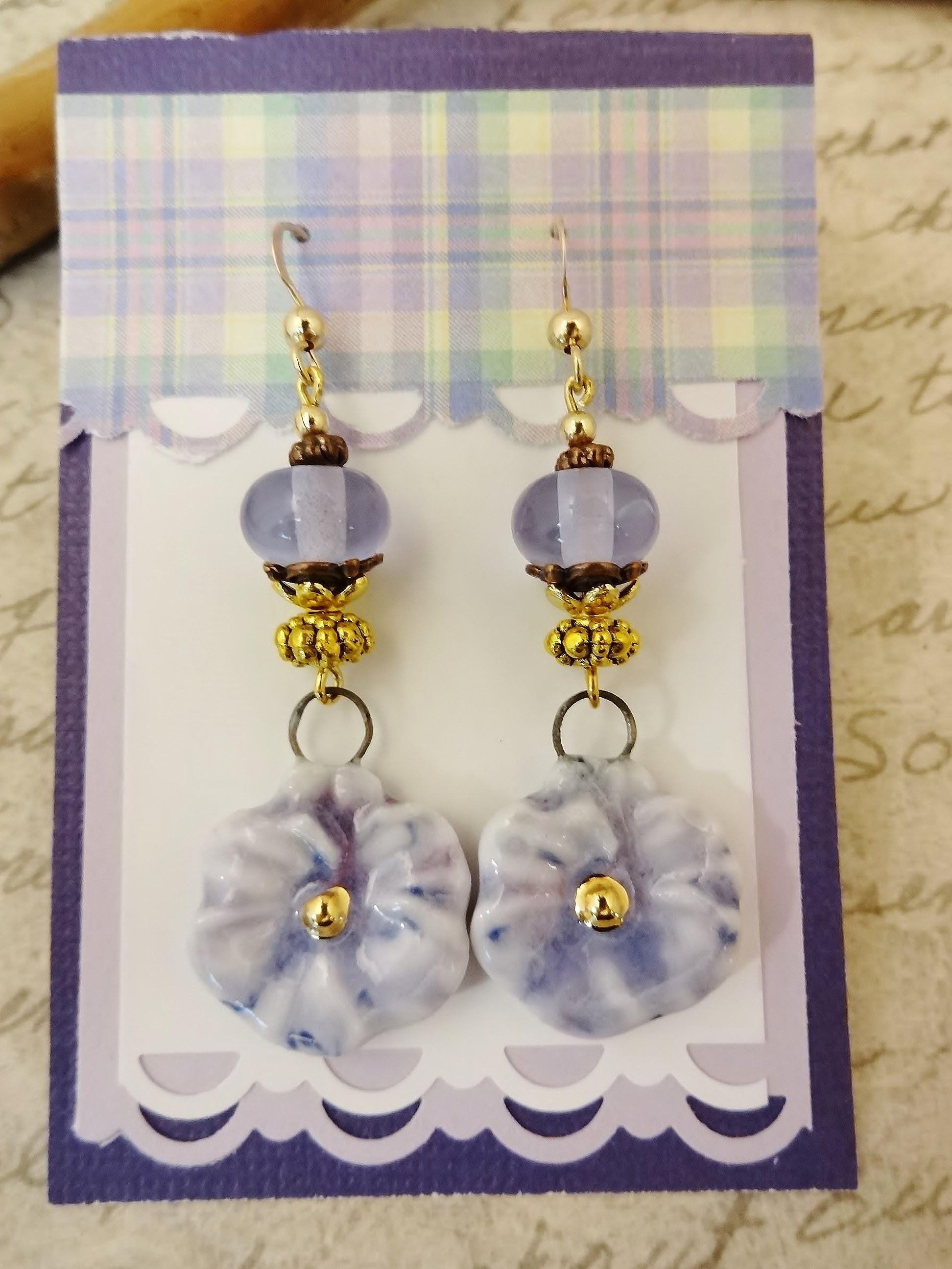 Shabby Chic Ceramic Flower Earrings: Lavender Lamp Glass, Artisan Made