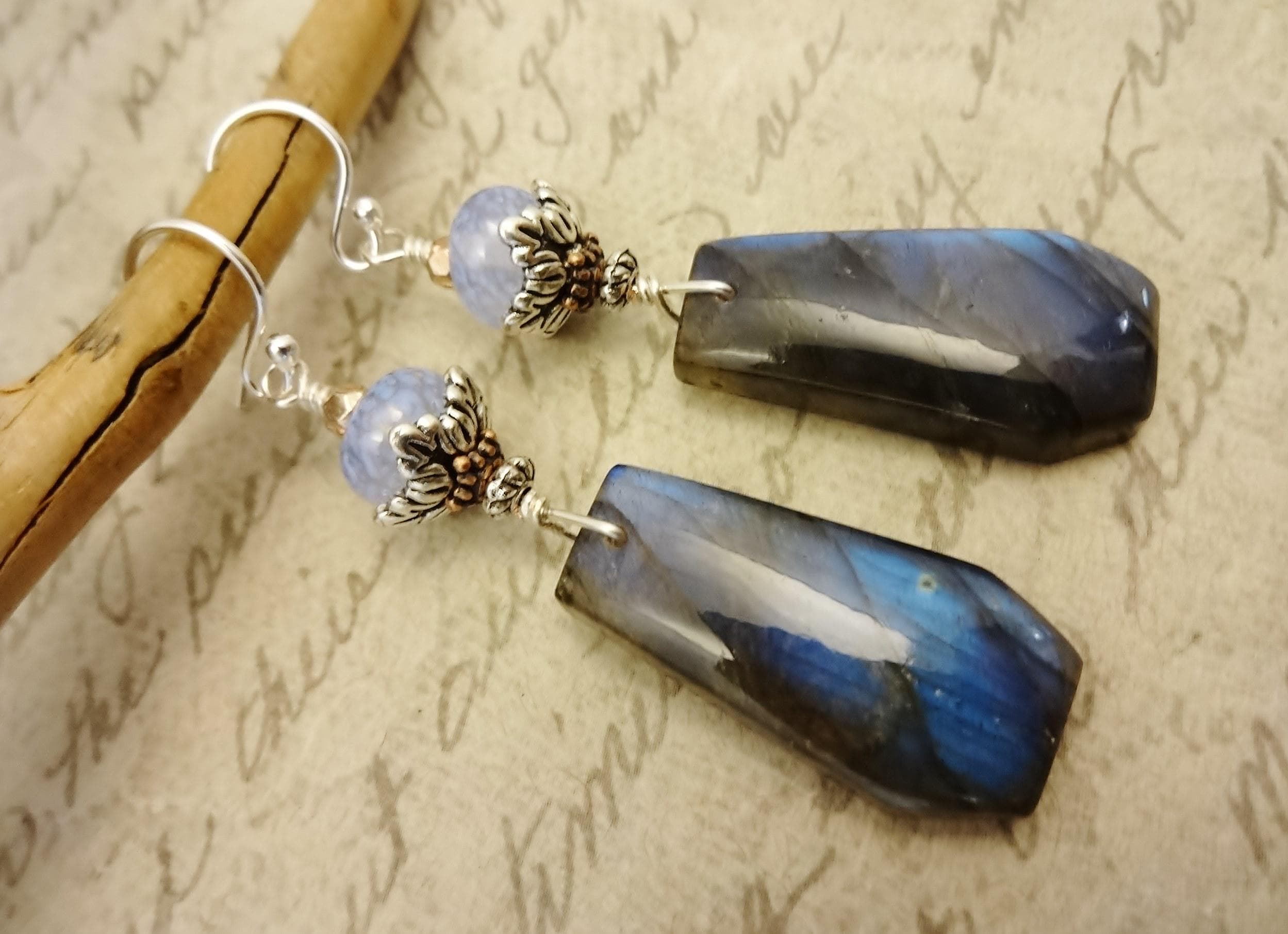 These one-of-a-kind earrings feature Labradorite gemstones in a 6-sided long rectangular shape. There's plenty of blue flash in these stones when the light hits them as you can see in the photos.