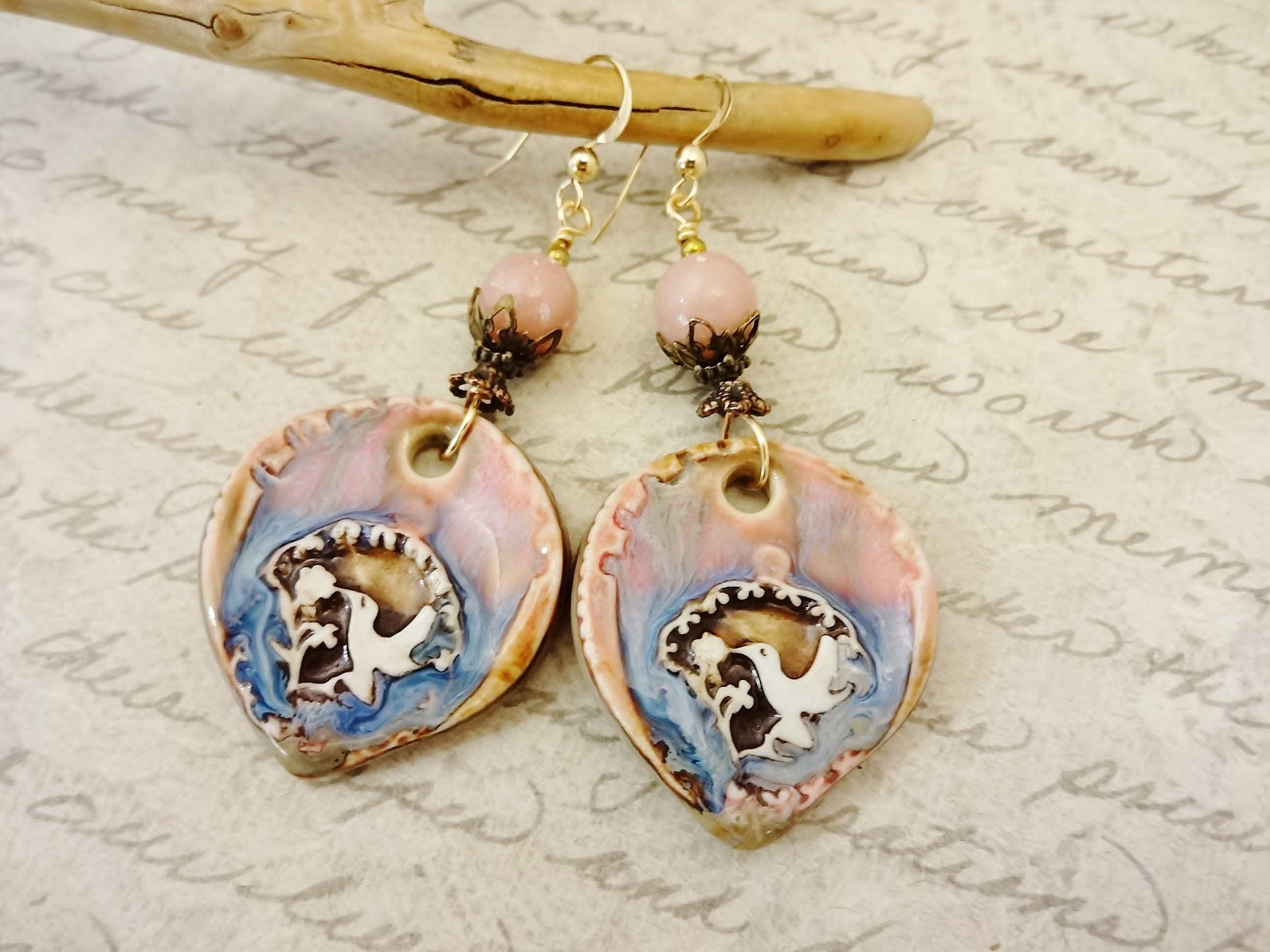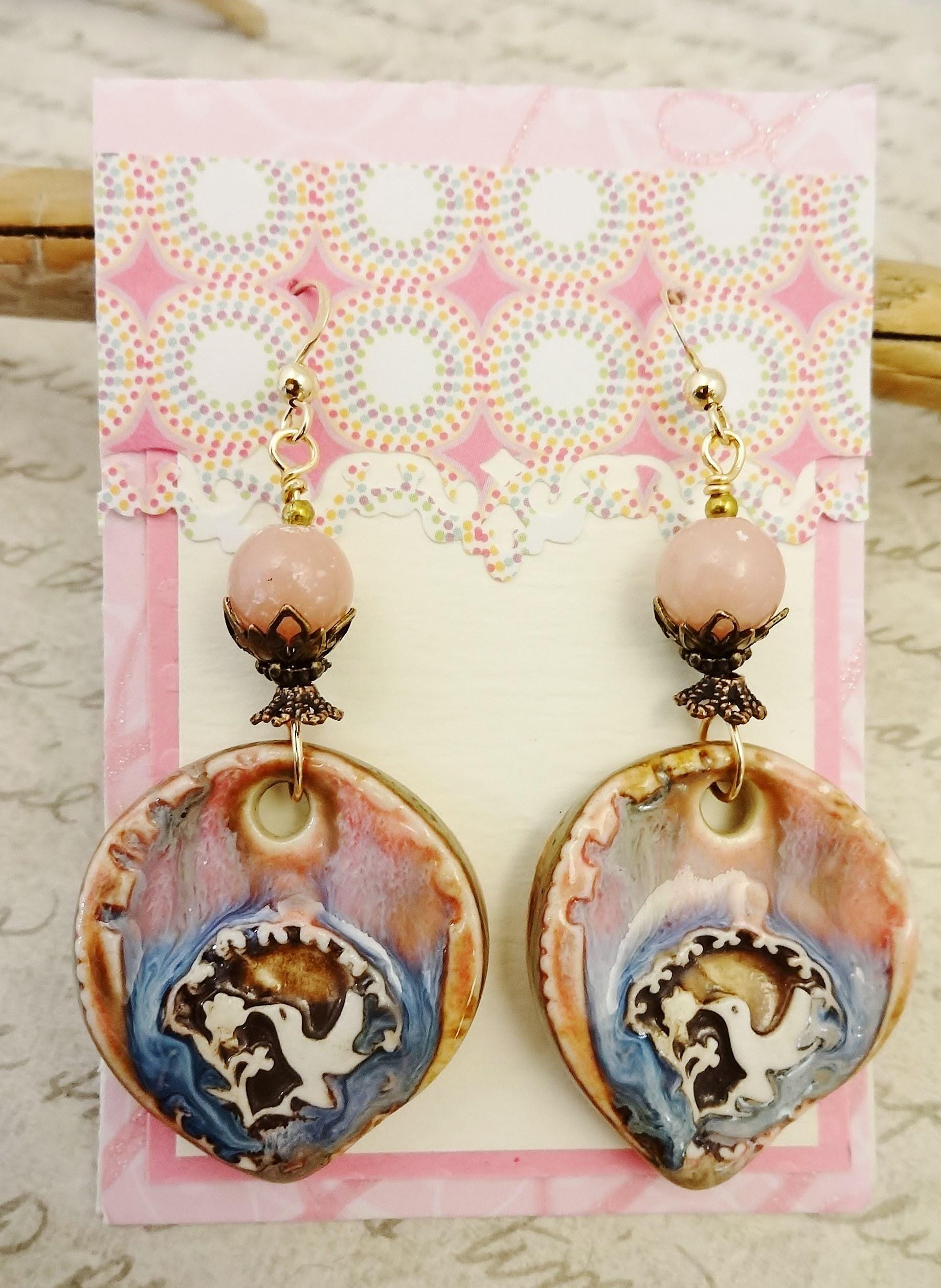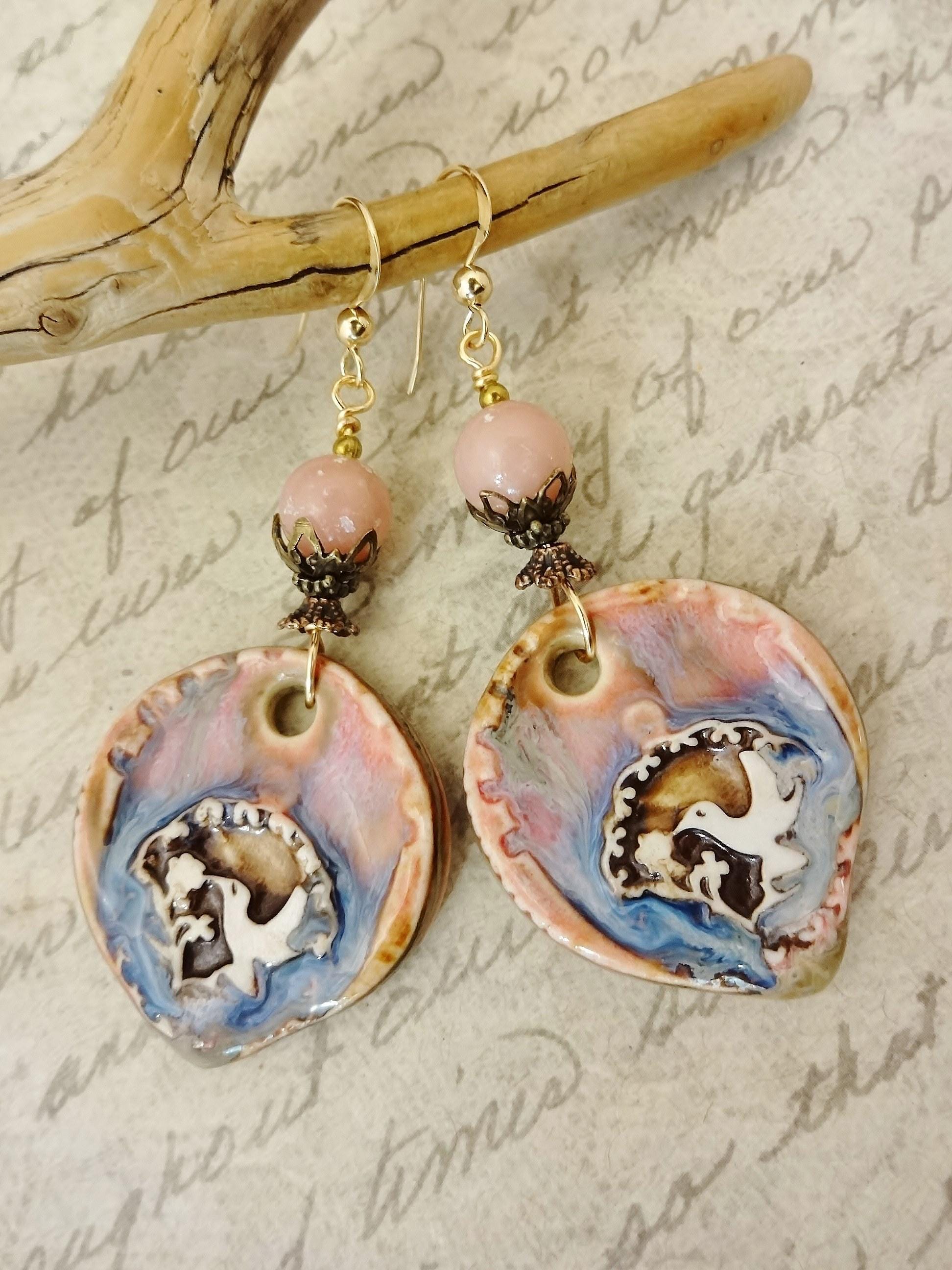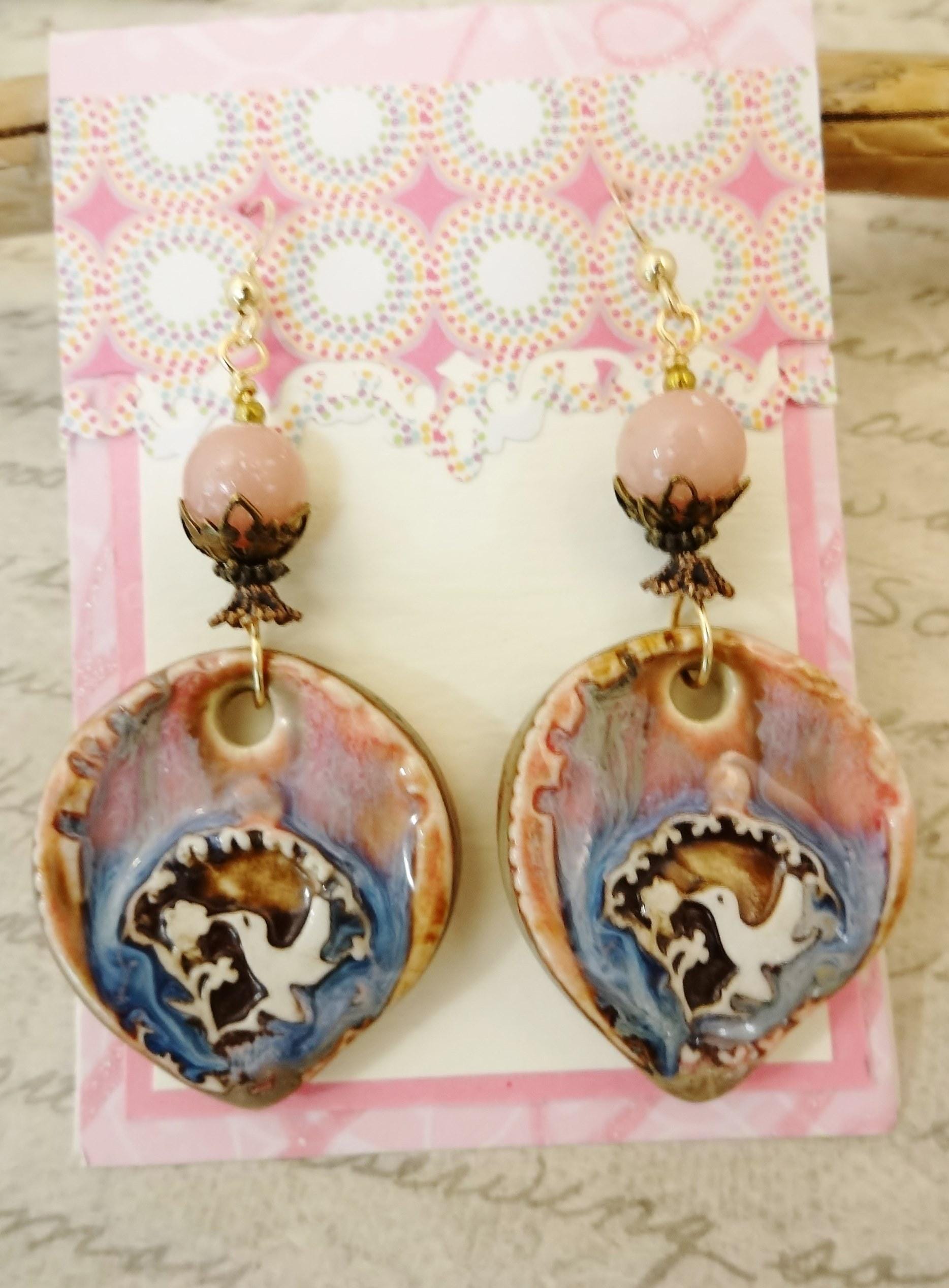 The earrings match each other very well, which doesn’t always happen when making ceramic earrings. I love the window insert into the ceramic pieces with a bird and a flower.