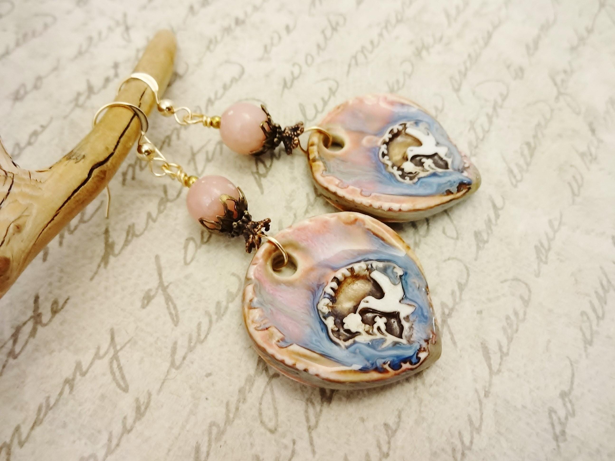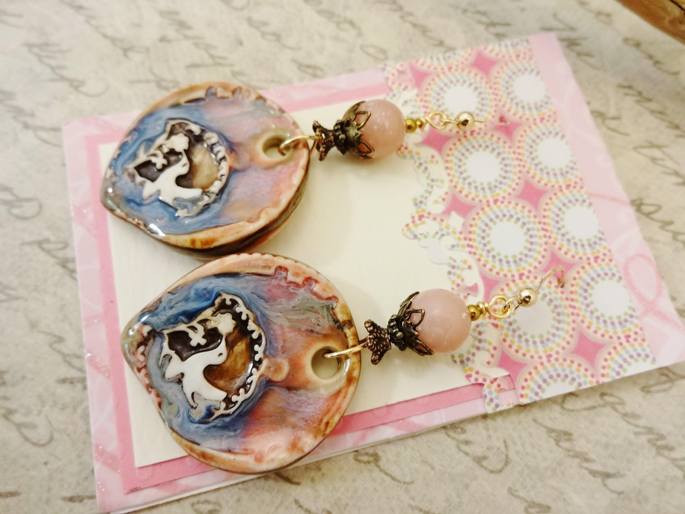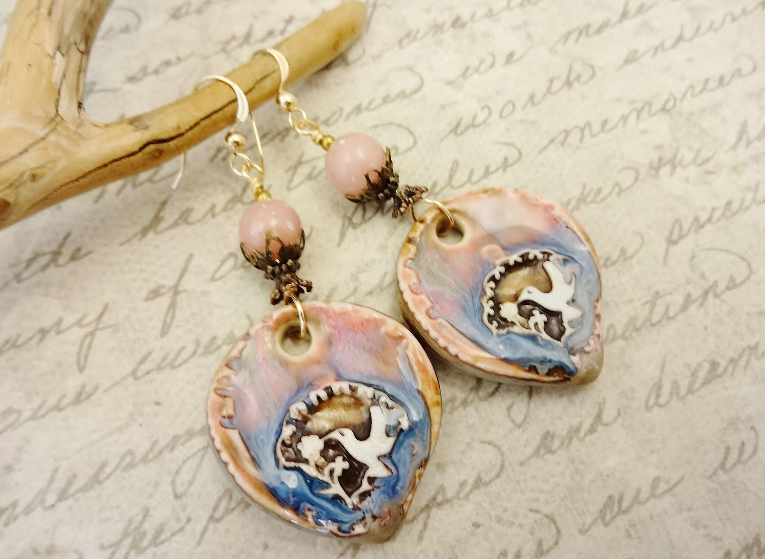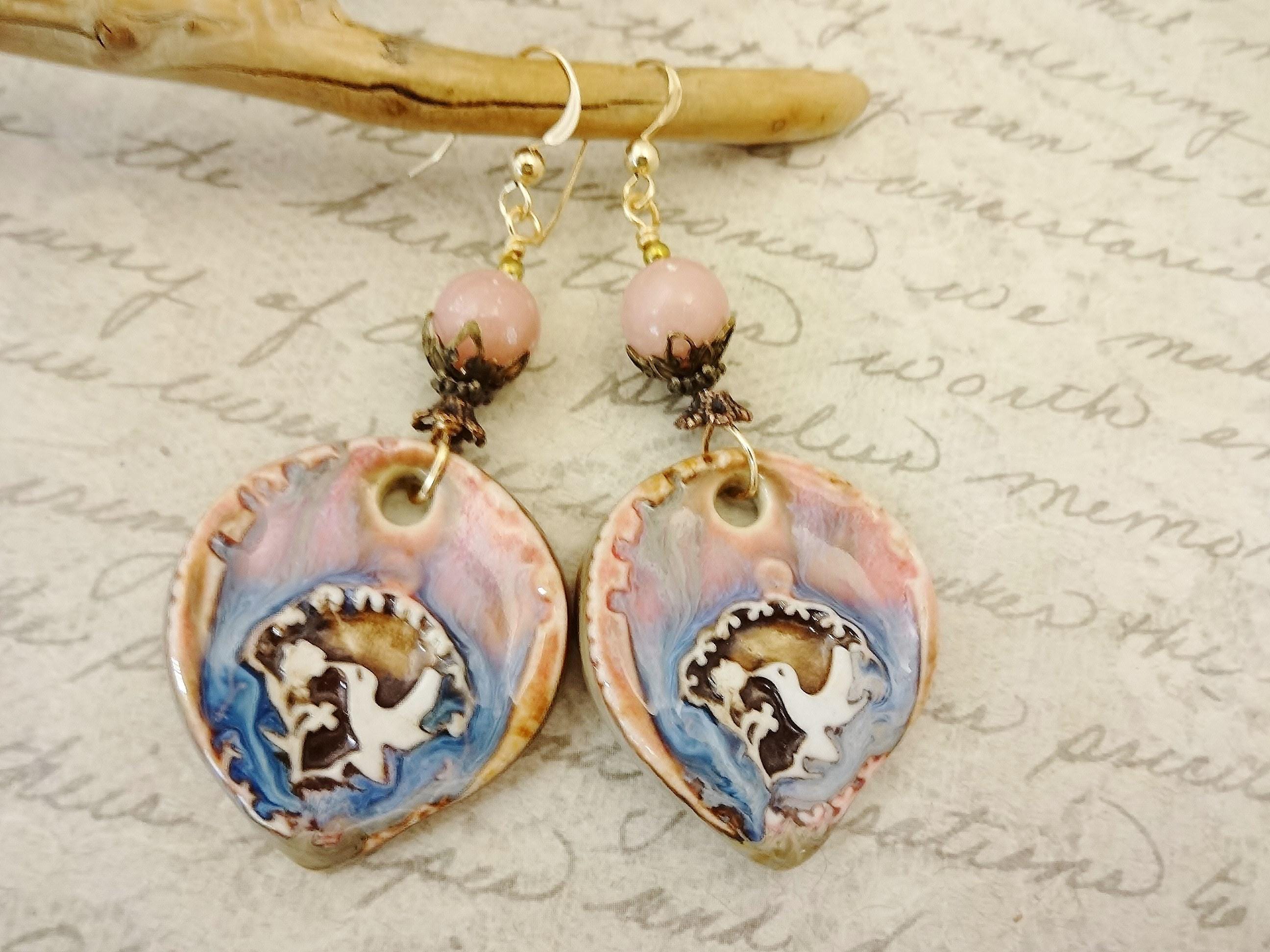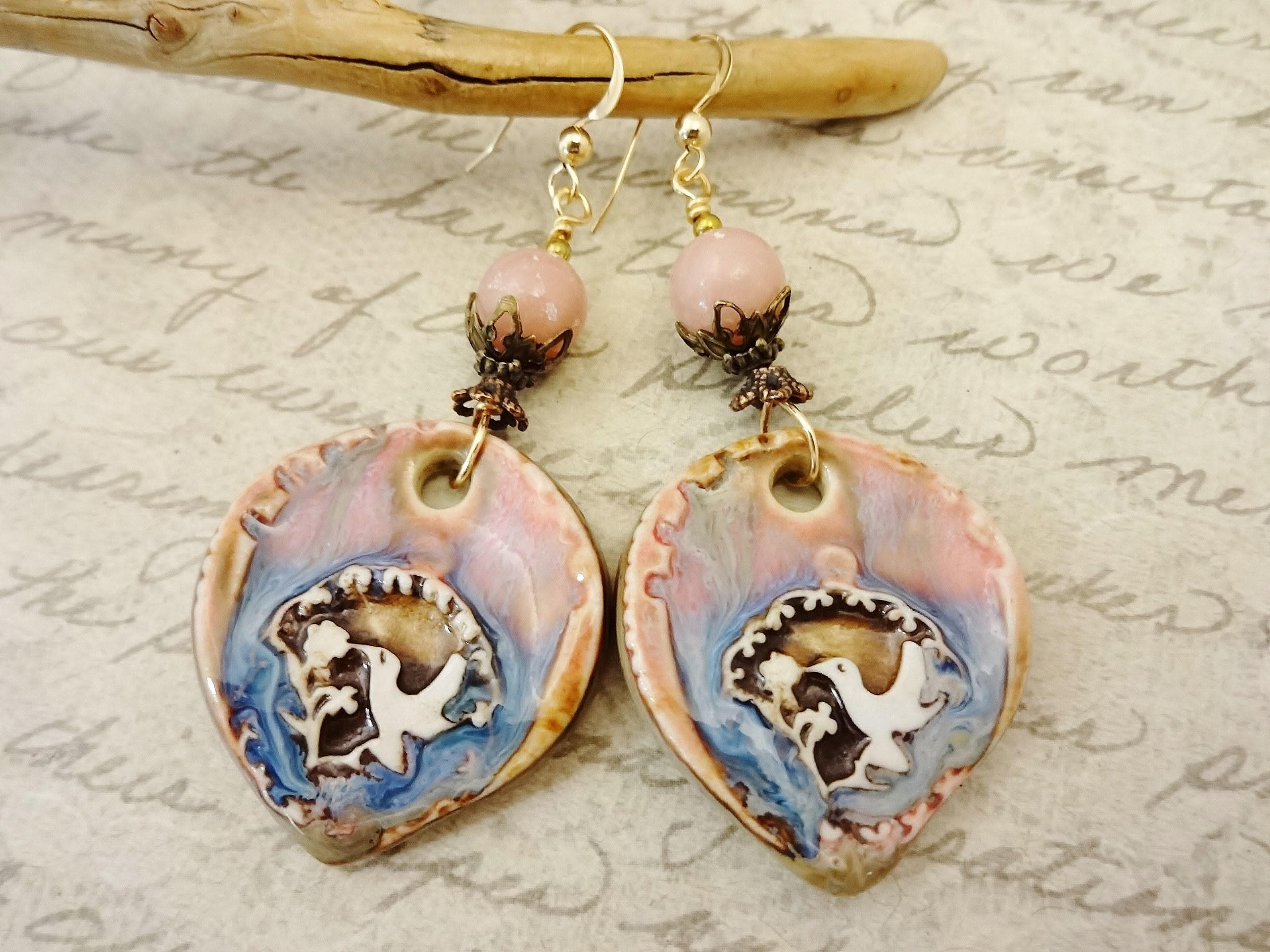 The earrings match each other very well, which doesn’t always happen when making ceramic earrings. I love the window insert into the ceramic pieces with a bird and a flower.