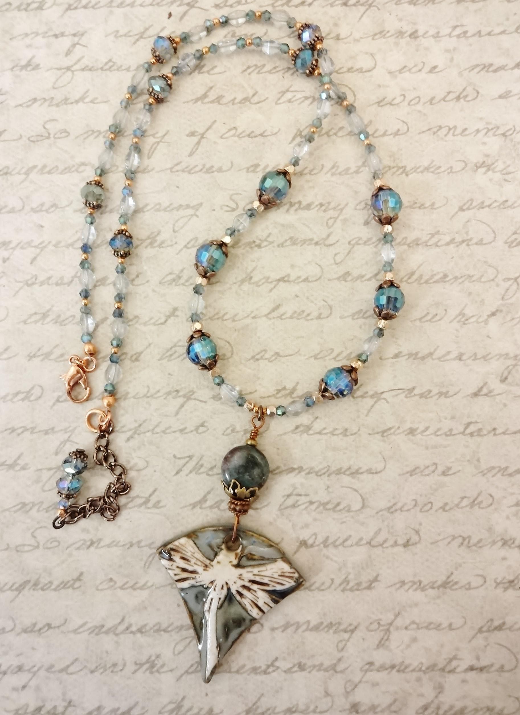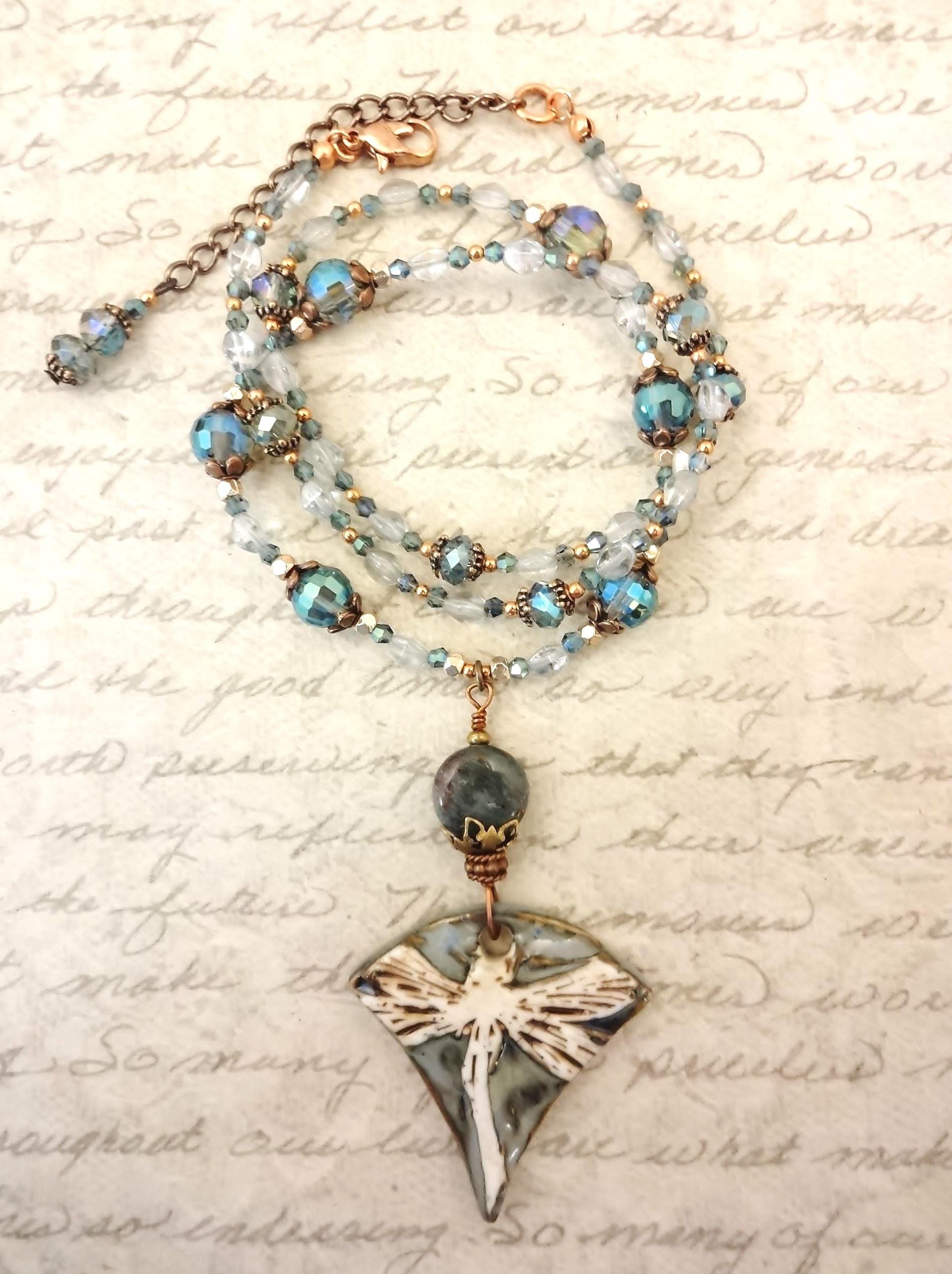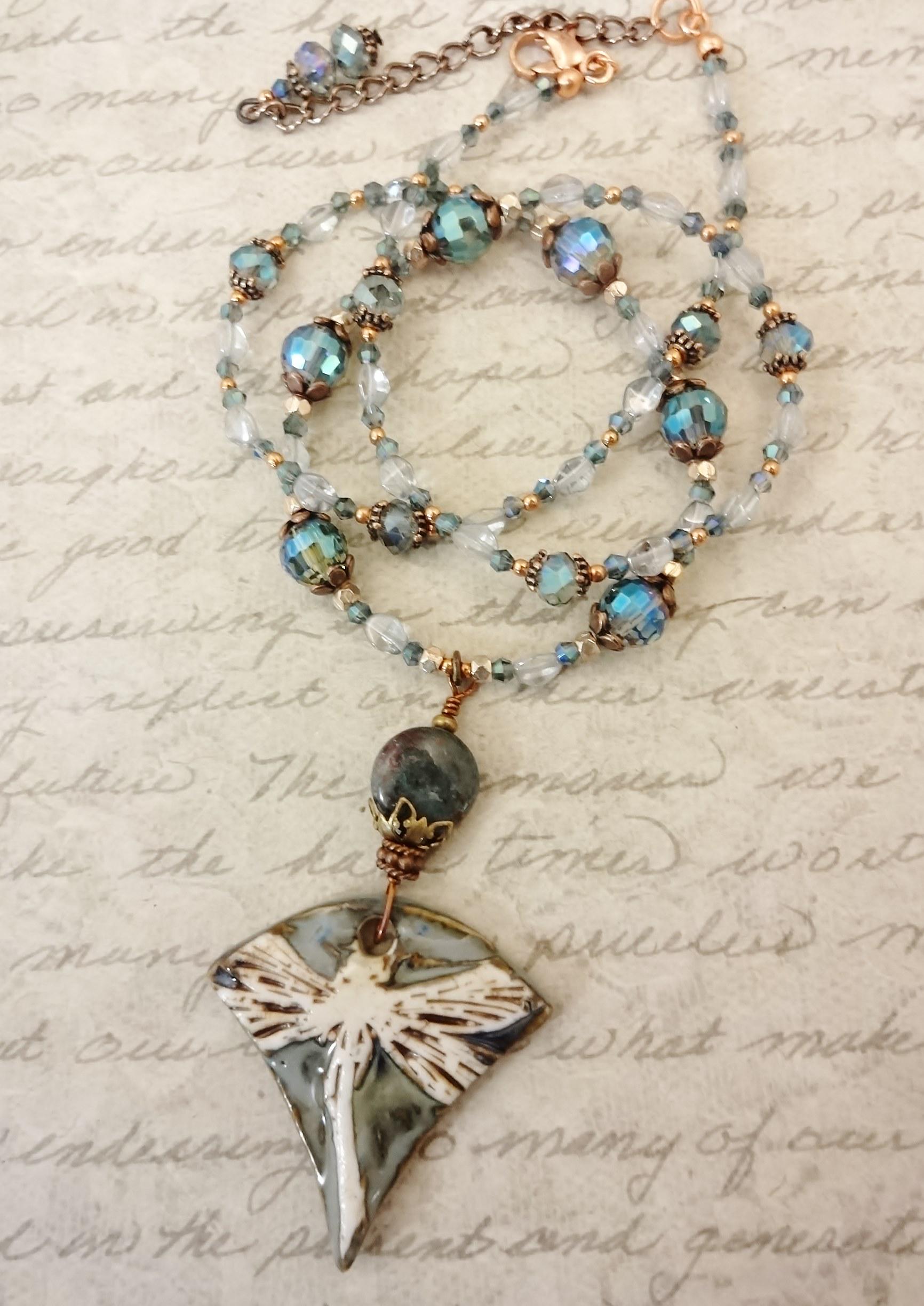 Artisan Porcelain Dragonfly Necklace: Czech Glass, Copper, Rose Gold