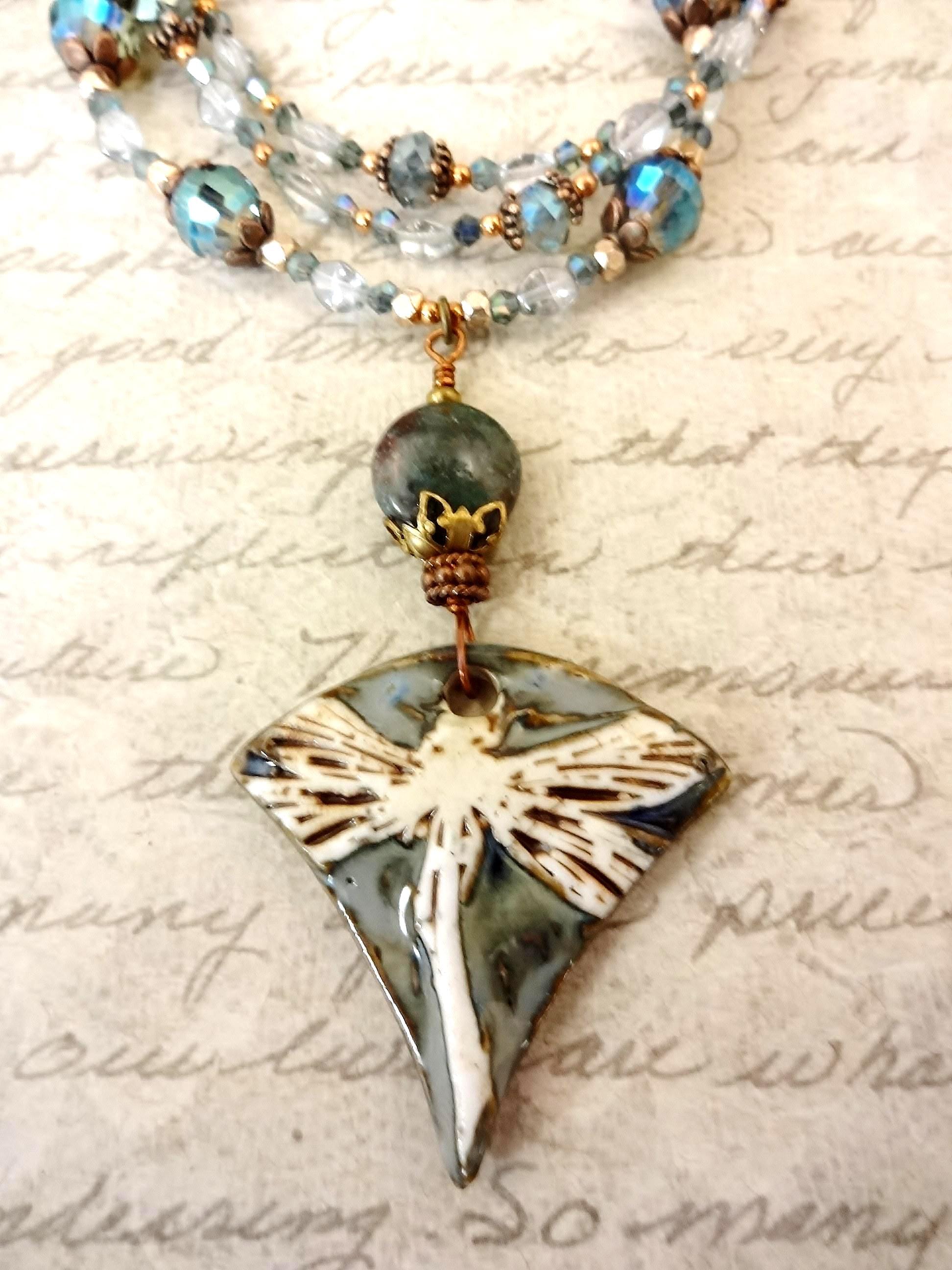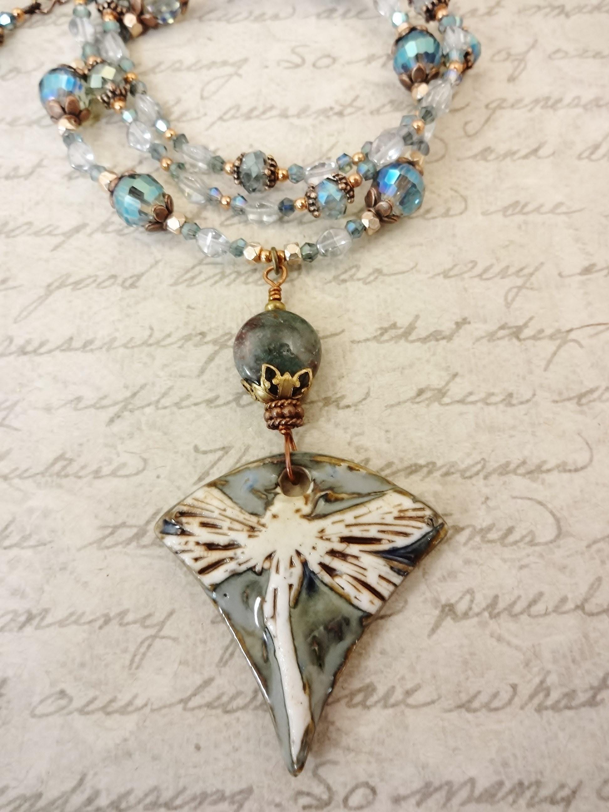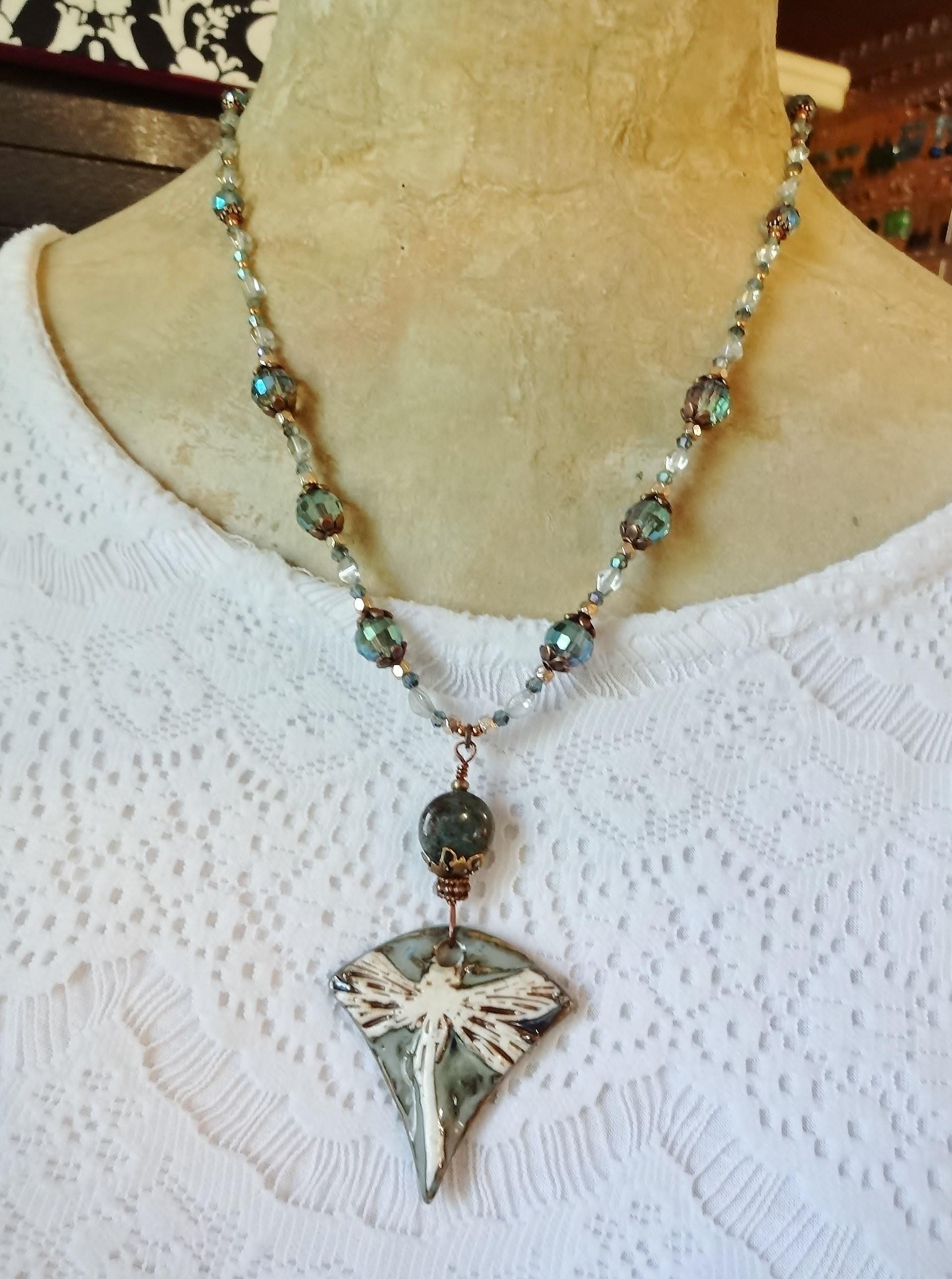 Artisan Porcelain Dragonfly Necklace: Czech Glass, Copper, Rose Gold