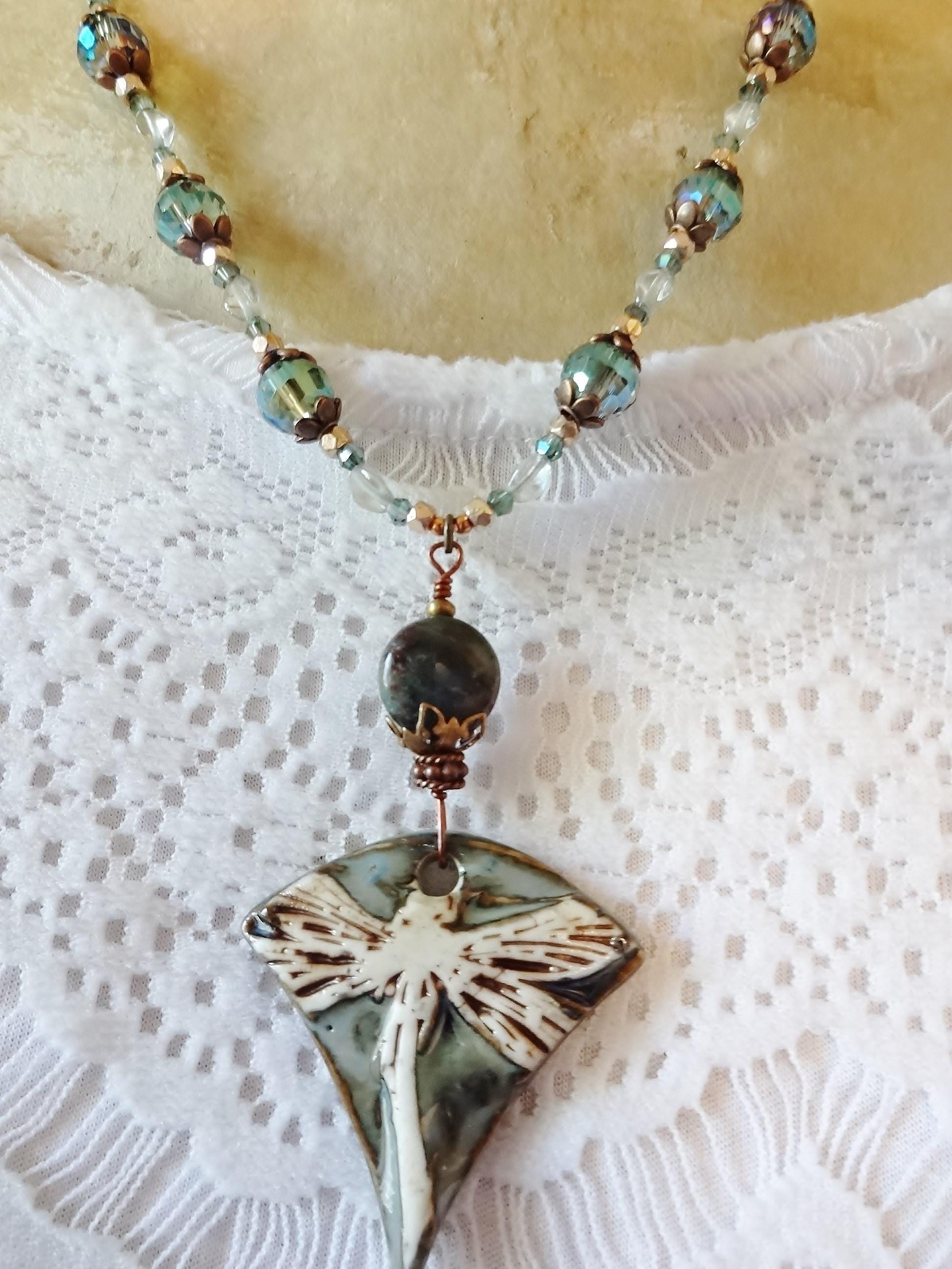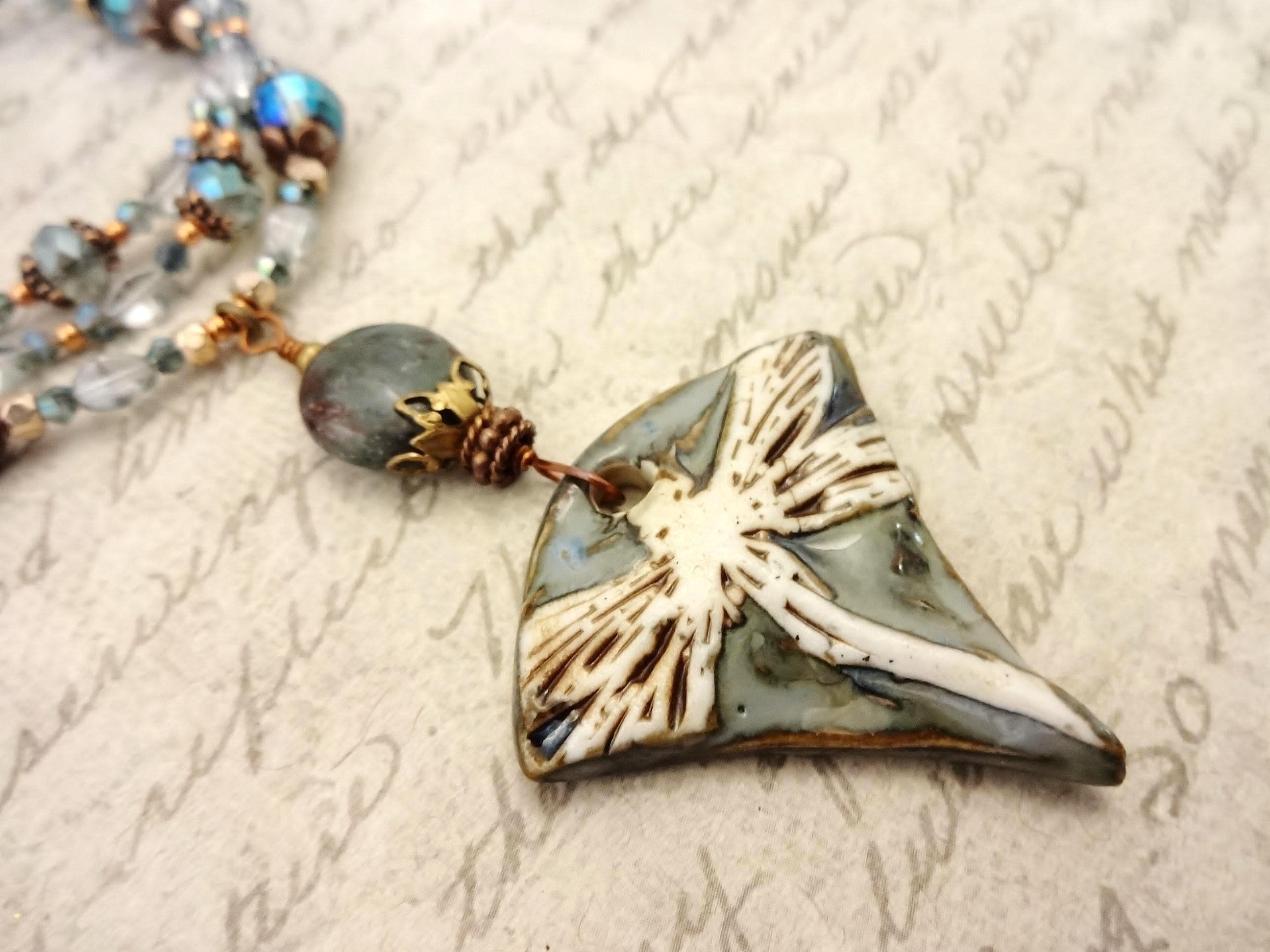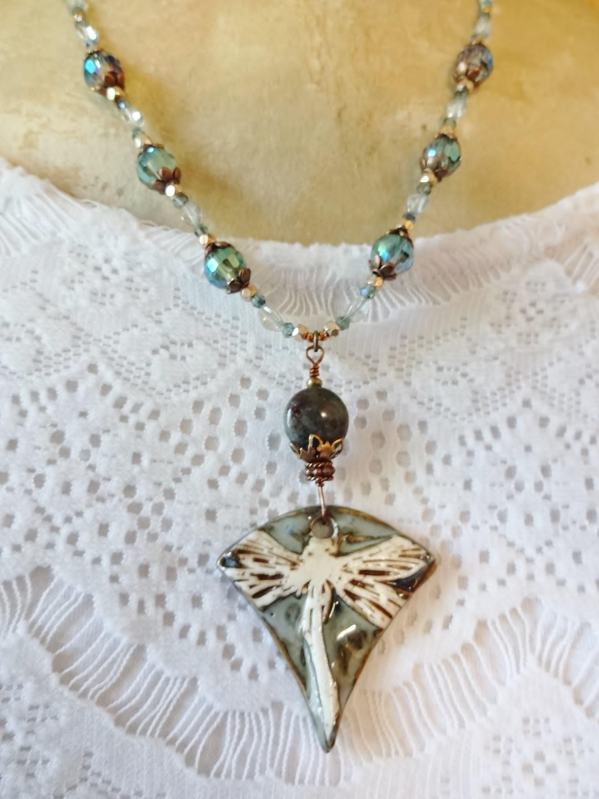 This necklace was inspired by the gorgeous porcelain pendant made by Maria of Majoyoal ceramics here on Etsy. The colors are calm and soothing - light mossy blue/green, beige and brown highlights. The dragonfly is oversized and looks as though the wings fold over the sides.