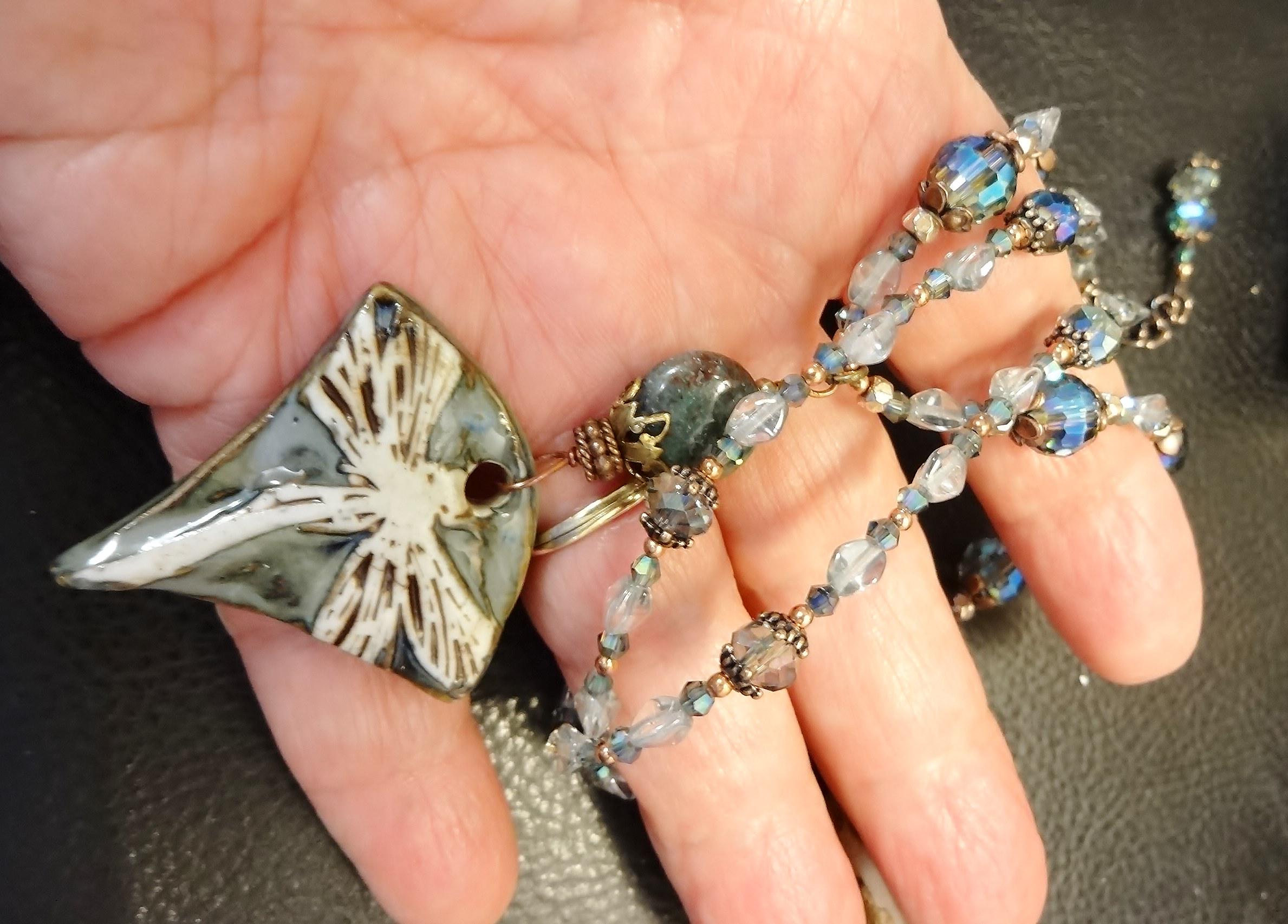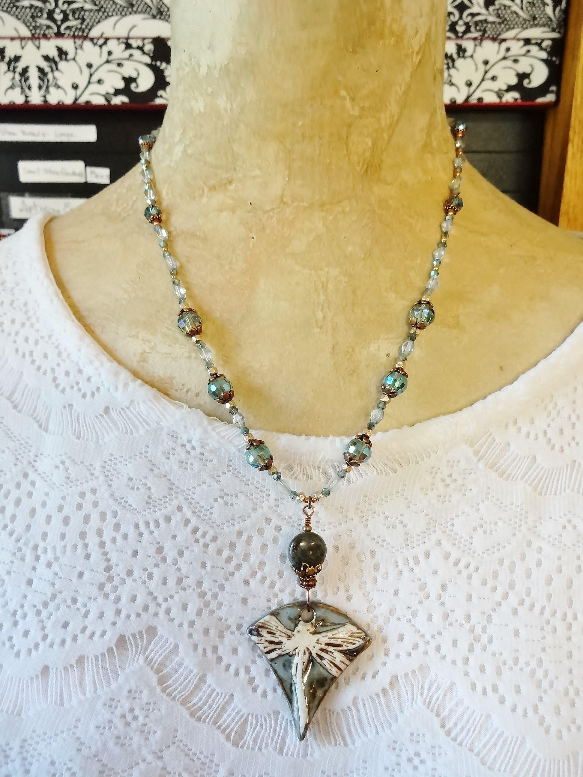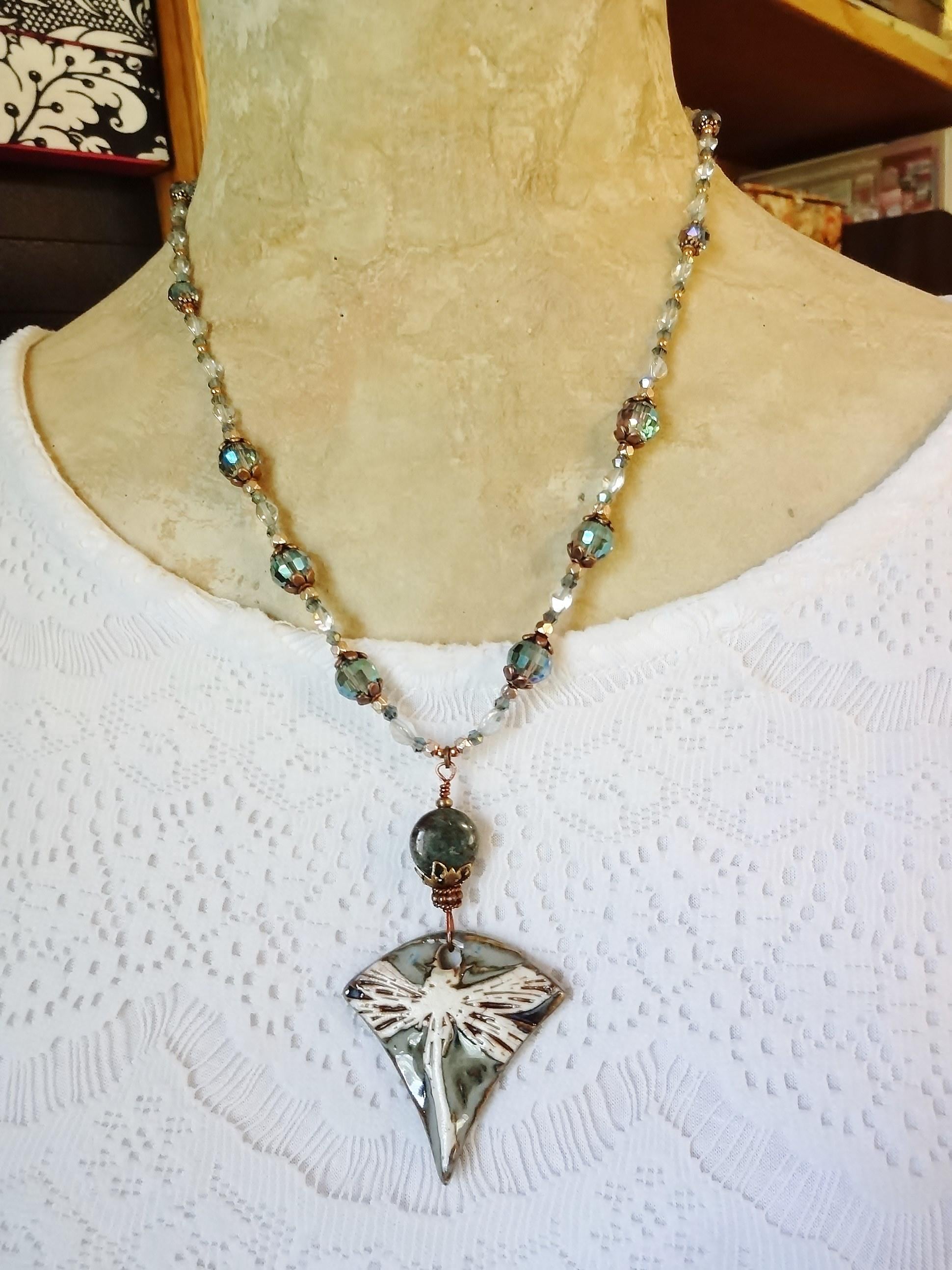 This necklace was inspired by the gorgeous porcelain pendant made by Maria of Majoyoal ceramics here on Etsy. The colors are calm and soothing - light mossy blue/green, beige and brown highlights. The dragonfly is oversized and looks as though the wings fold over the sides.