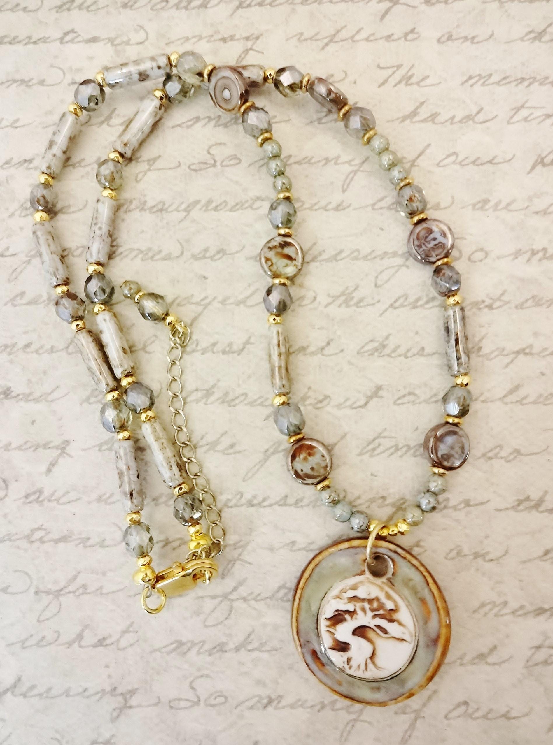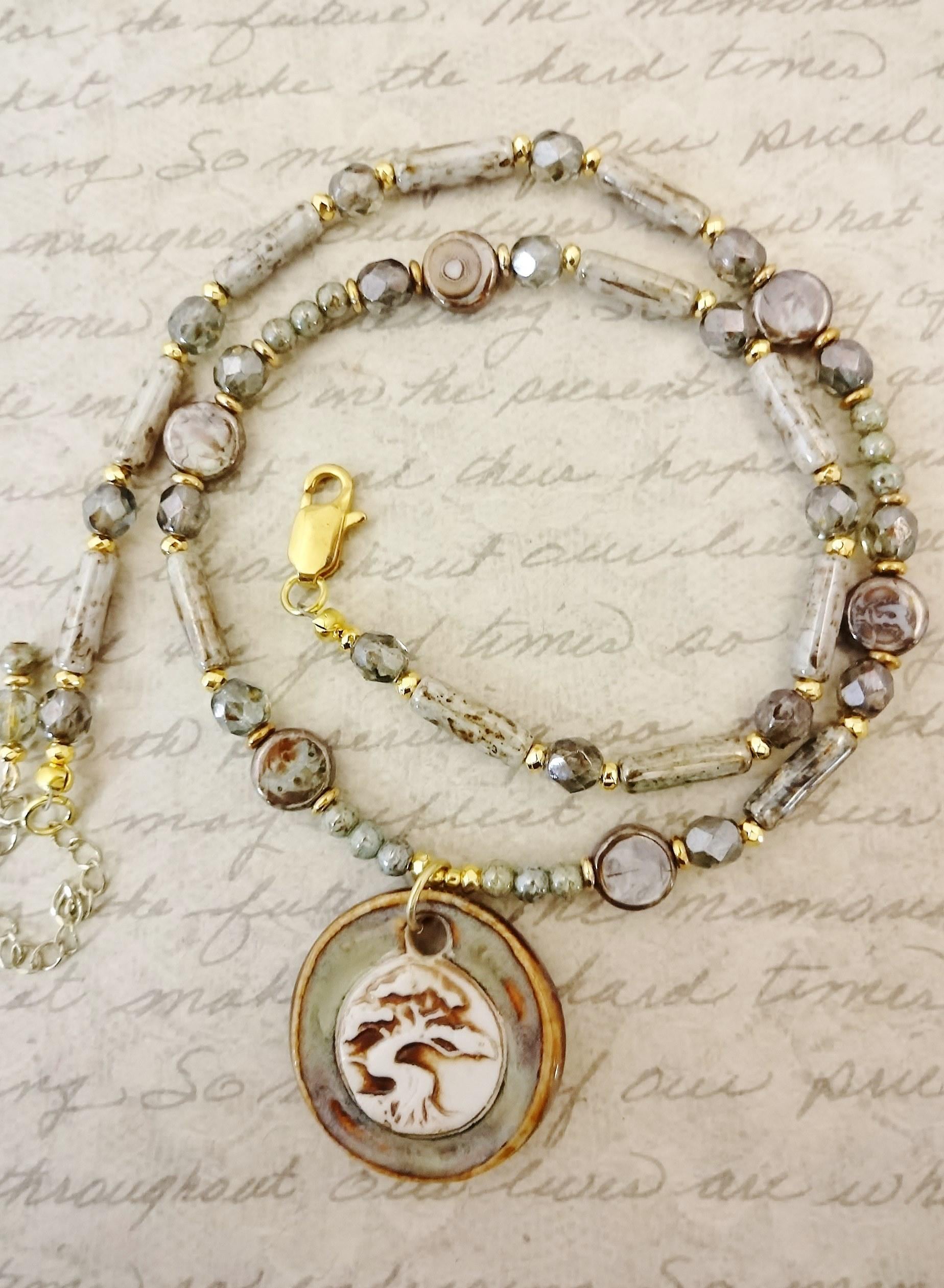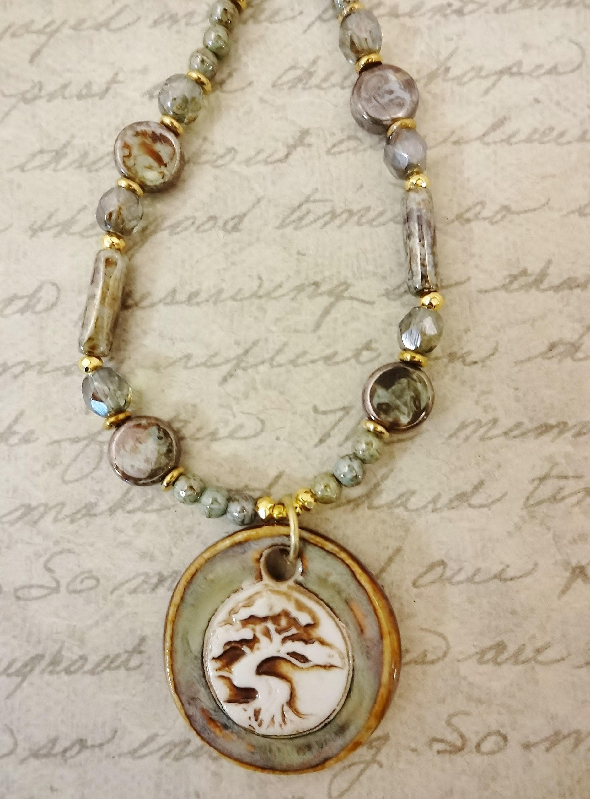 Tree of Life Necklace: Artisan Porcelain Pendant, Czech Glass Silvery Green Picasso
