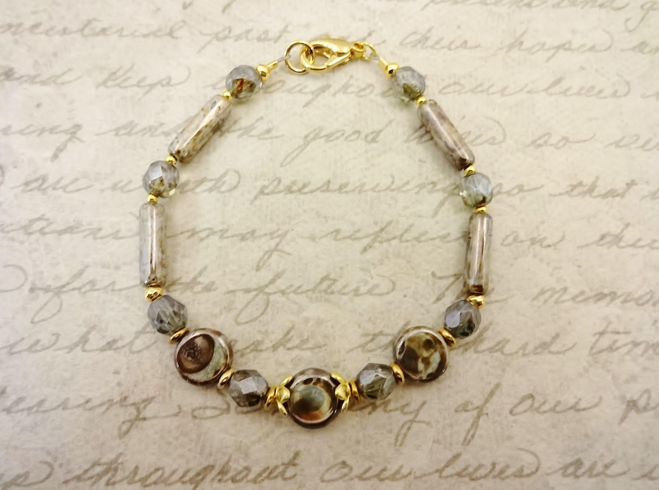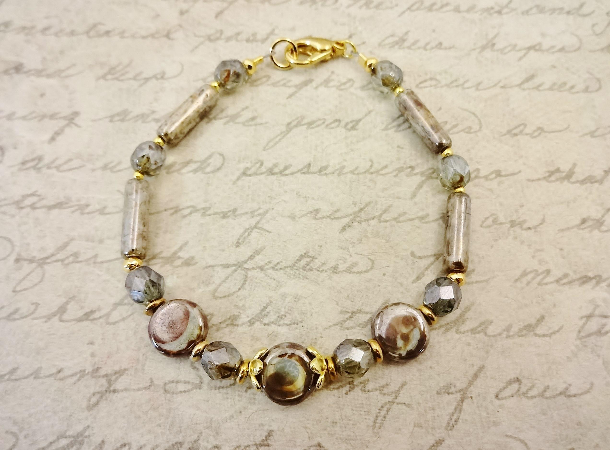 I paired the pendant with Czech Glass - mottled coins, tubes and small rounds with a Picasso finish and Firepolish faceted rounds in luster green. Gold faceted rondelles in two sizes add interest. The necklace includes a length of gold chain making it adjustable in length from 18 to 23 inches long.