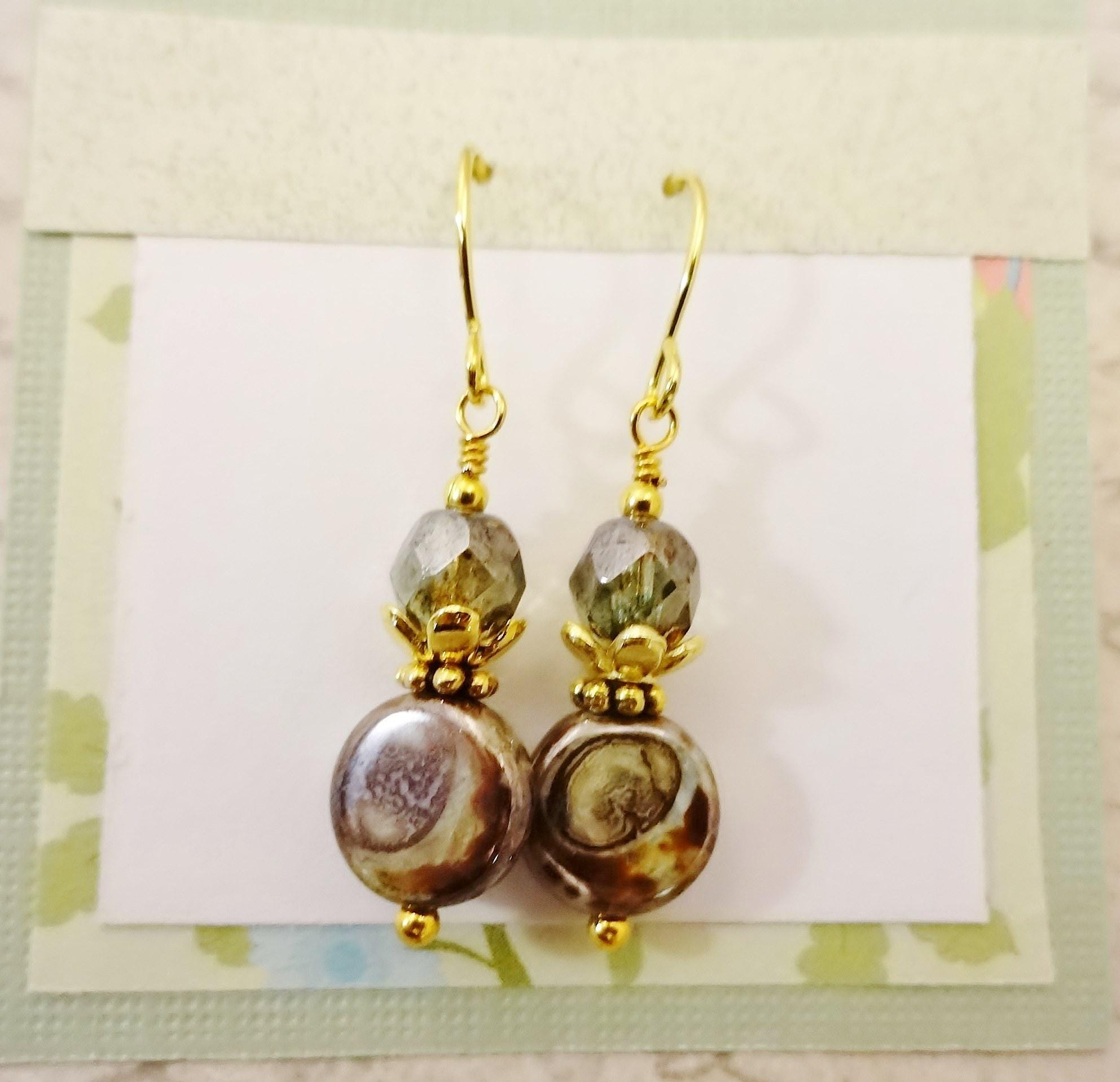 Earring length is about 1.75 inches. The ear wires are gold plated steel. I do have other options in metals or styles in the Add-On section, or I can also switch them out to surgical steel lever back wires for no additional cost.