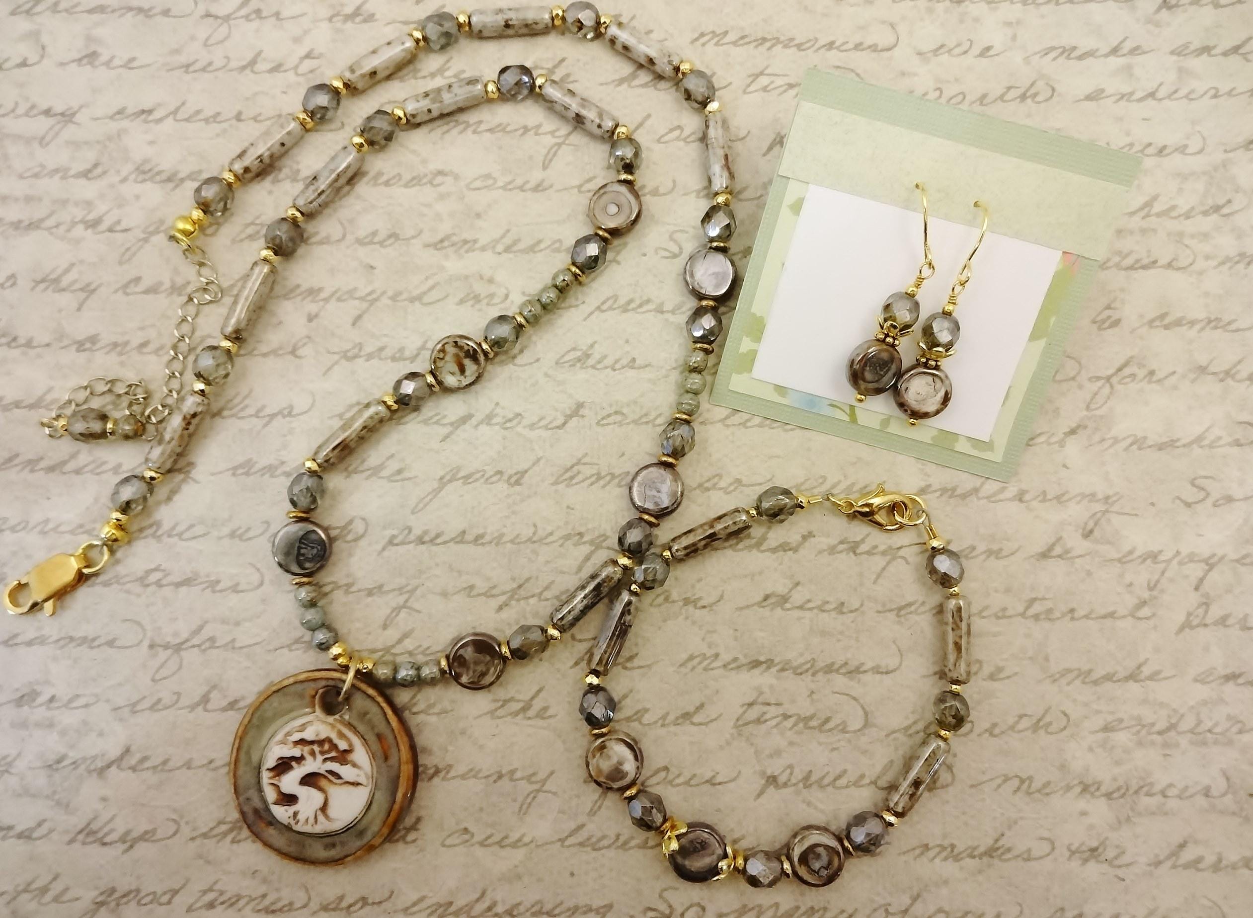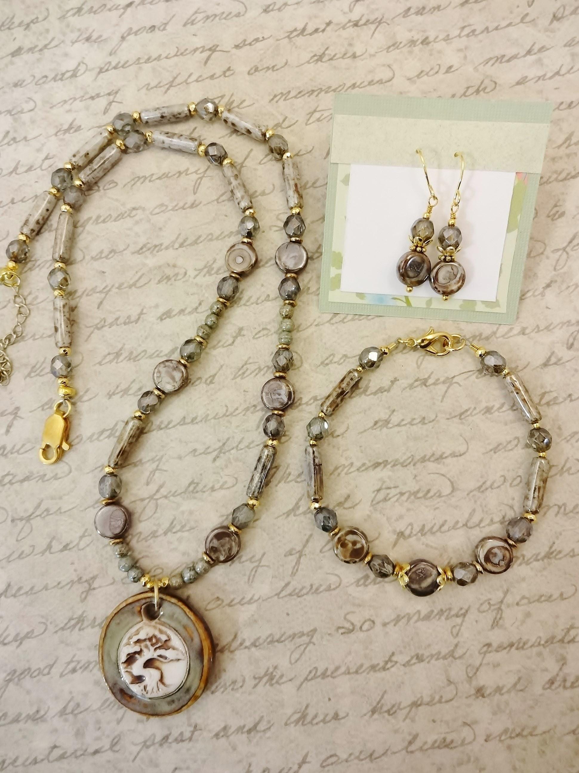 This necklace was inspired by the gorgeous focal, a porcelain pendant made by Maria of Majoyoal ceramics here on Etsy. The colors are calm and soothing, silvery green with brown rim and white tree with brown highlights. The pattern is a beautiful Tree of Life.