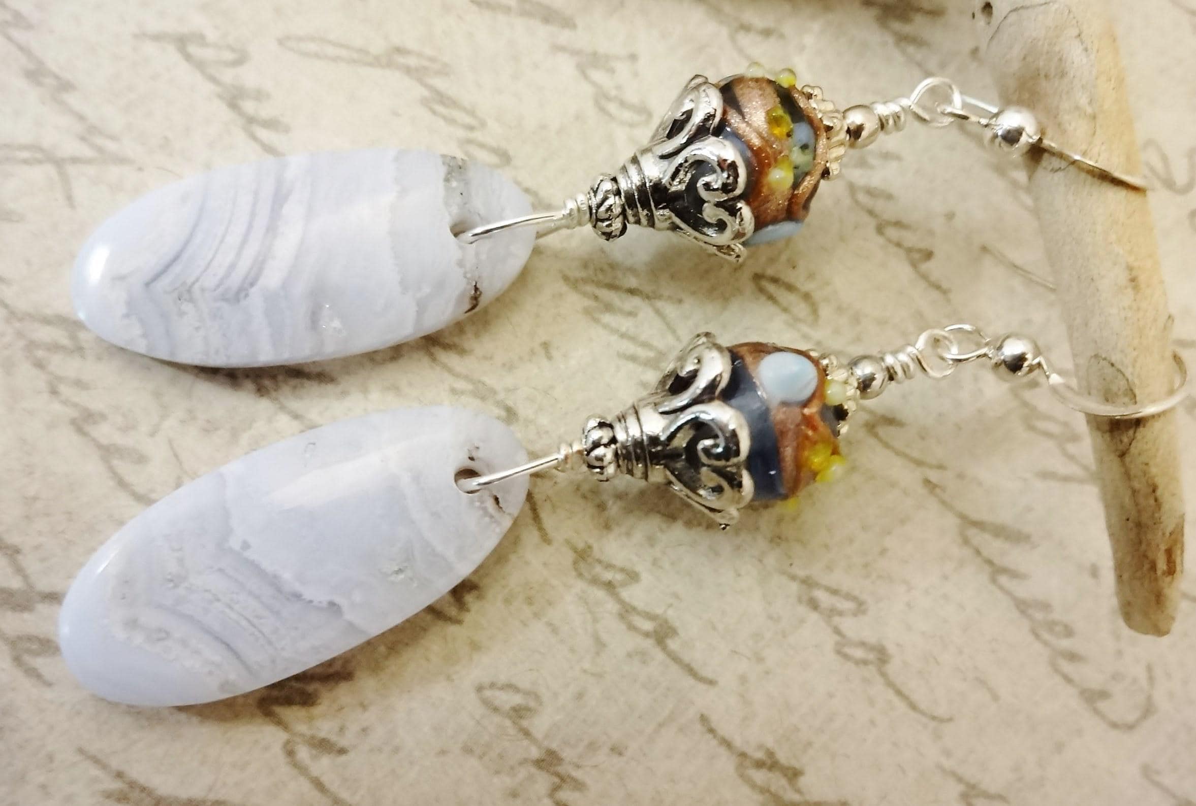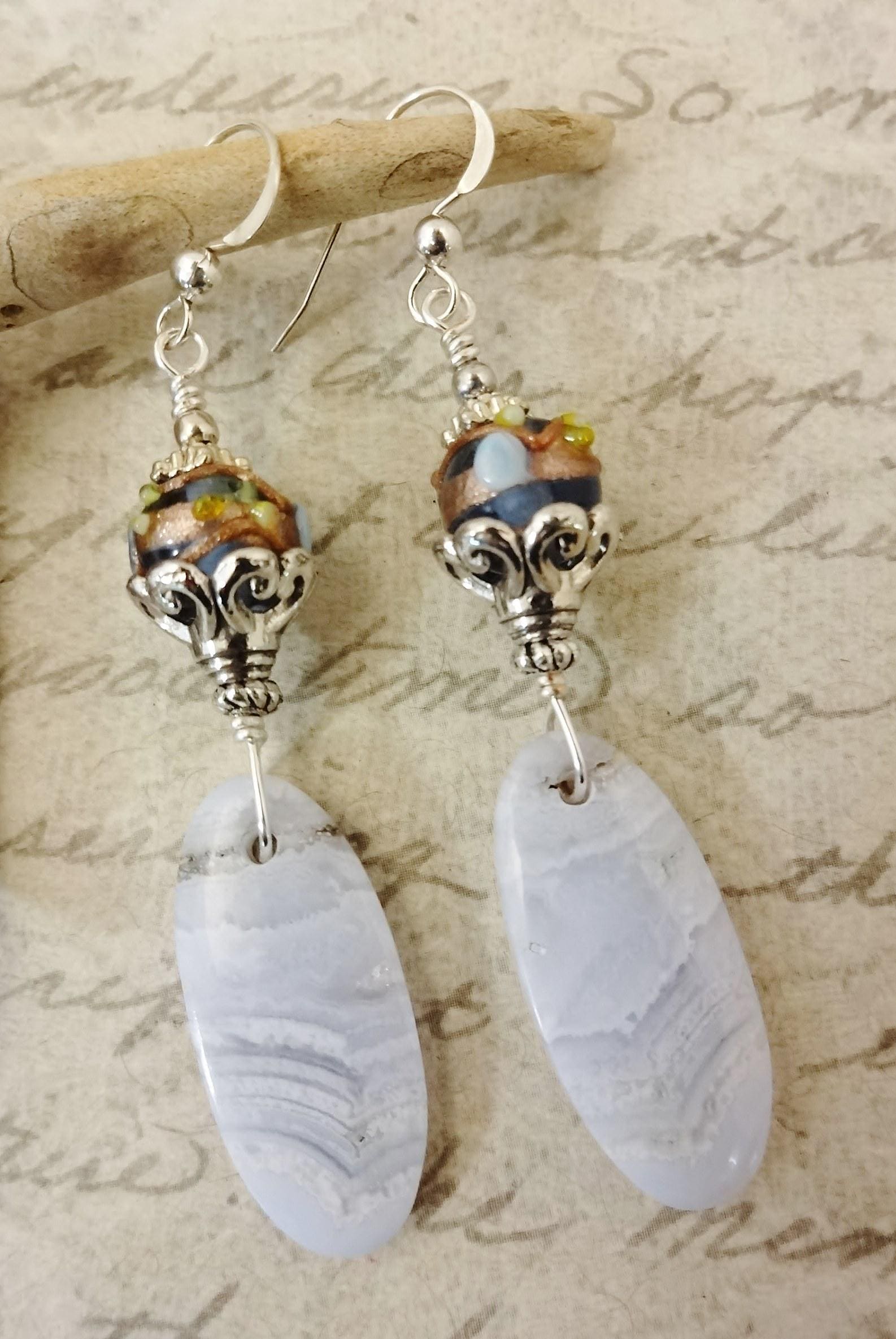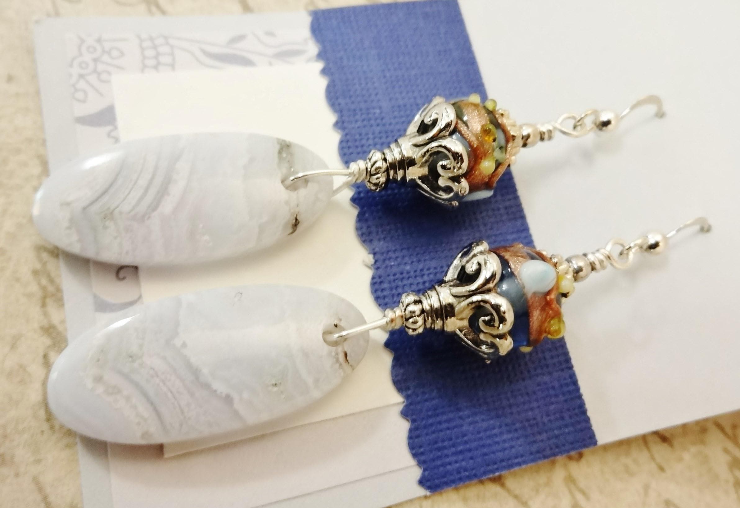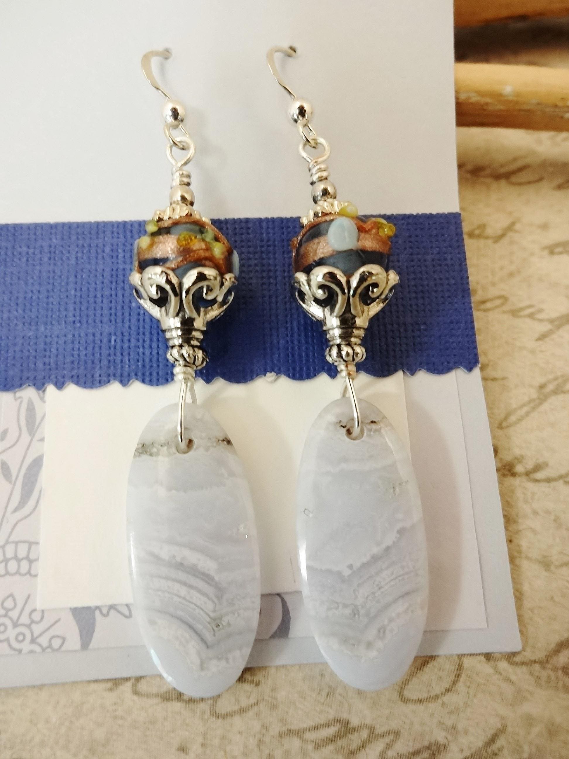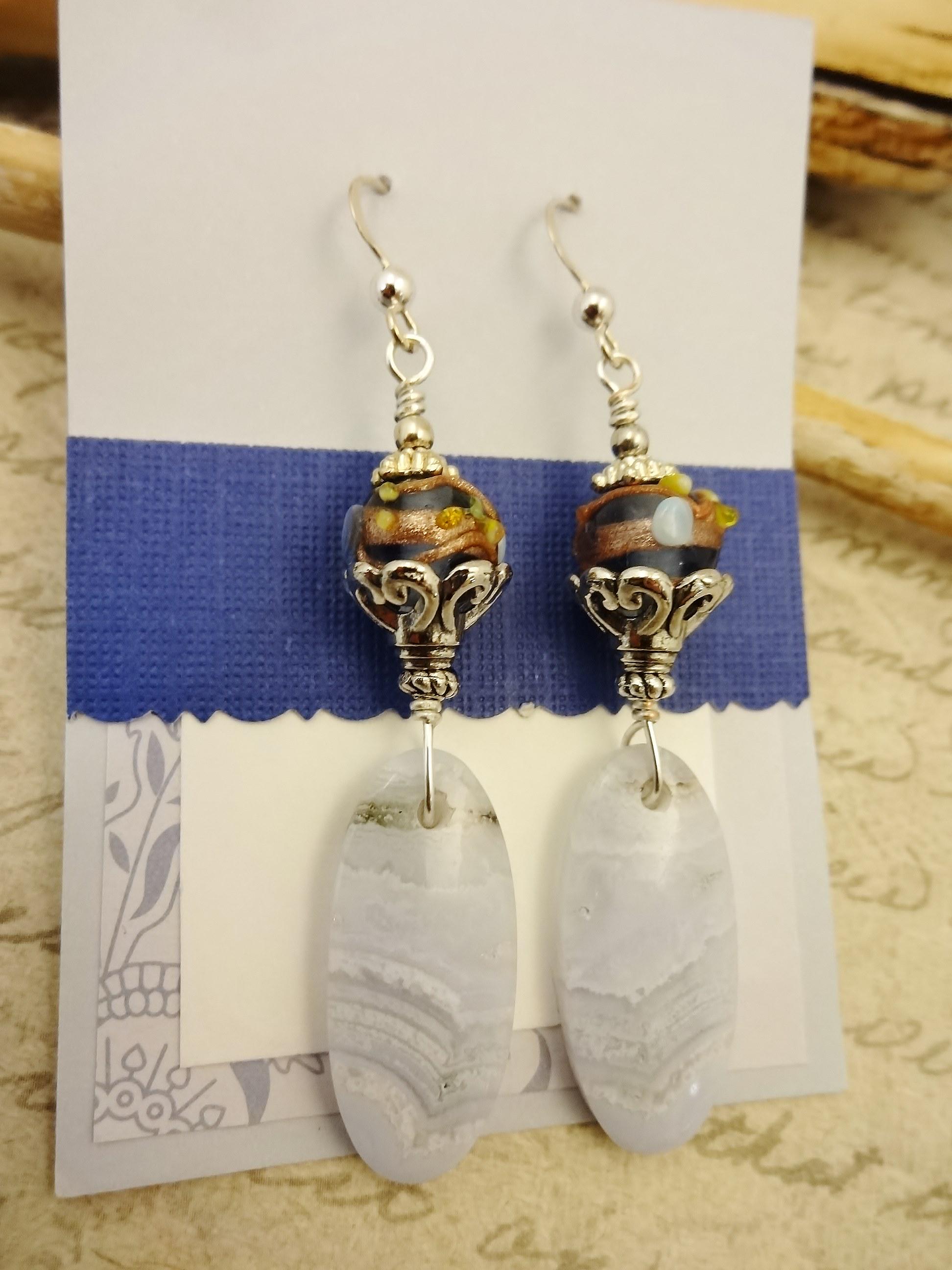 These earrings feature gemstone ovals of Blue Lace Agate that I wire wrapped with non-tarnish silver wire. Above the stones I added lovely blue Lampwork Glass beads sitting in silver-plated pewter heart shaped bead caps. Tiny Sterling Silver beads finish the stack.