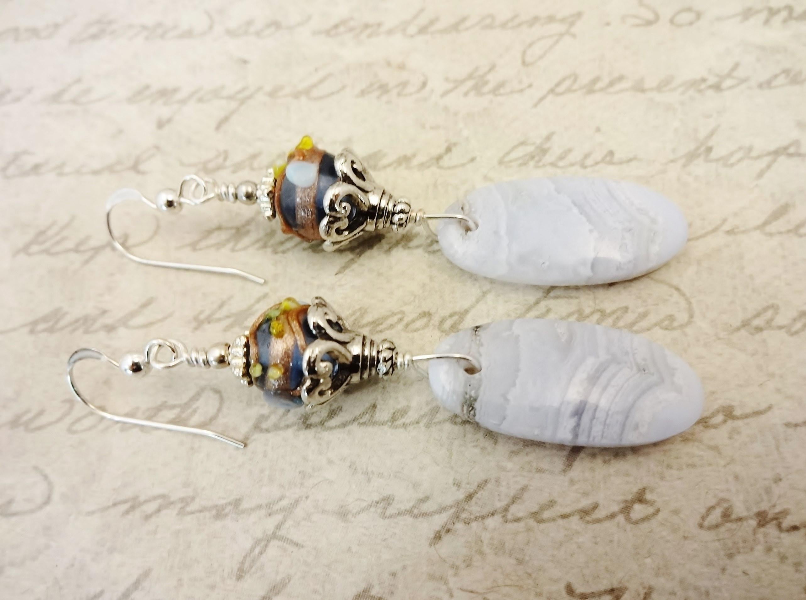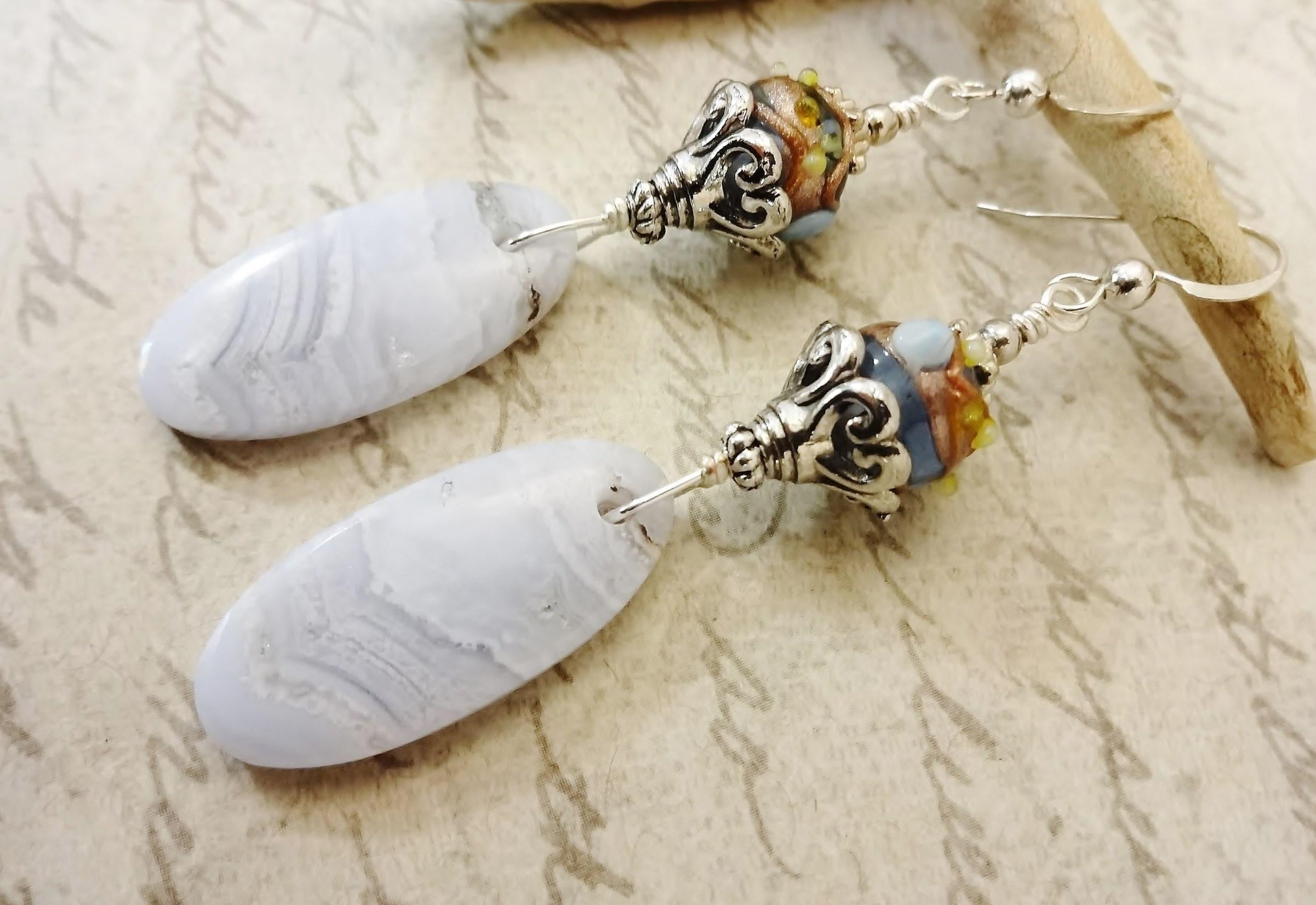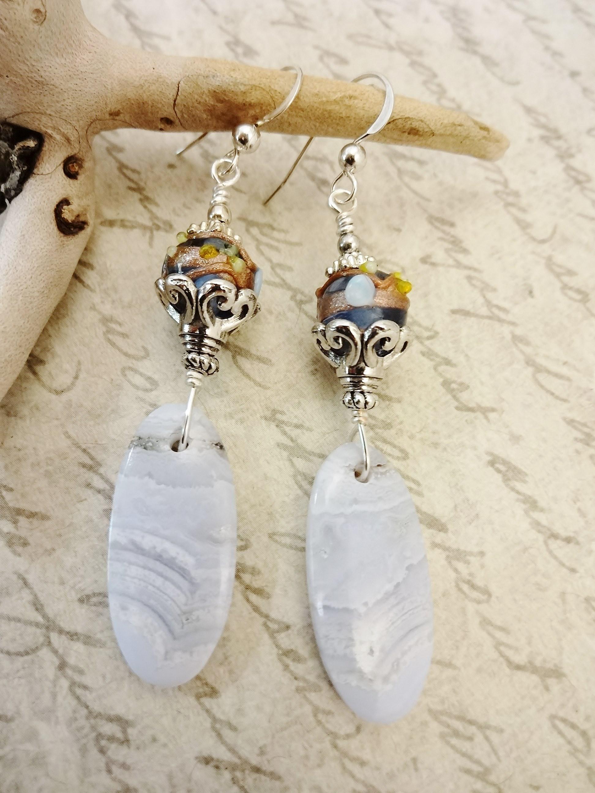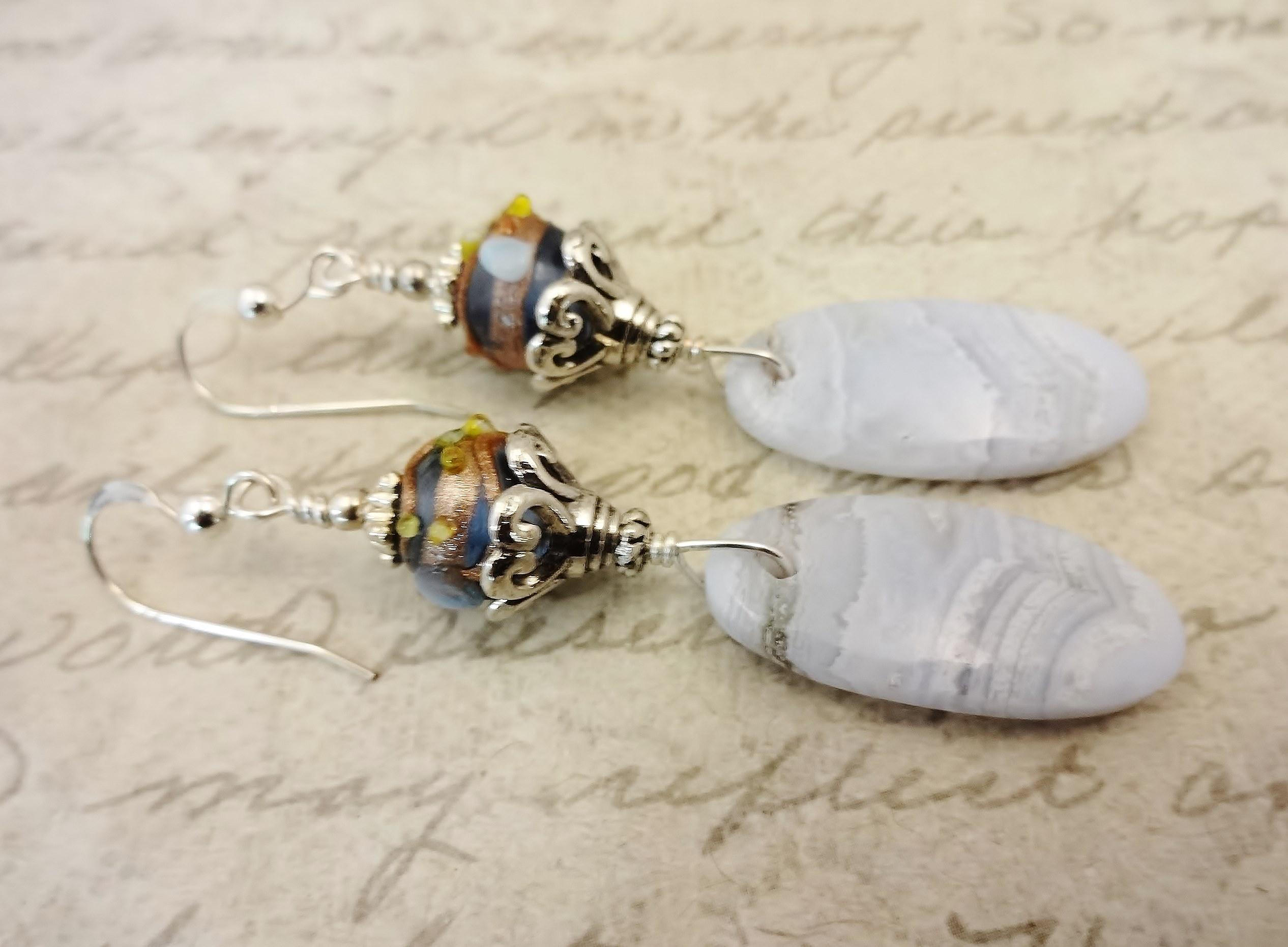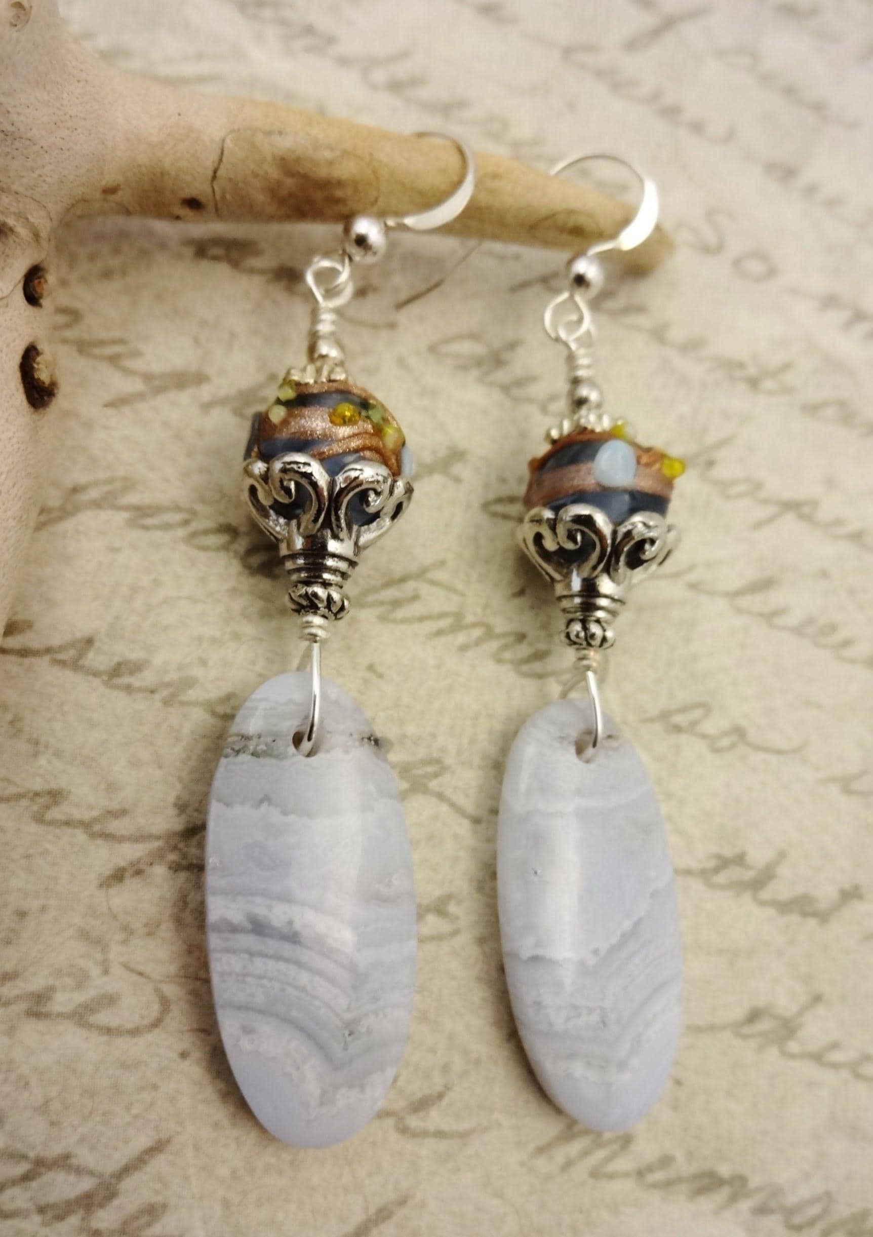 These earrings feature gemstone ovals of Blue Lace Agate that I wire wrapped with non-tarnish silver wire. Above the stones I added lovely blue Lampwork Glass beads sitting in silver-plated pewter heart shaped bead caps. Tiny Sterling Silver beads finish the stack.