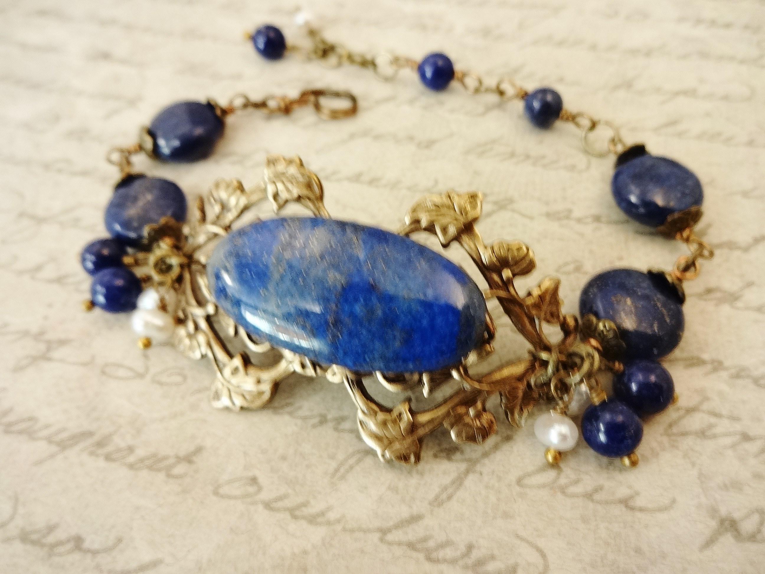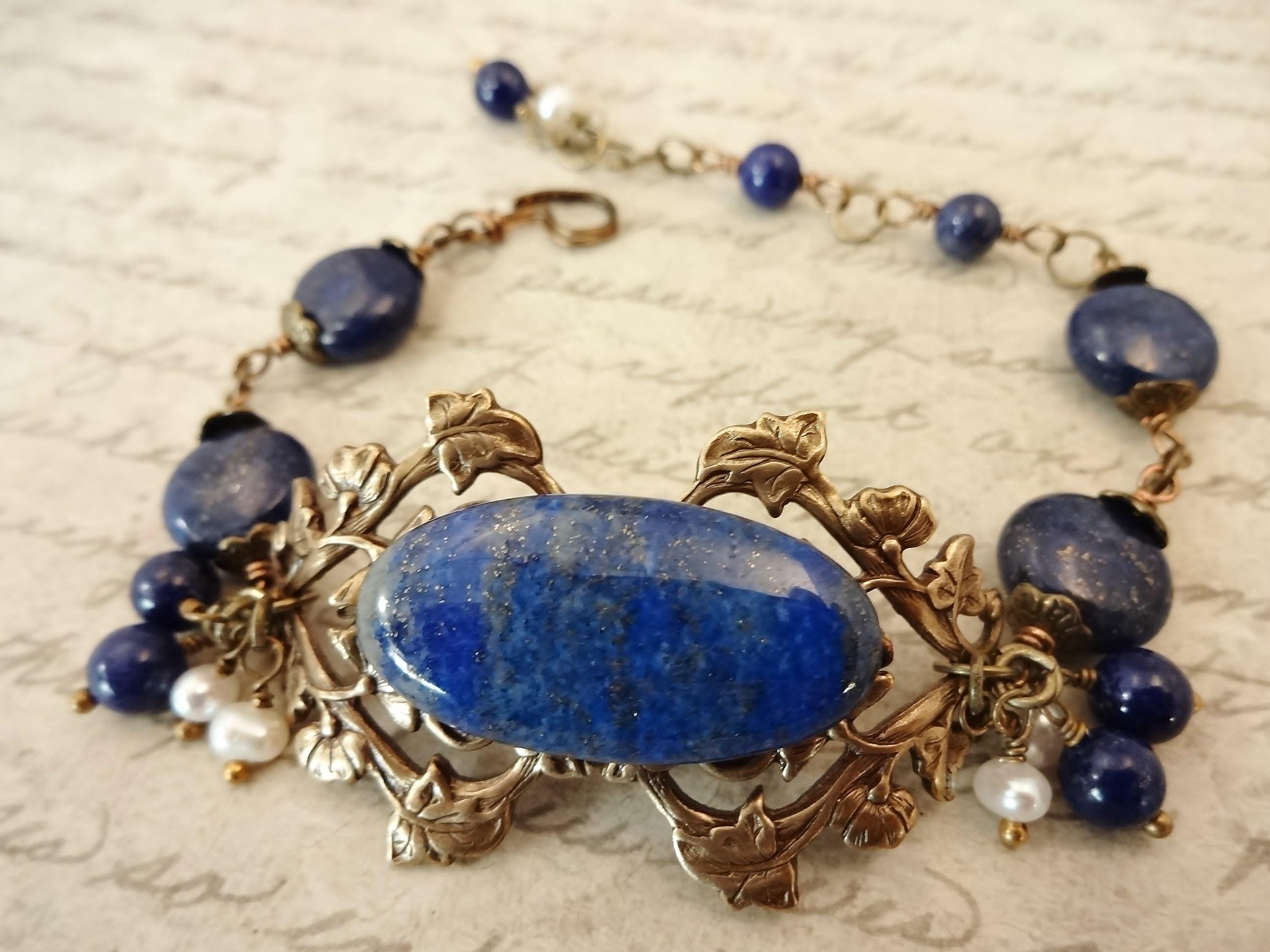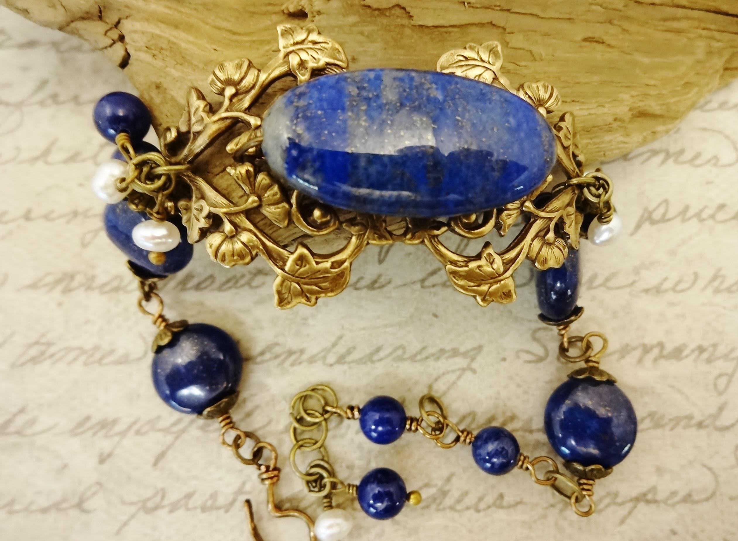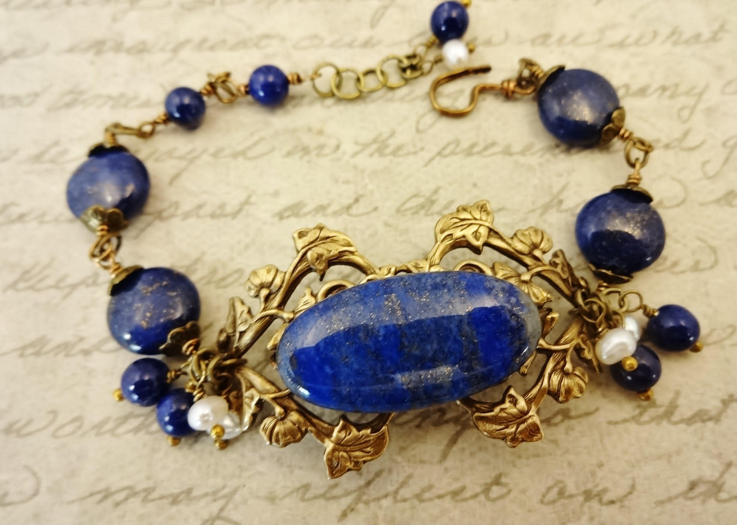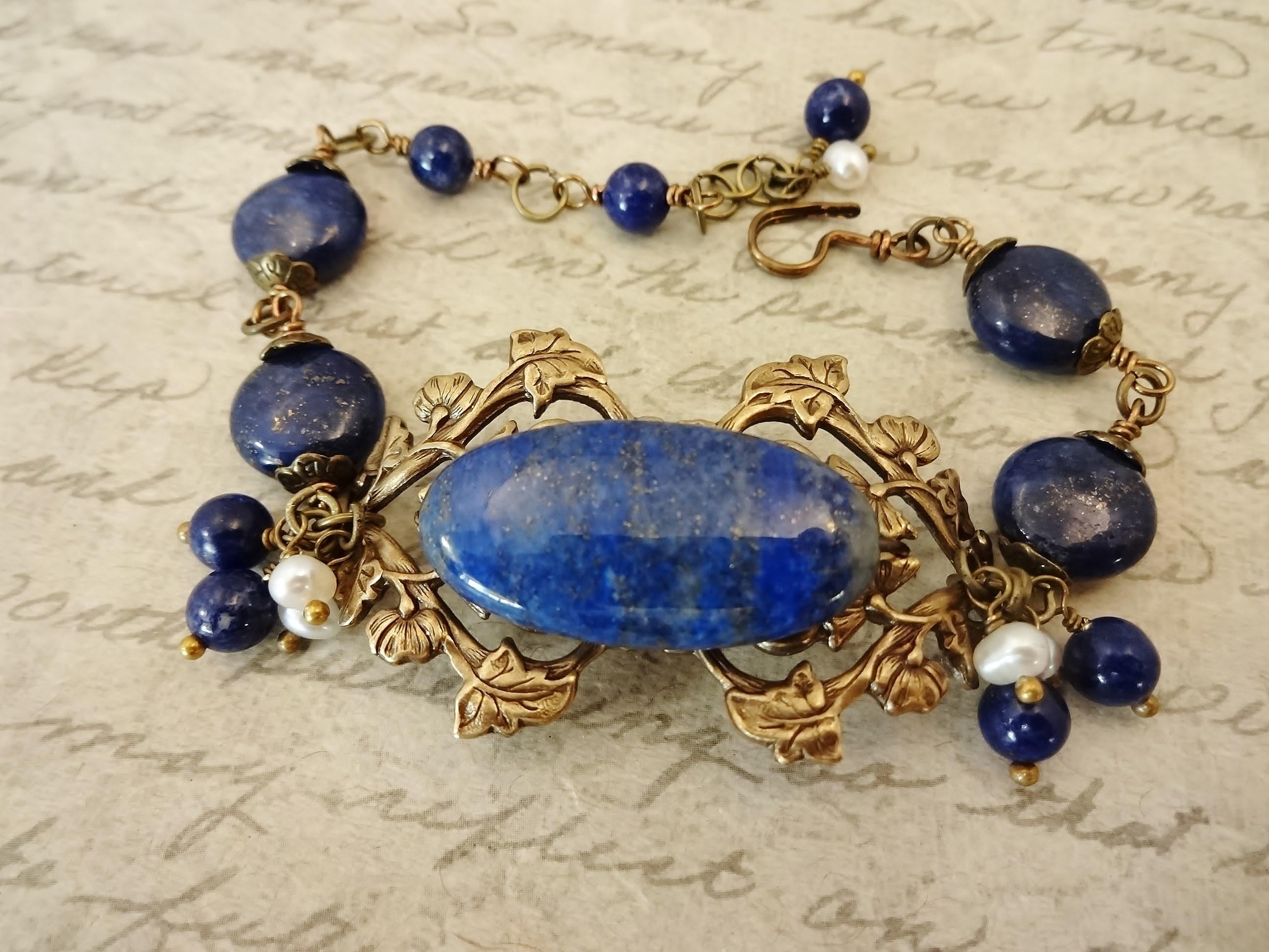 I wire wrapped Lapis coin beads and antique brass flower bead caps with the same gold wire making a chain for the bracelet sides. I wrapped a couple of 6mm Lapis beads and antique brass chain to one end of the bracelet. I added dangles of more 6mm Lapis and a few white pearls to each end of the filigree and to the end of the chain.