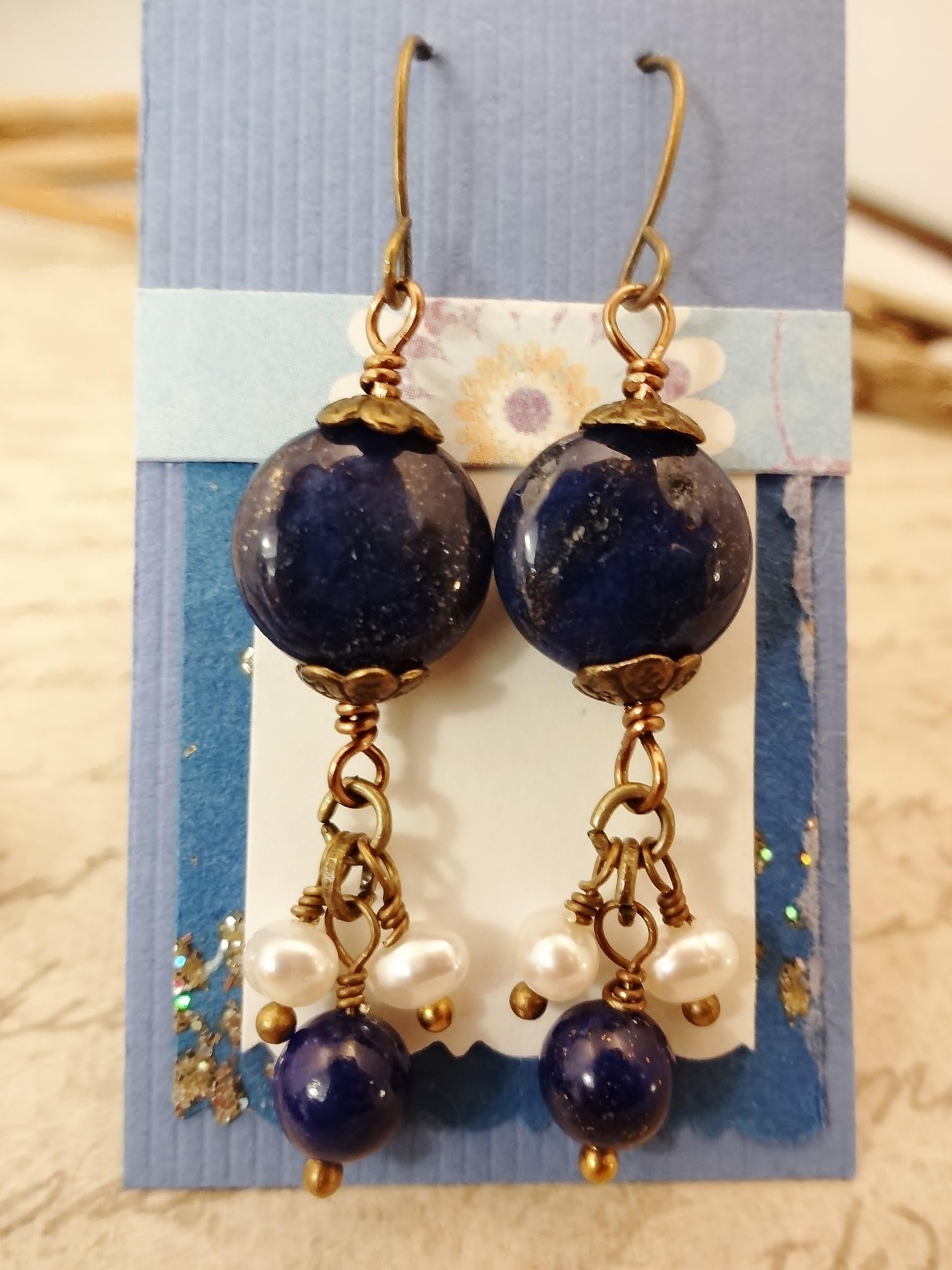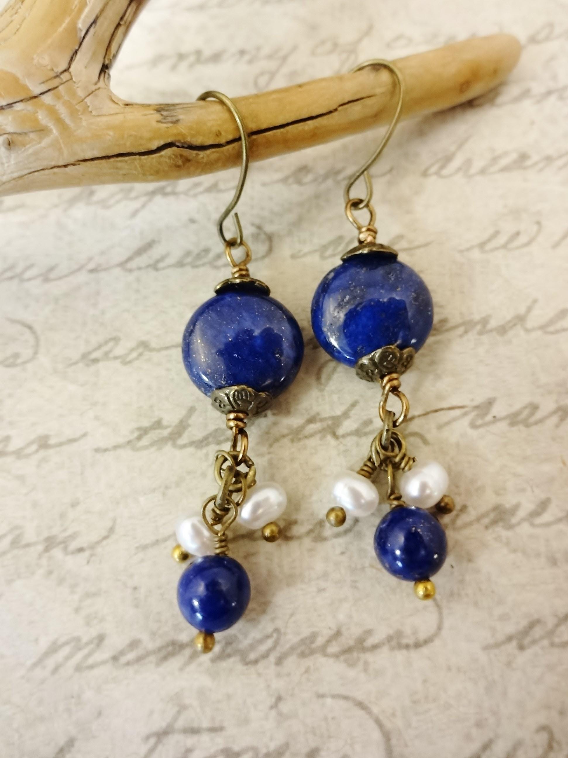 The earrings feature the same Lapis coins with dangles of 6mm rounds and white Pearls. The coins are hugged by antique brass flower bead caps, and the dangles are made with antique brass ball headpins. They measure about 2-1/4 inches in length. The ear wires are antique gold-plated steel. I also have the same metal in a lever back style; message me if you would prefer those. I also have 14k gold Fill ear wires in the Add-On section.