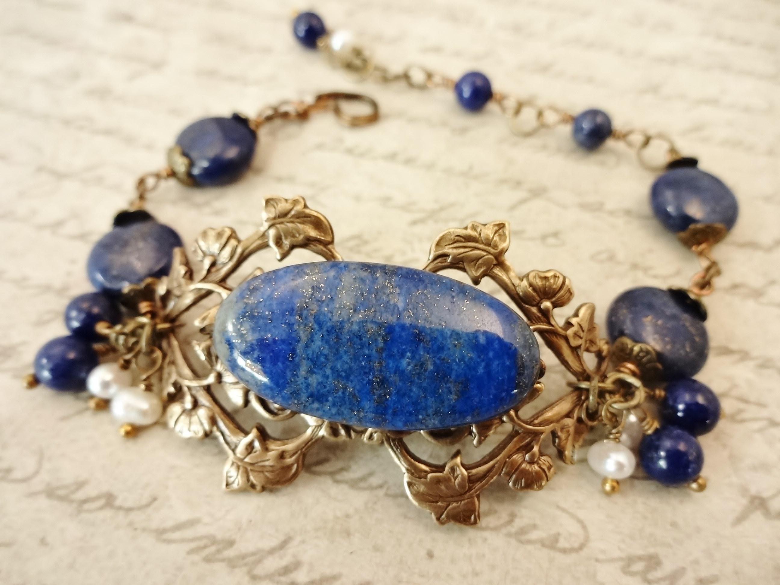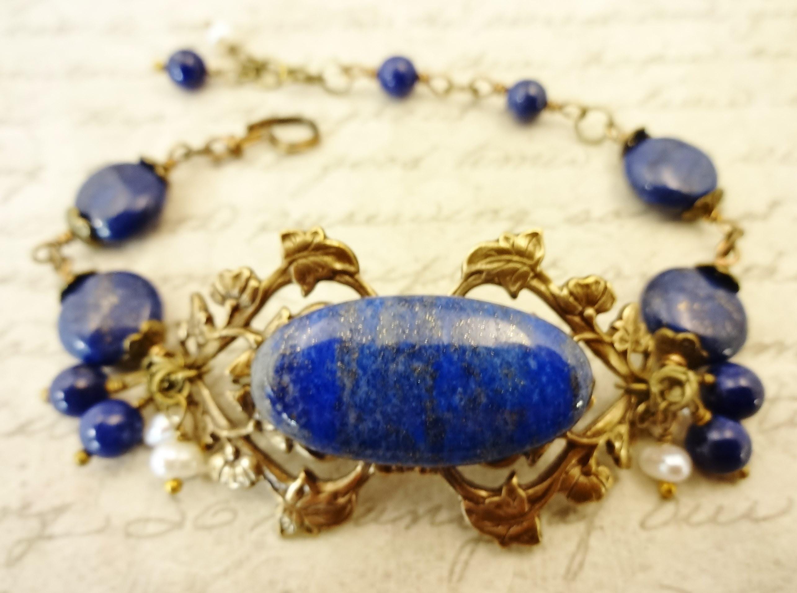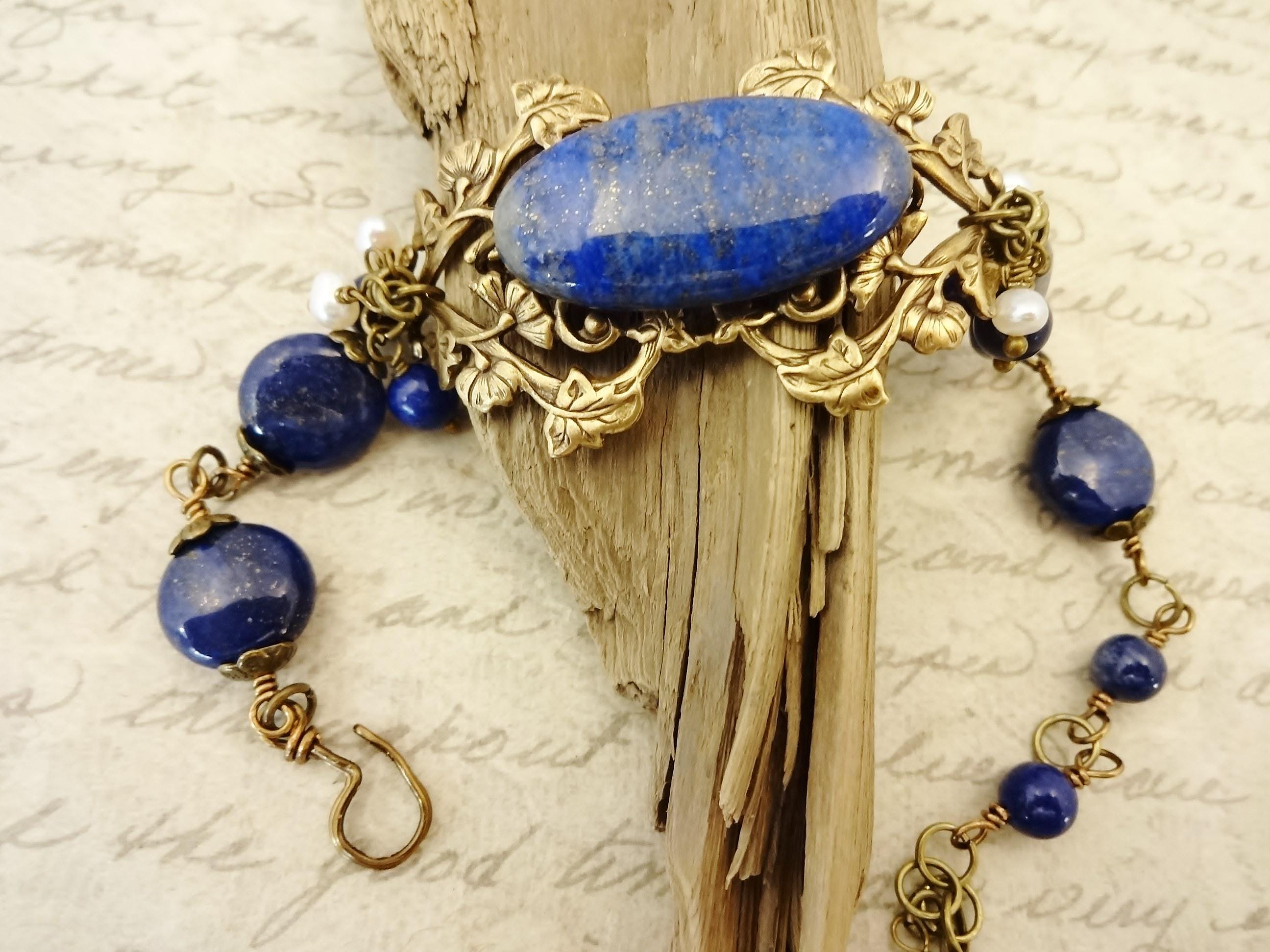 This bracelet started with the antique brass centerpiece. I gently bent the metal into a curve to perfectly fit the curve of a wrist, then wrapped a large flat oval Lapis bead to the center with antique brass non-tarnish wire.