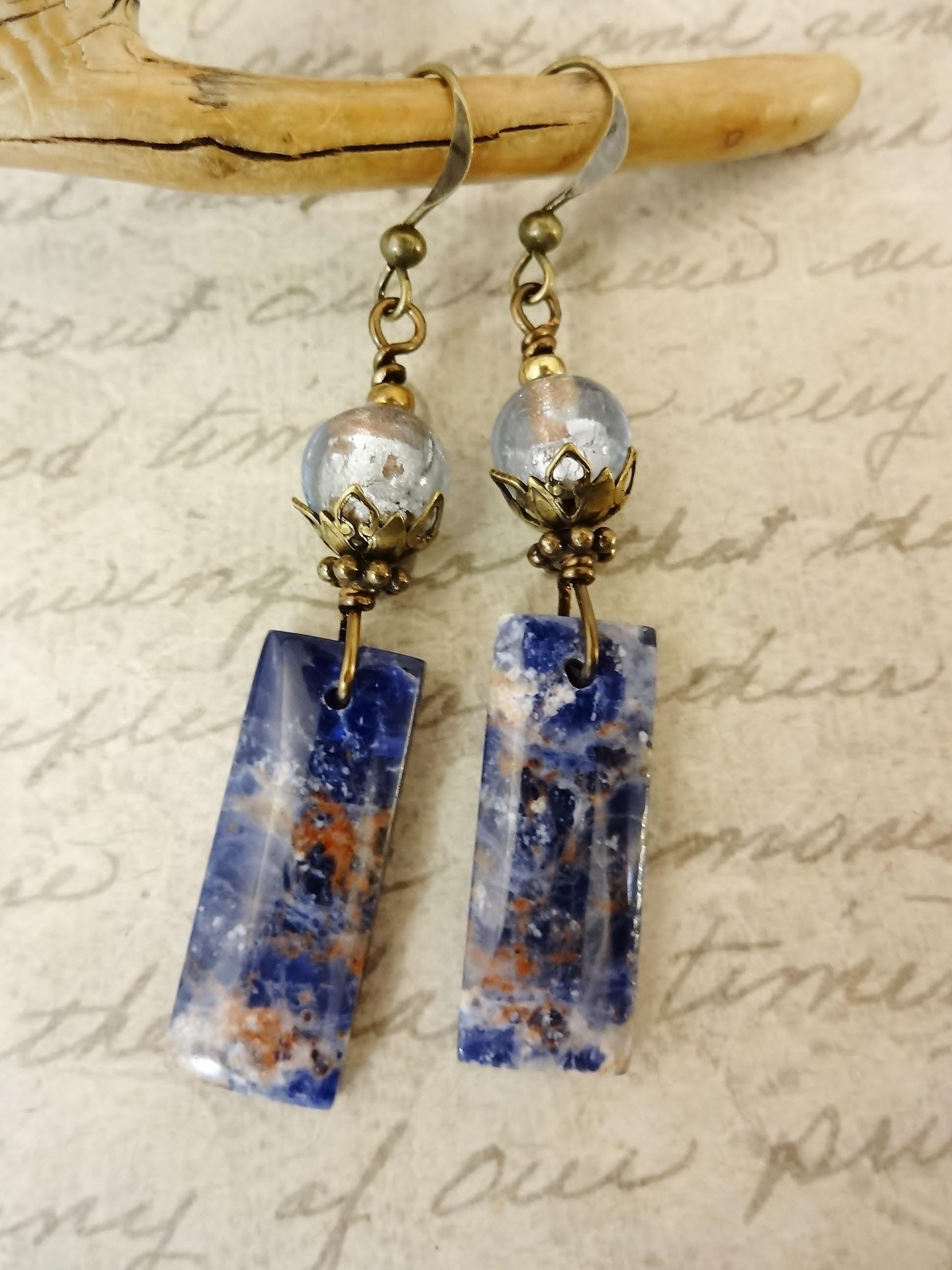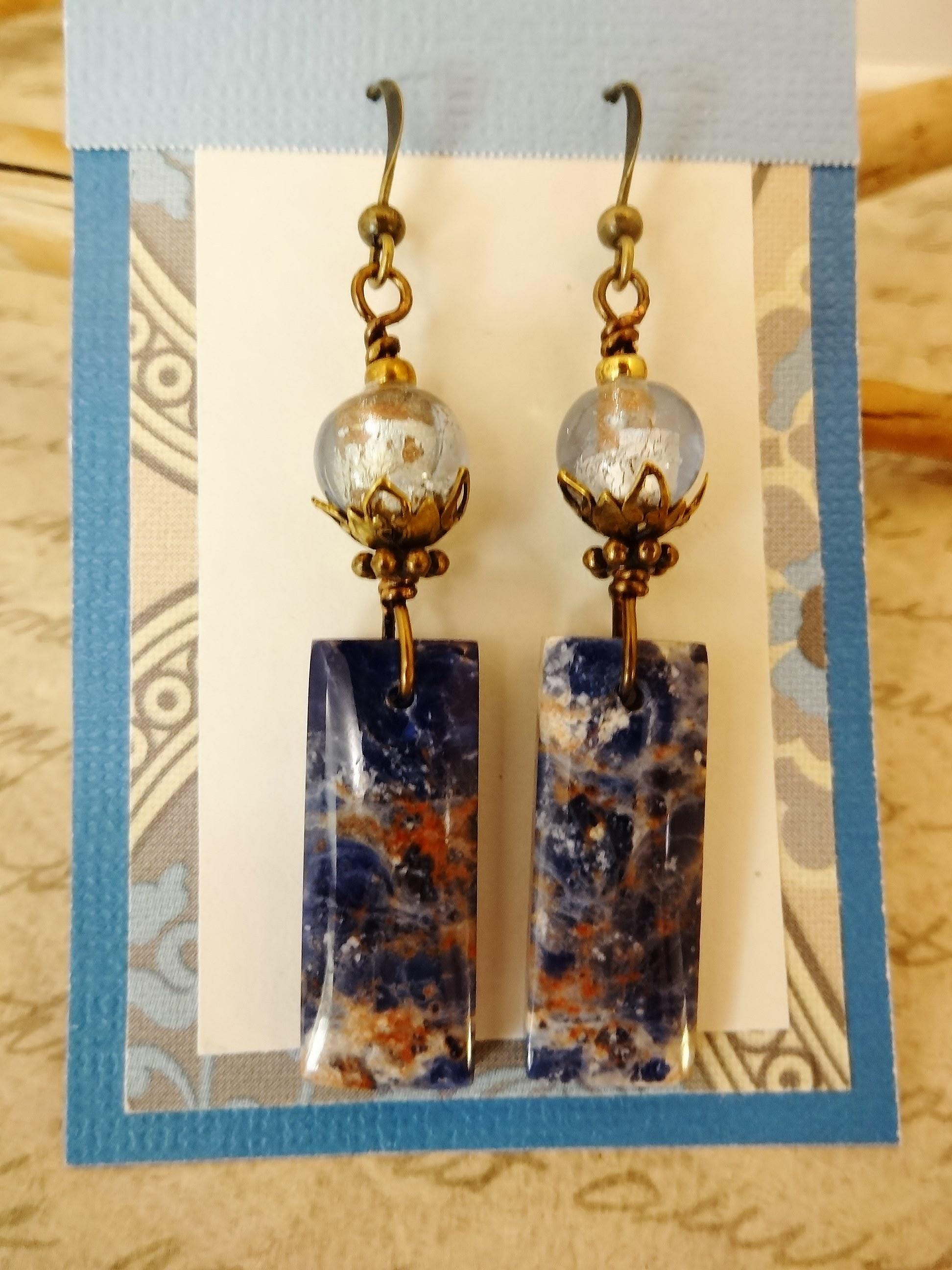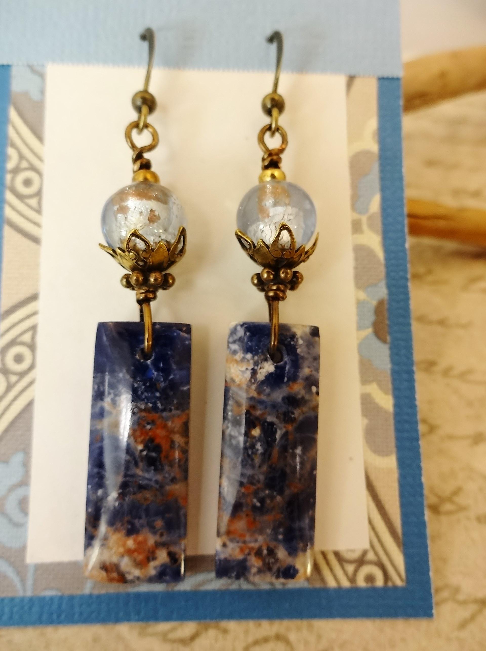 Natural Orange Sodalite Gemstone Earrings: with Foil Glass and French Hook Ear Wires