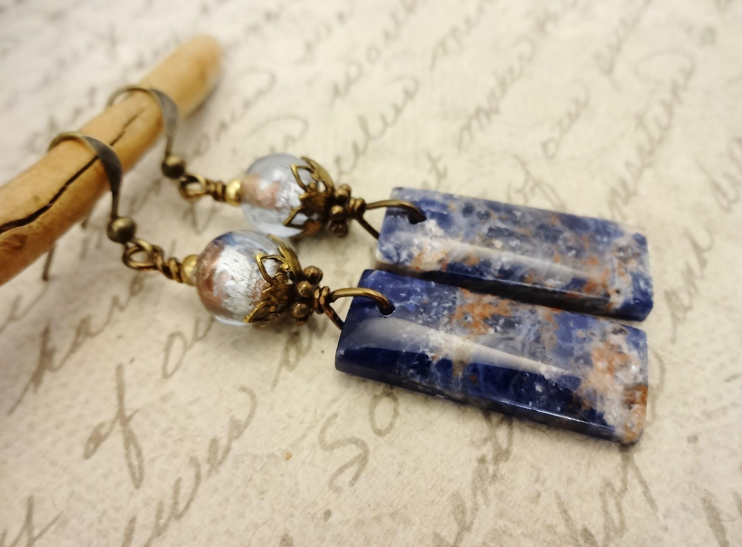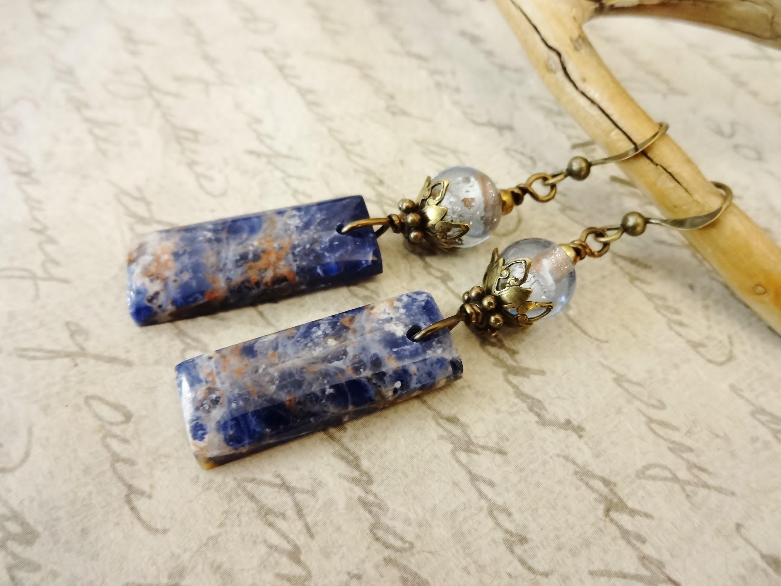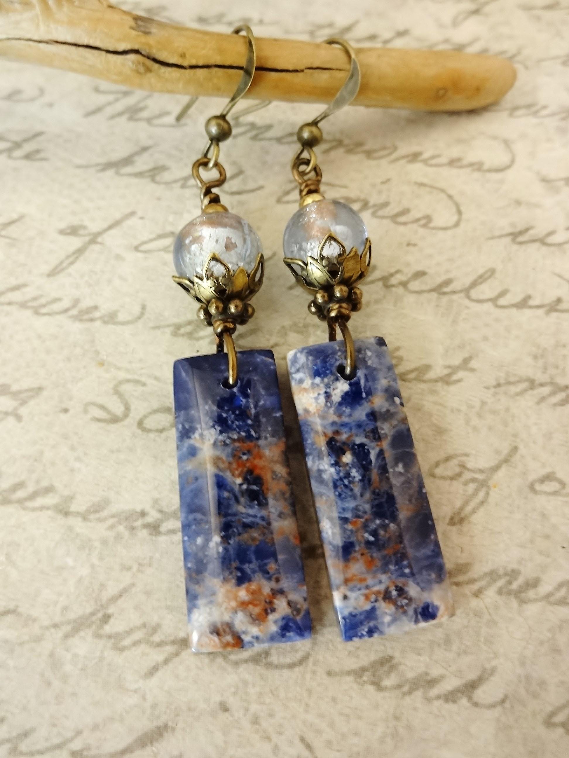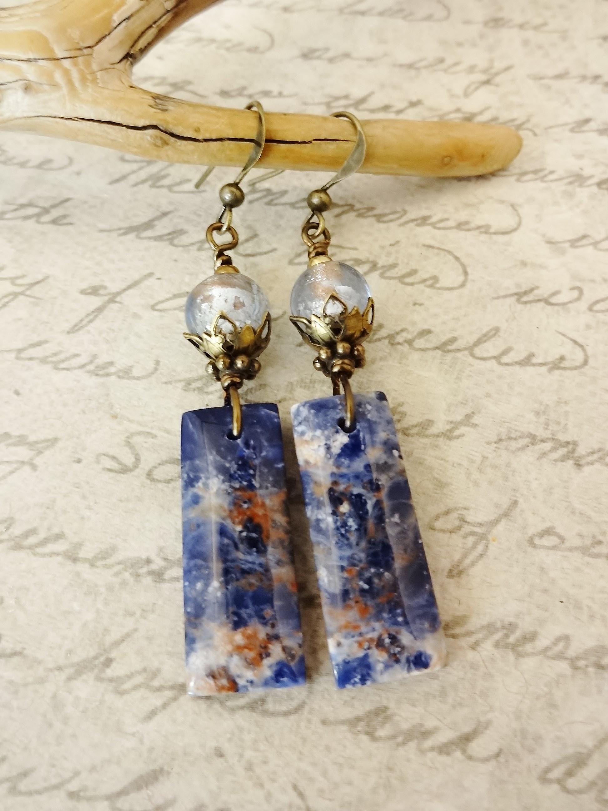 Natural Orange Sodalite Gemstone Earrings: with Foil Glass and French Hook Ear Wires