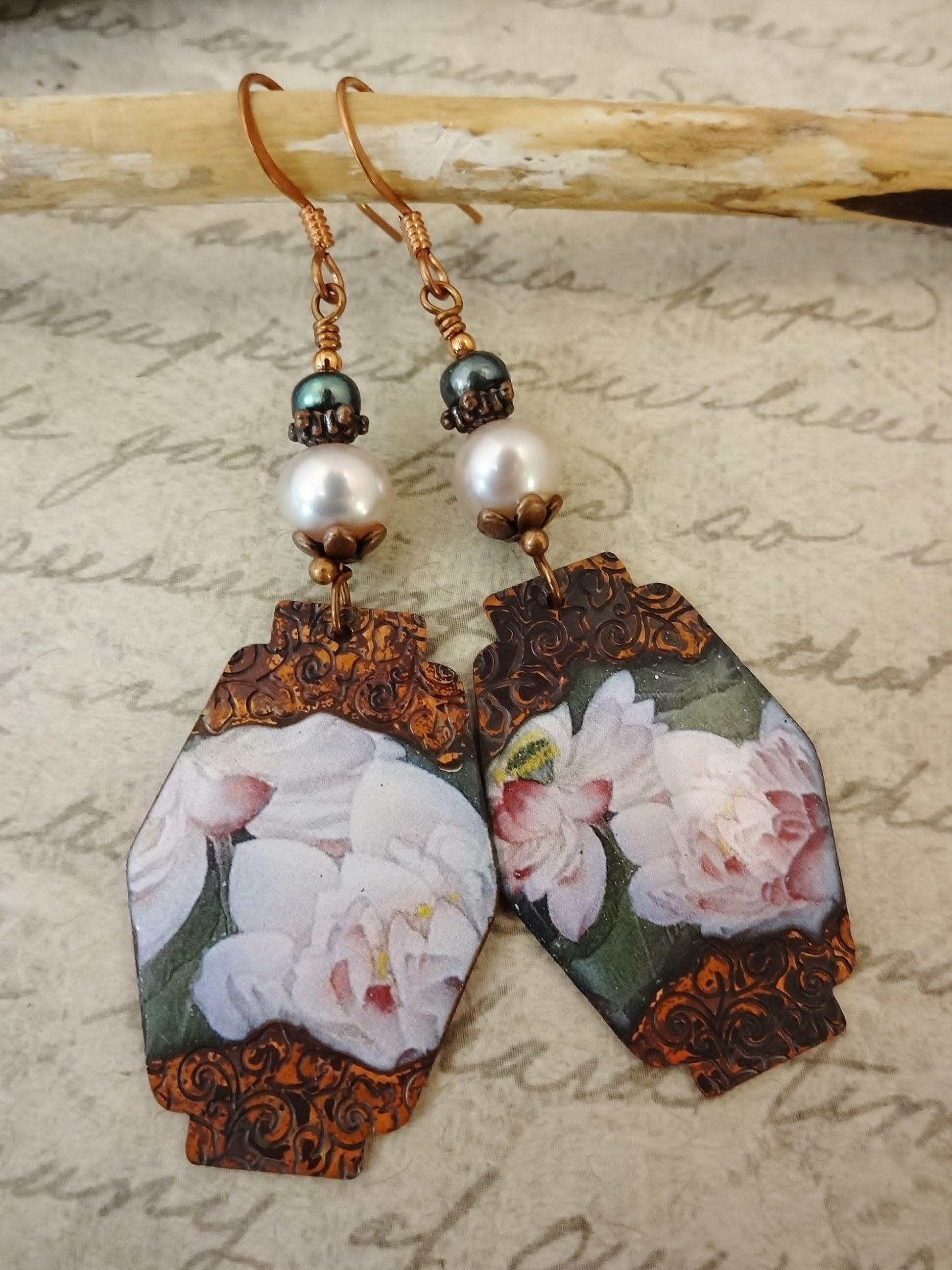 Rustic Handmade Enamel Earrings: Pink and Green Floral and Pearl Earrings