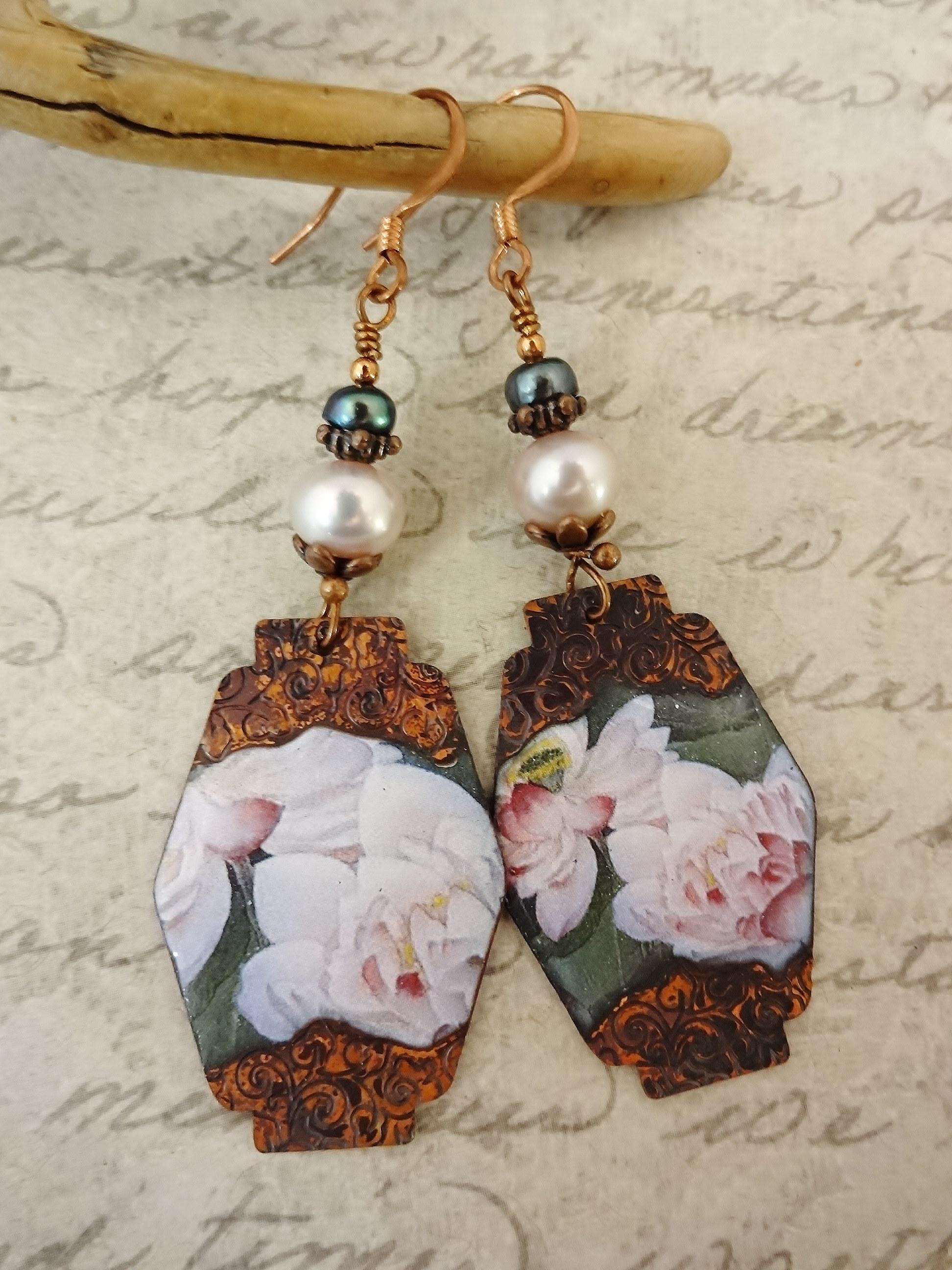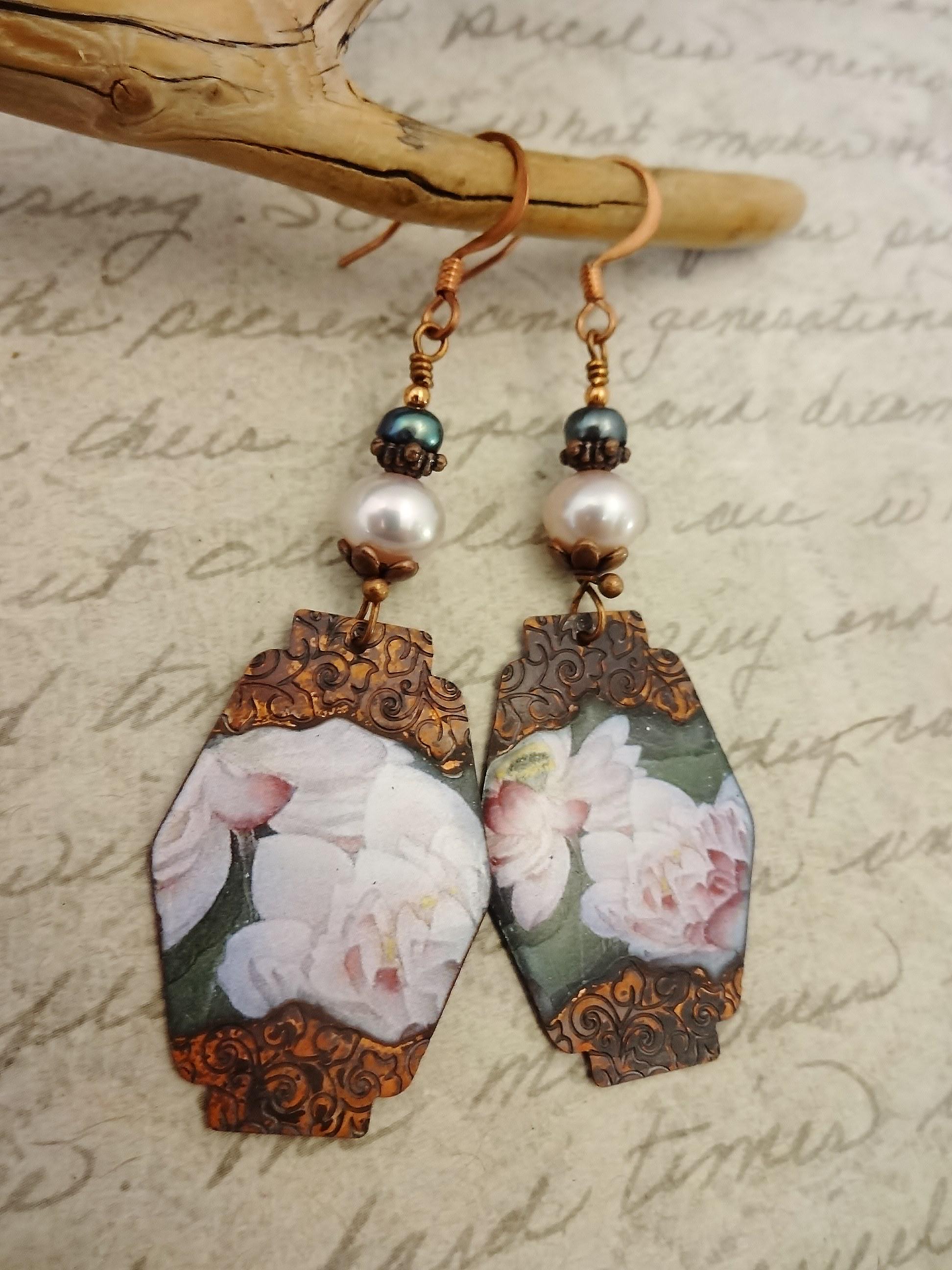 These gorgeous enamel charms were made by a talented French artisan. She stamped and aged the copper along the top and bottom edges and then enameled the middle with pink flowers and a dark green background. The colors are rich and gorgeous, and the rustic exposed copper adds to the boho charm.