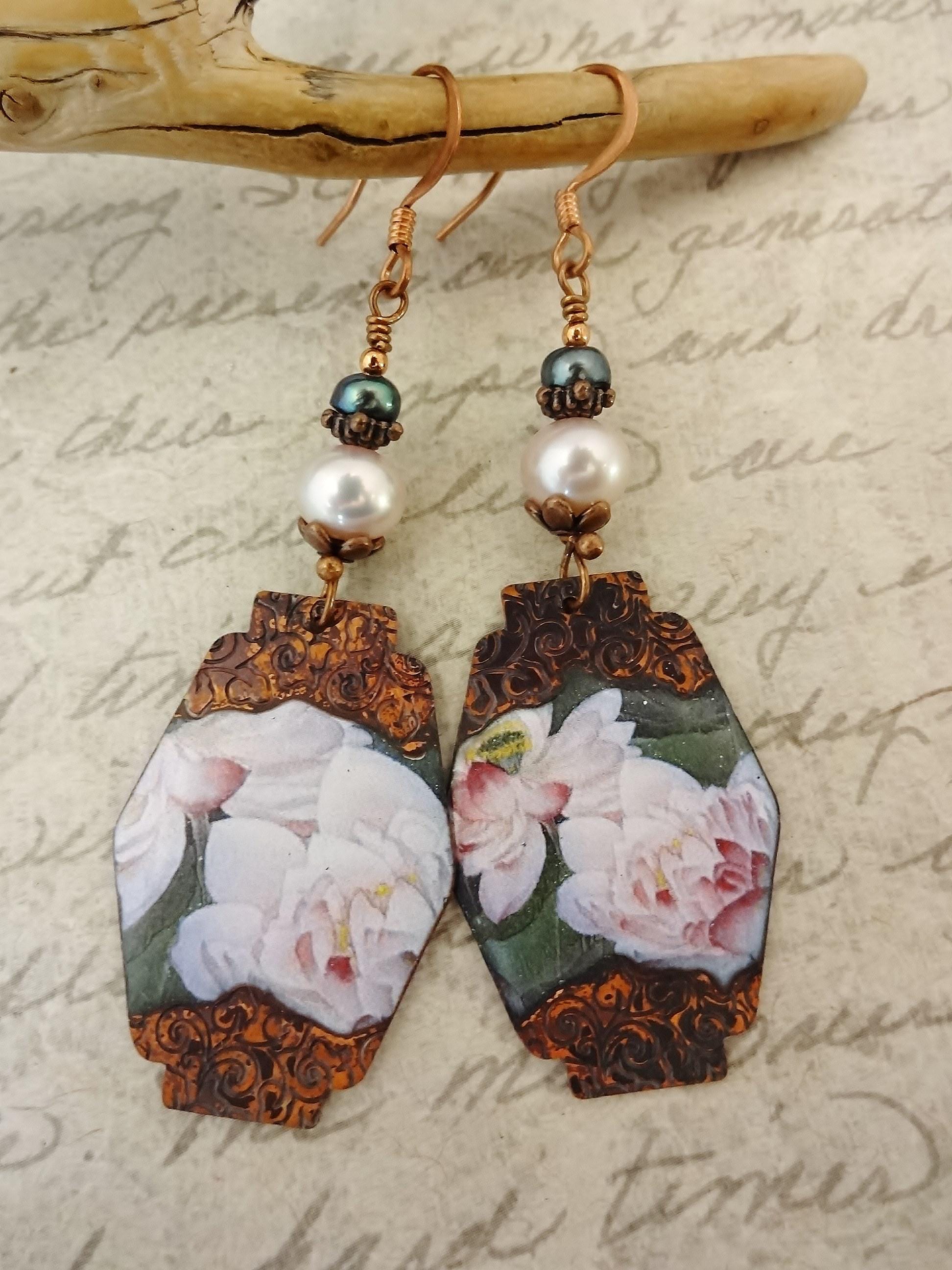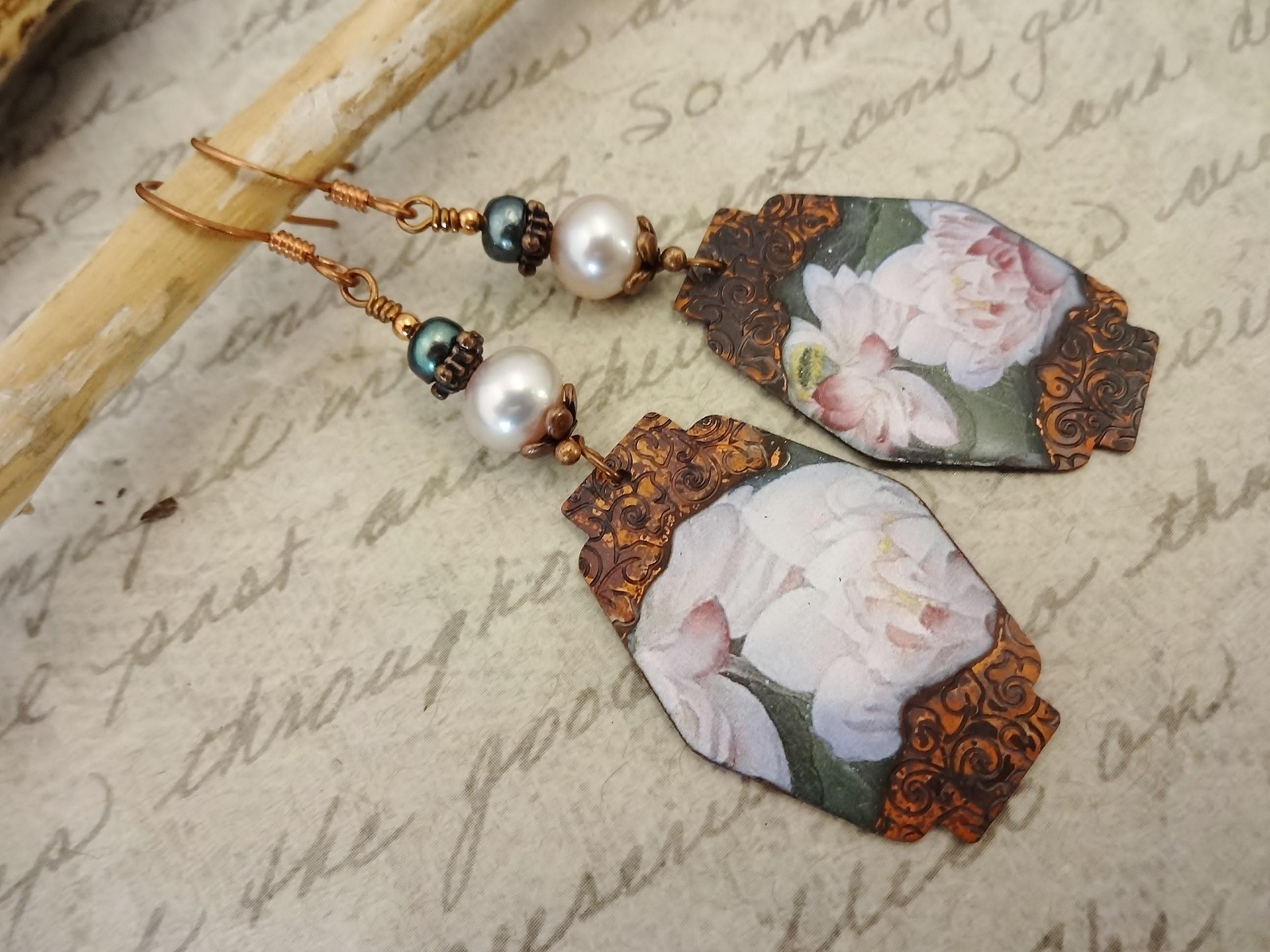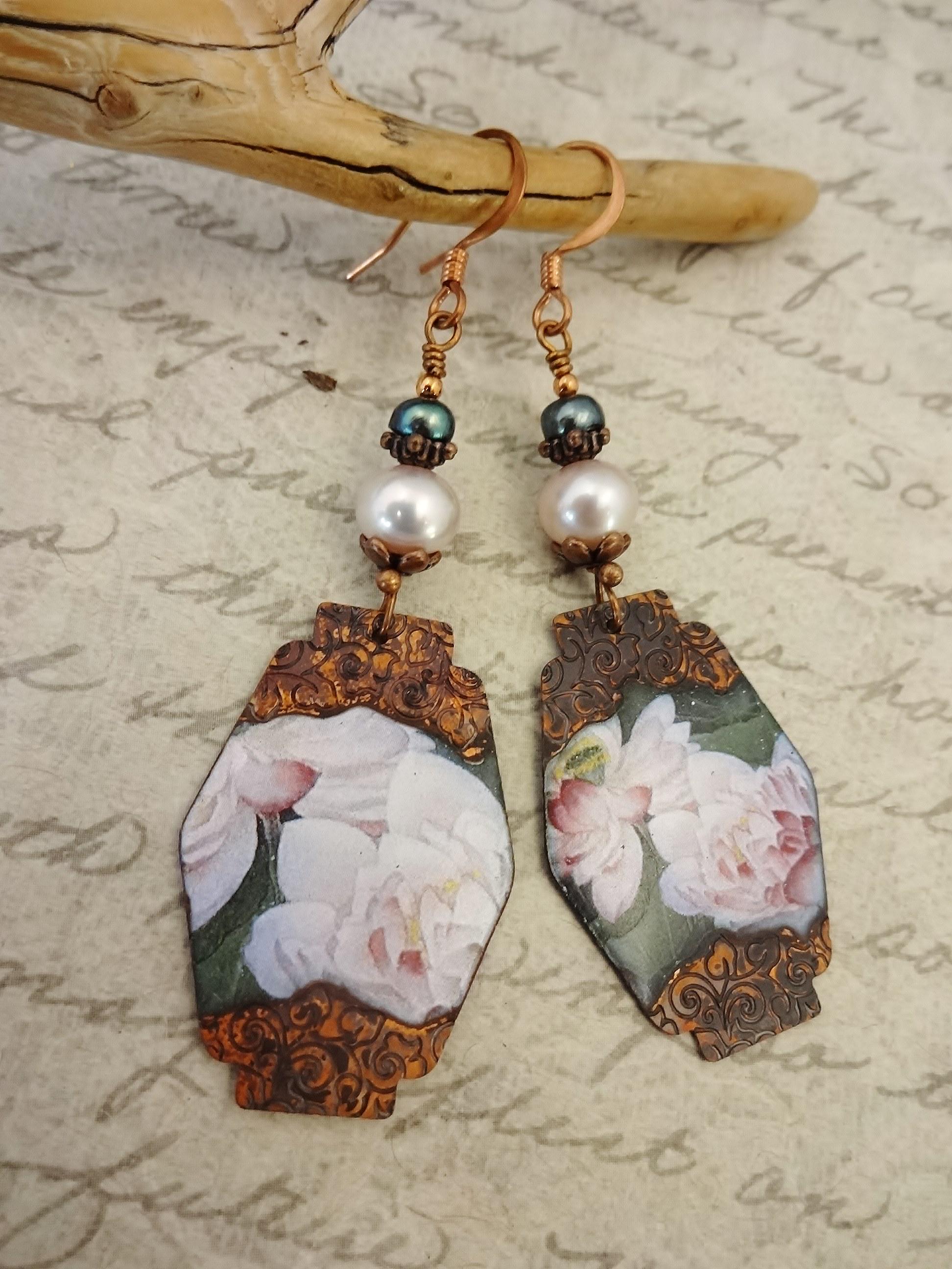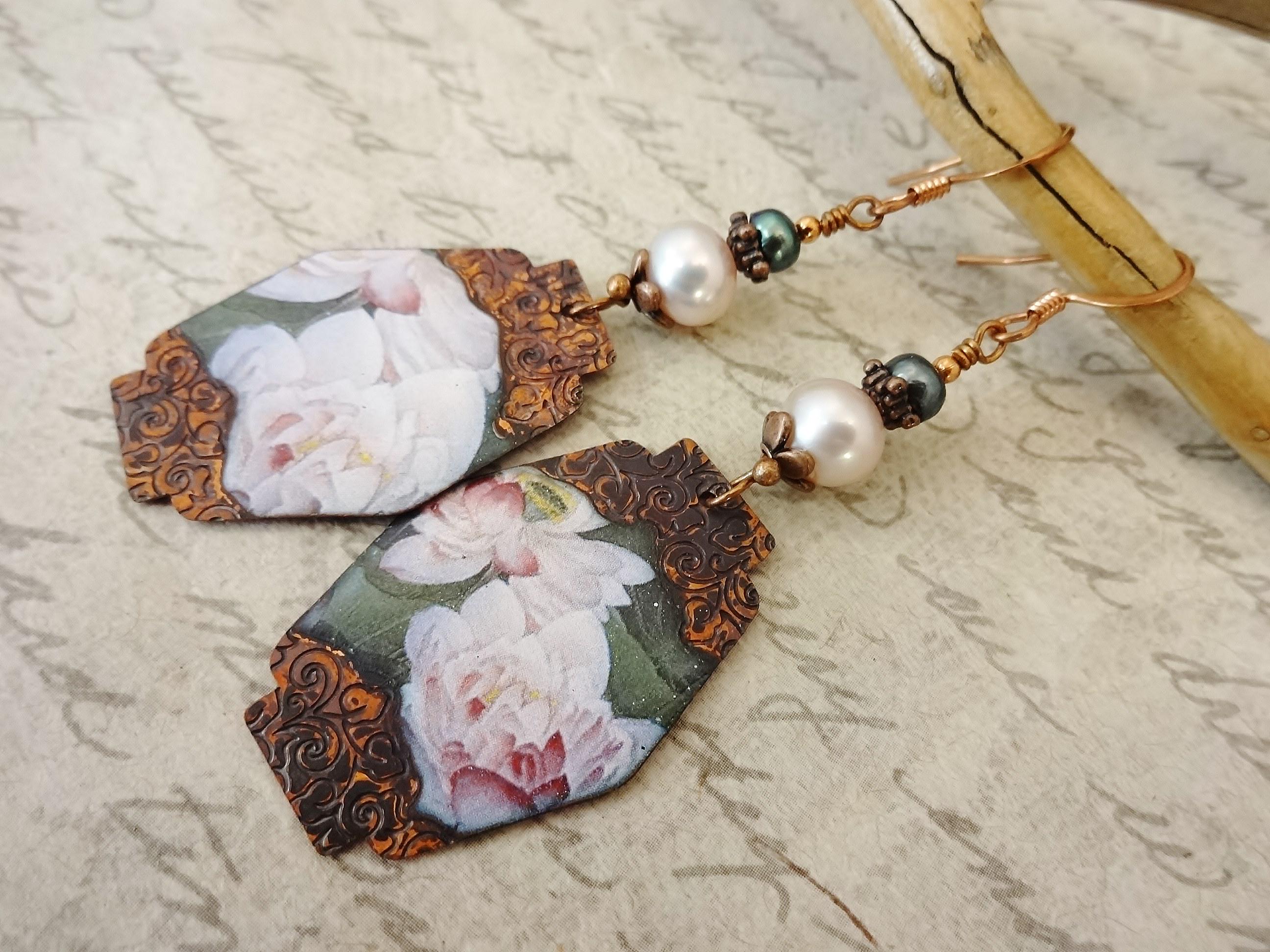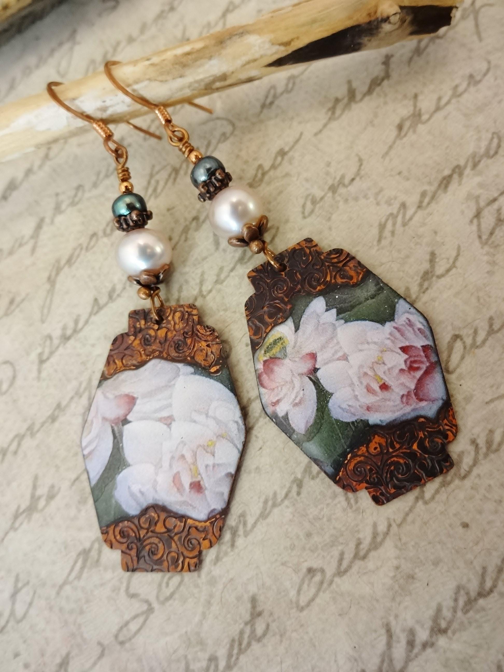 Rustic Handmade Enamel Earrings: Pink and Green Floral and Pearl Earrings