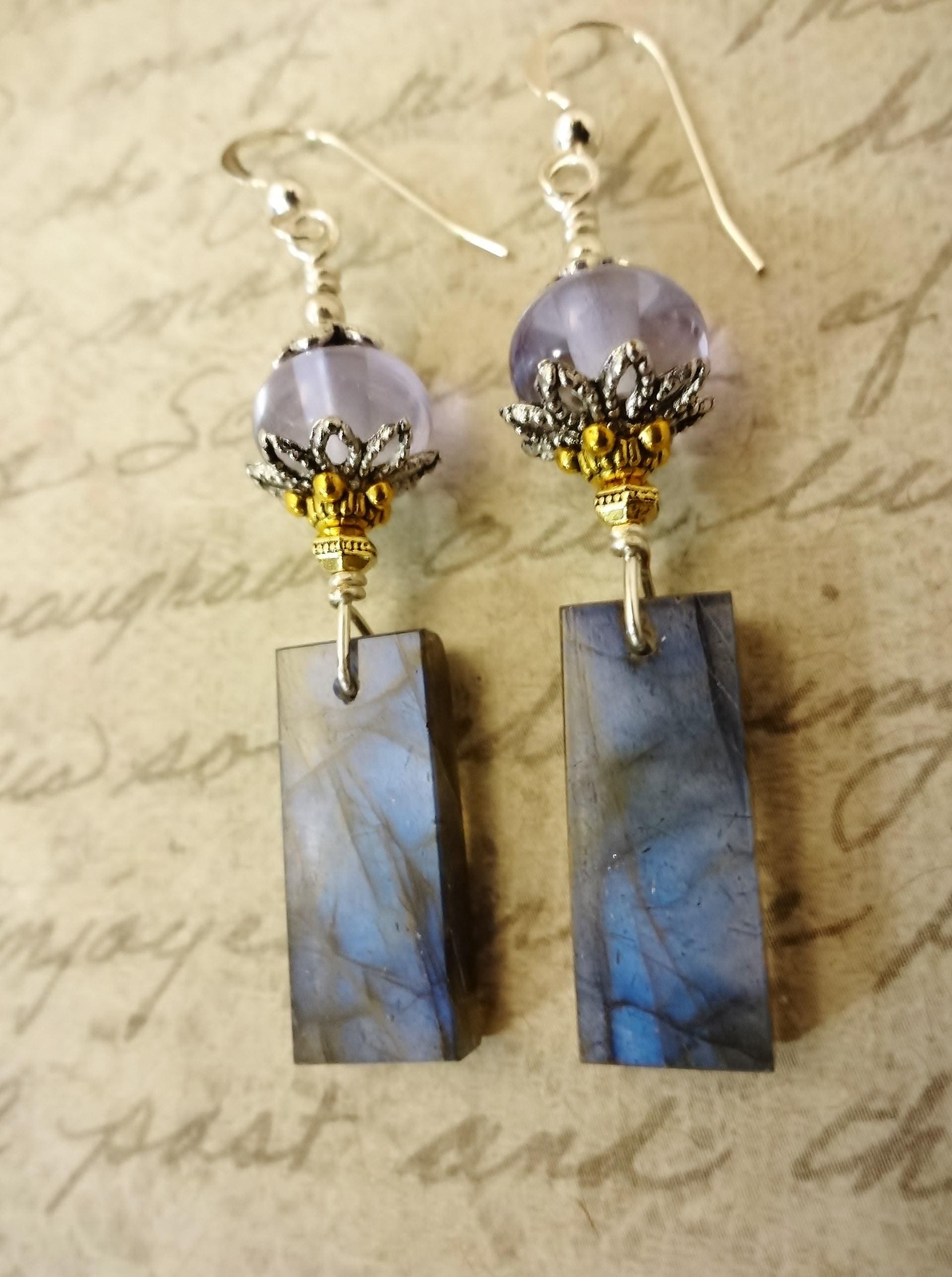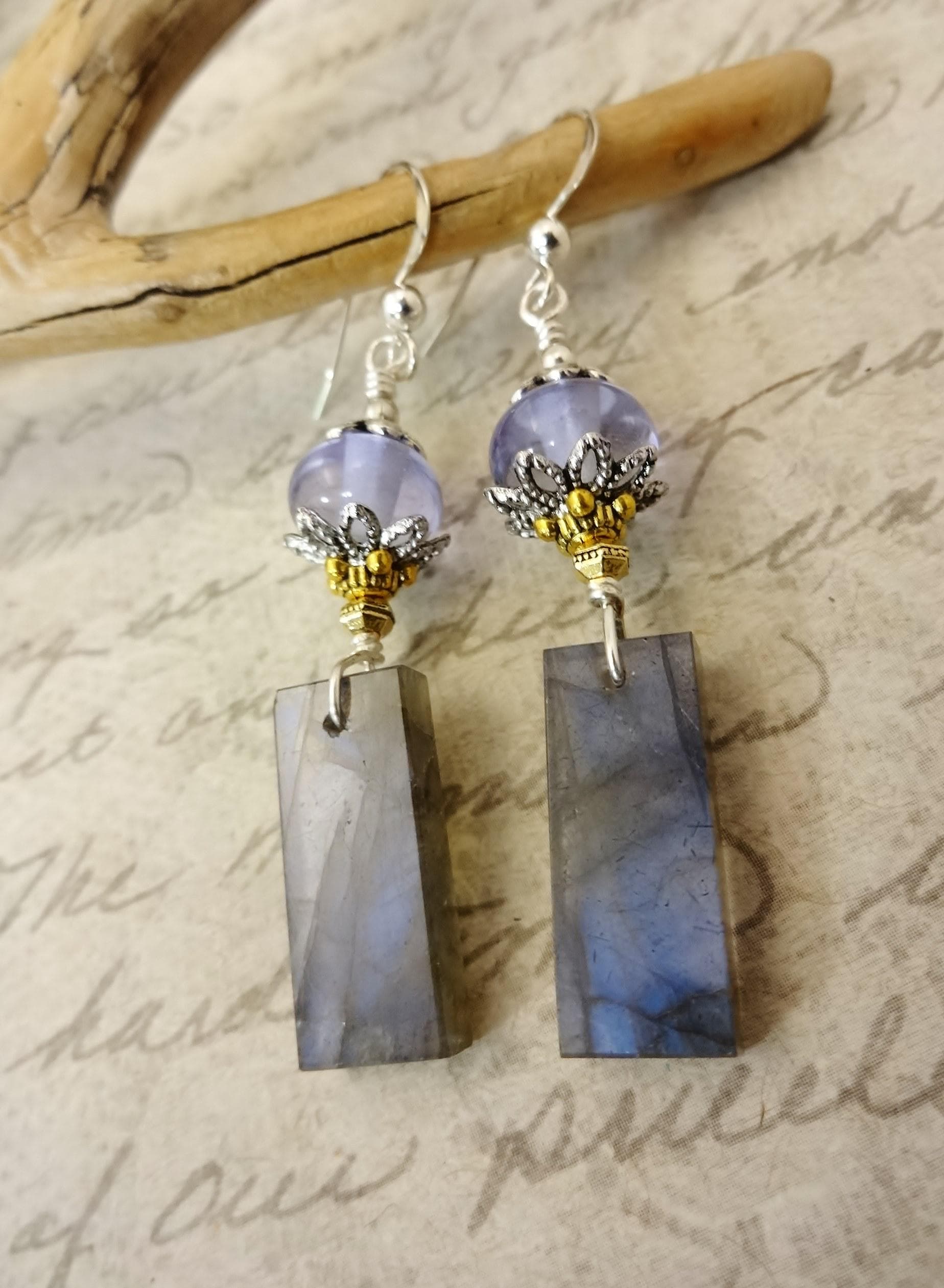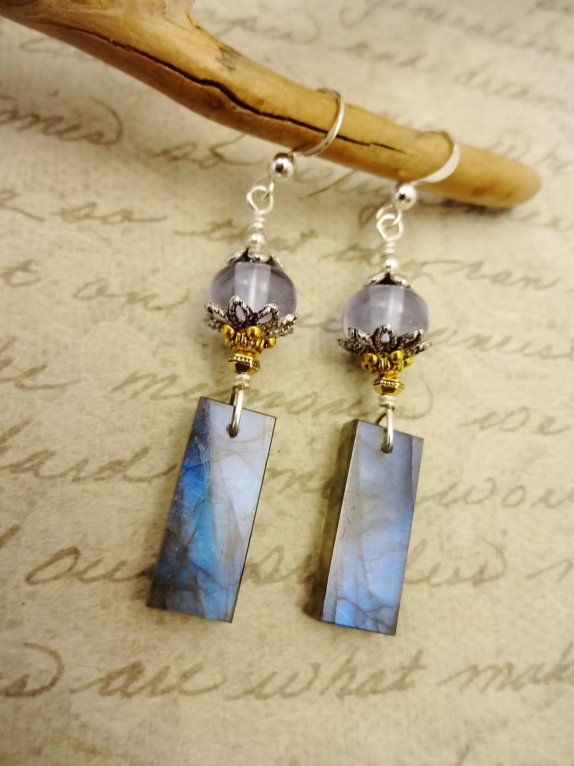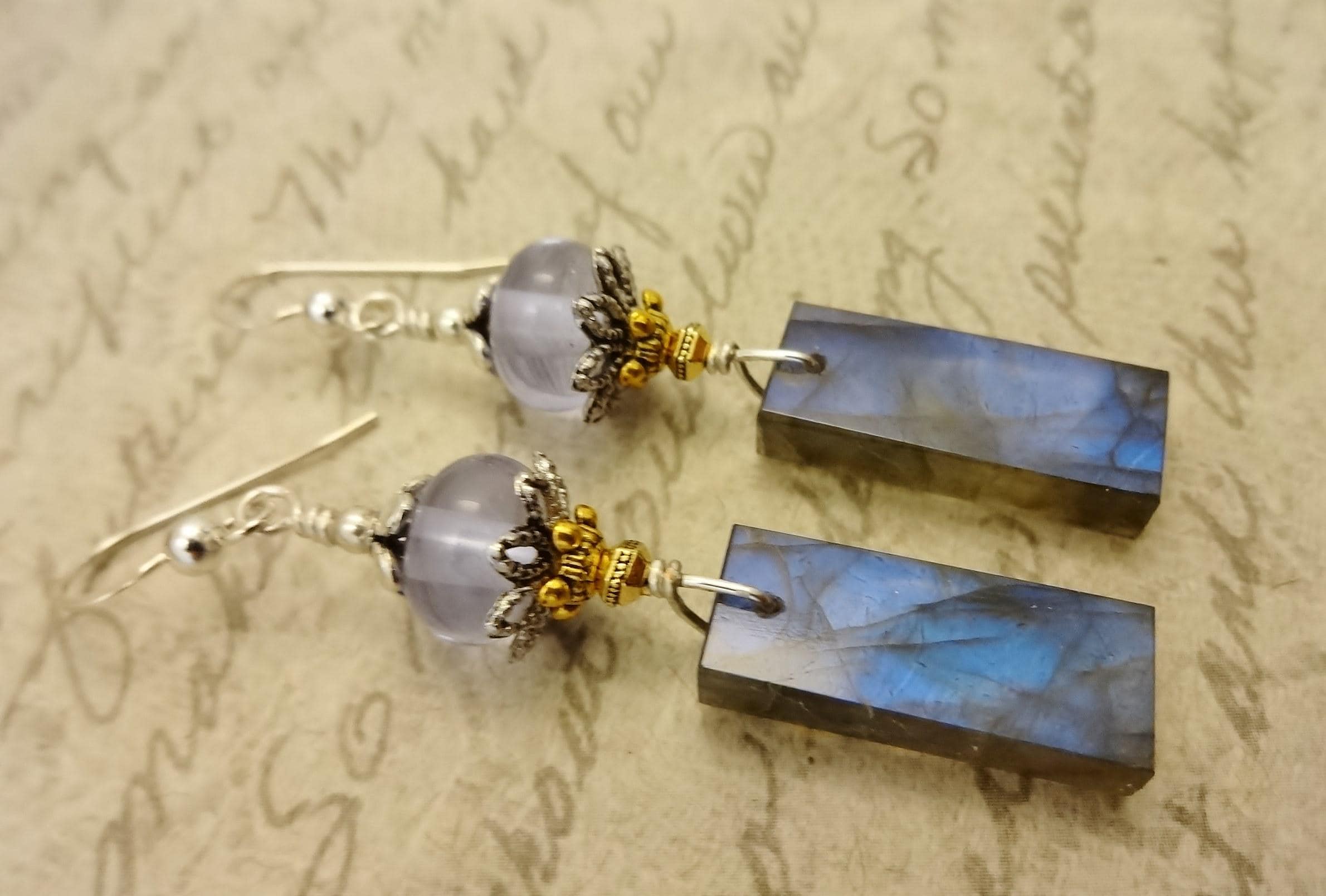 These one-of-a-kind earrings feature Labradorite gemstones in a rectangular shape. There's plenty of blue flash in these stones as you can see in the photos.