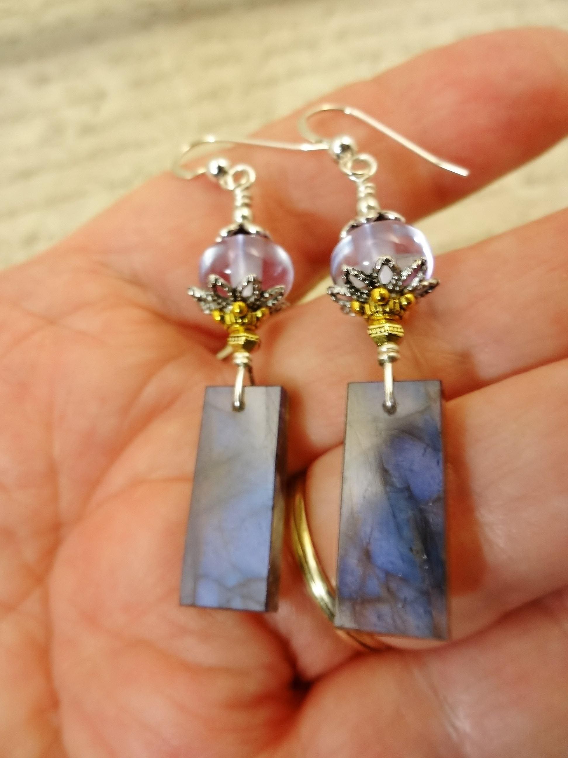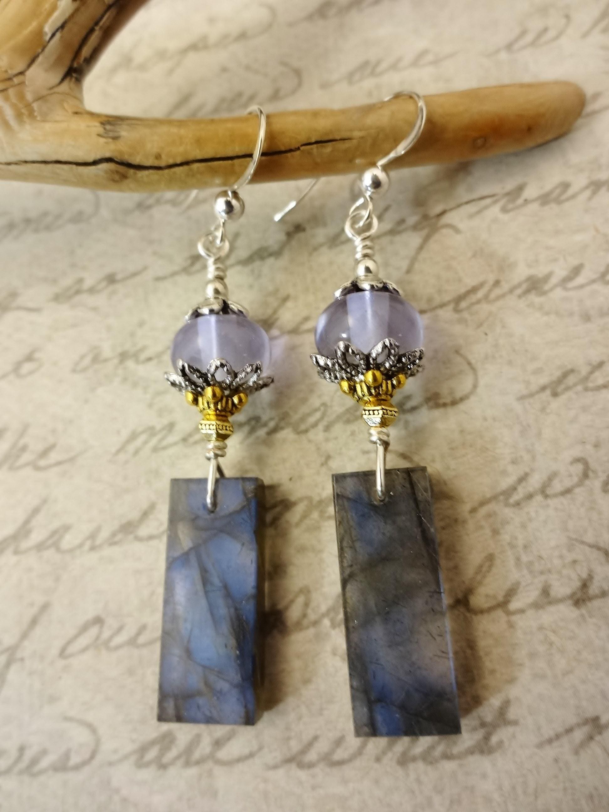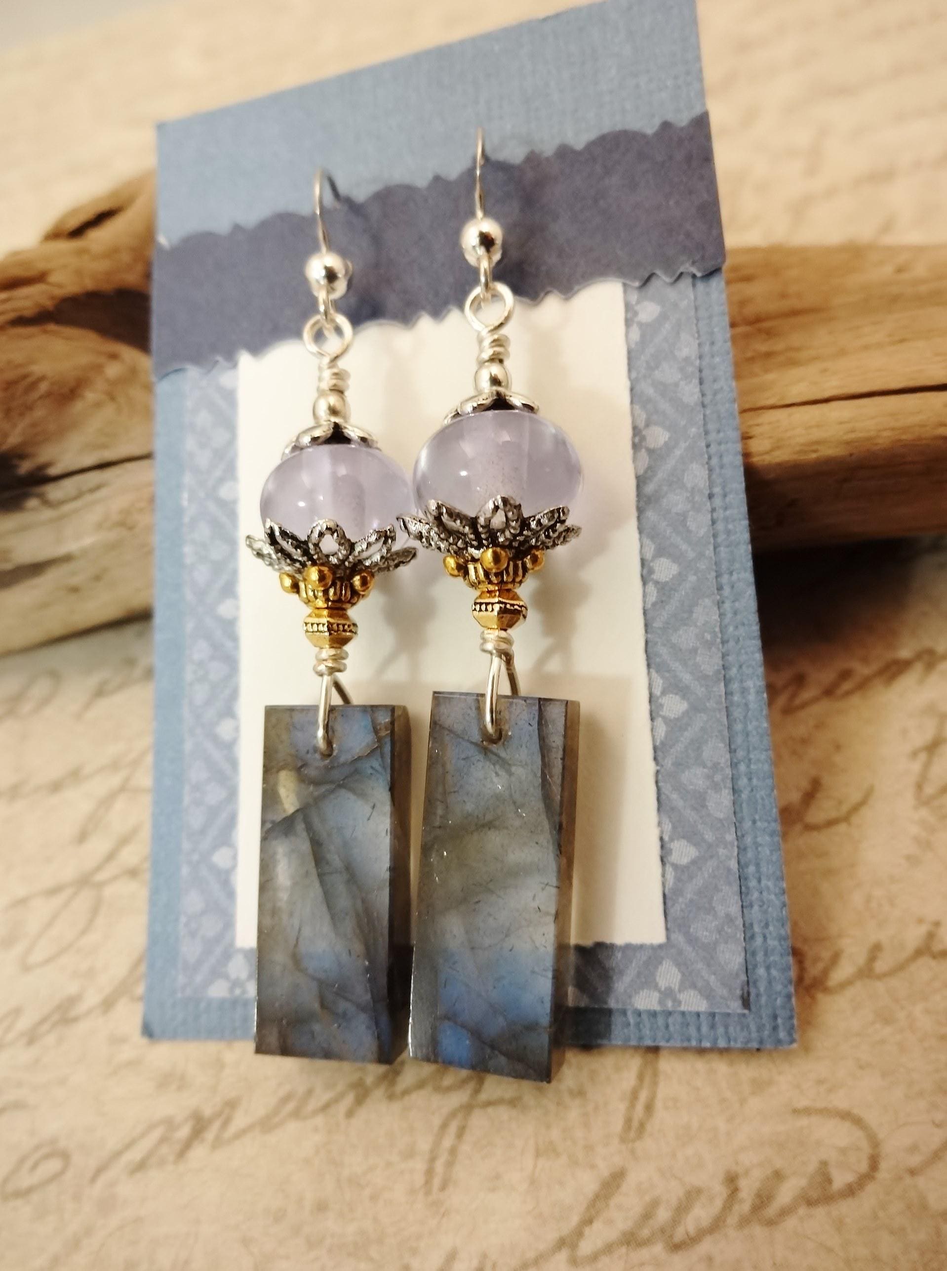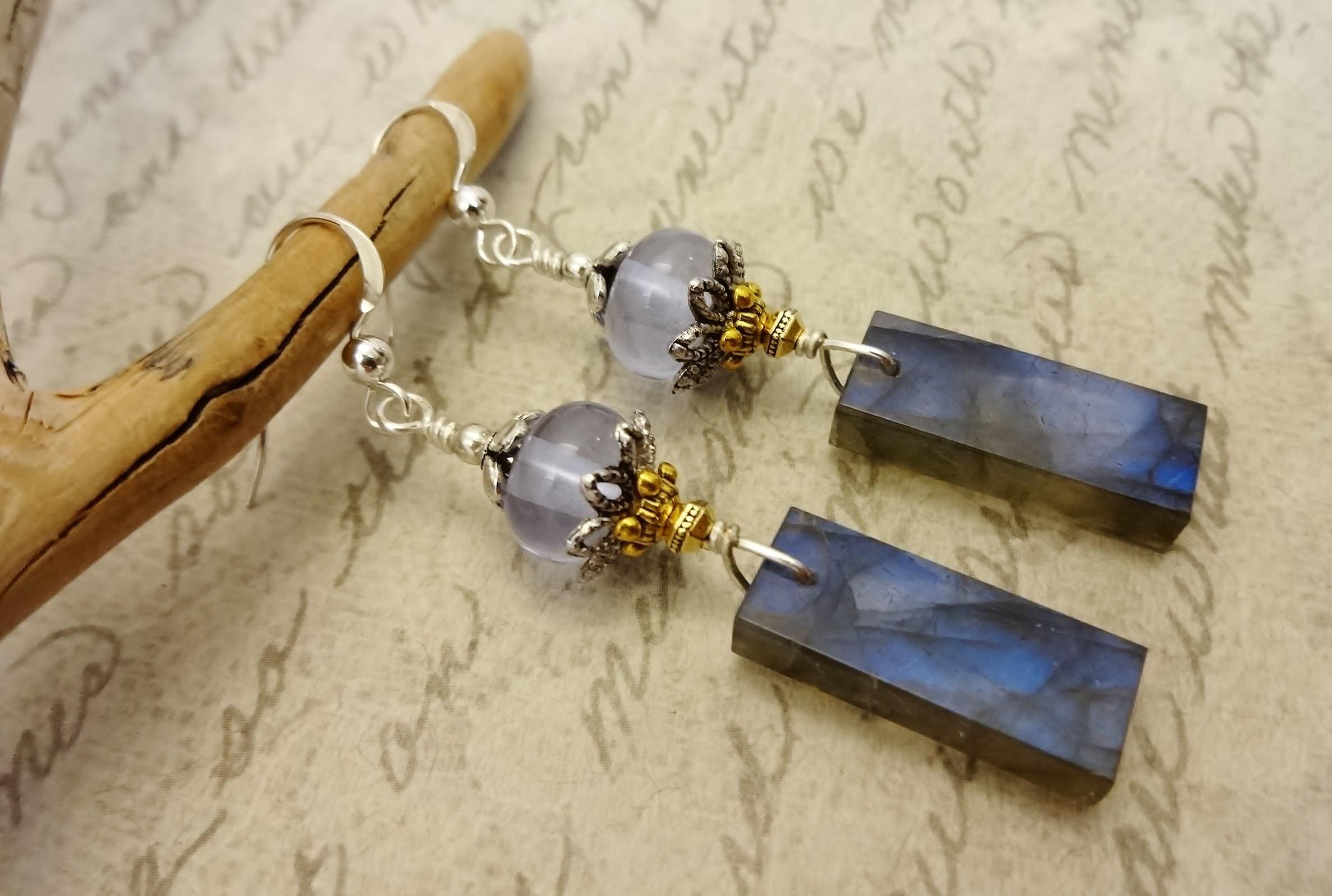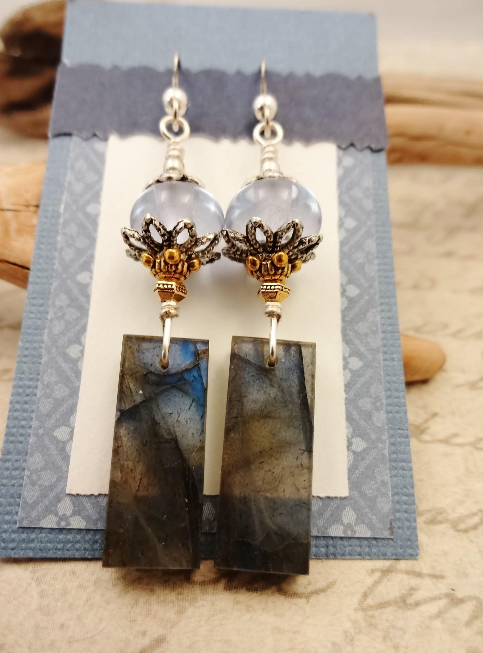 Labradorite Earrings with Lampwork Glass: Blue Flash Gemstone