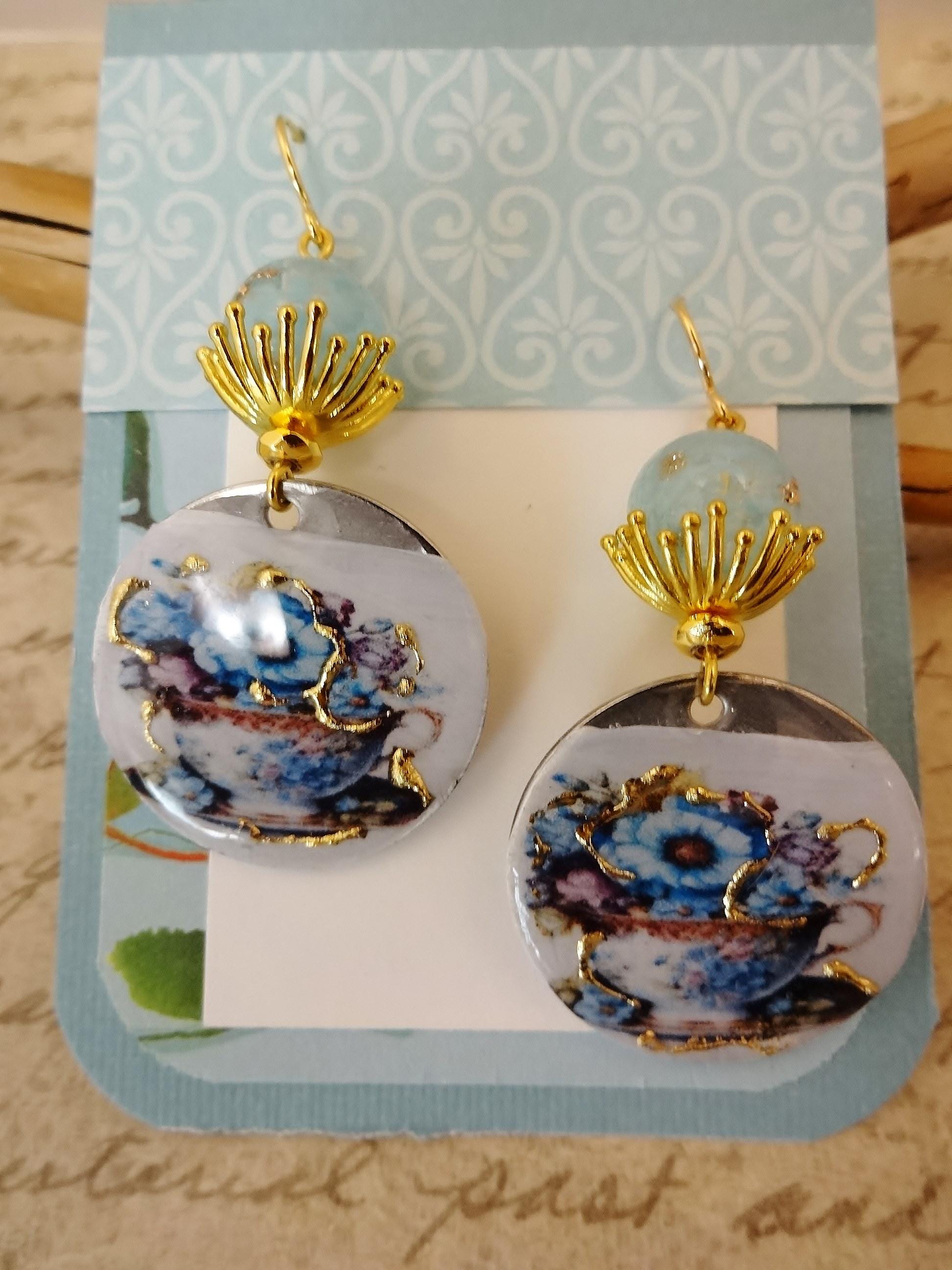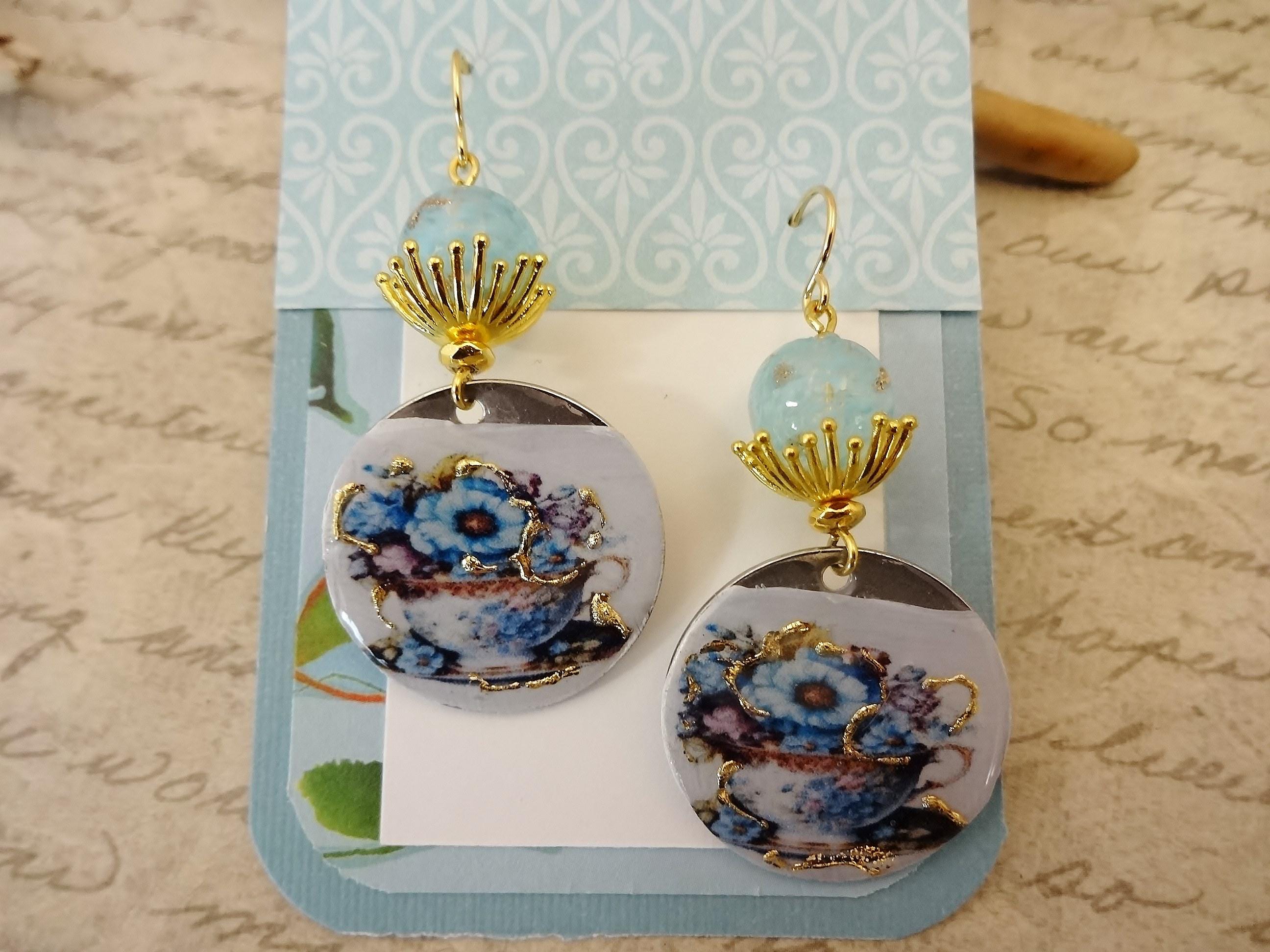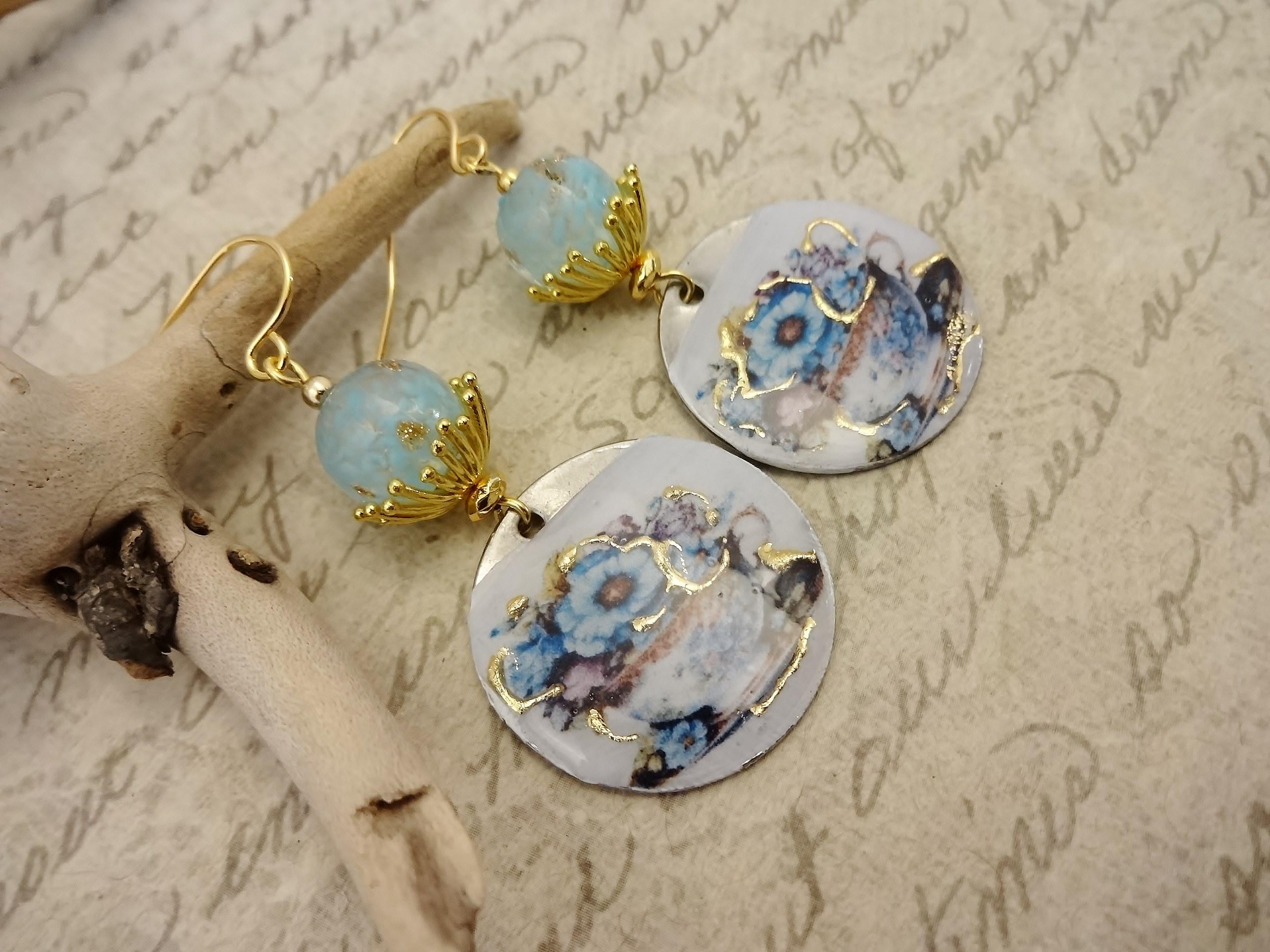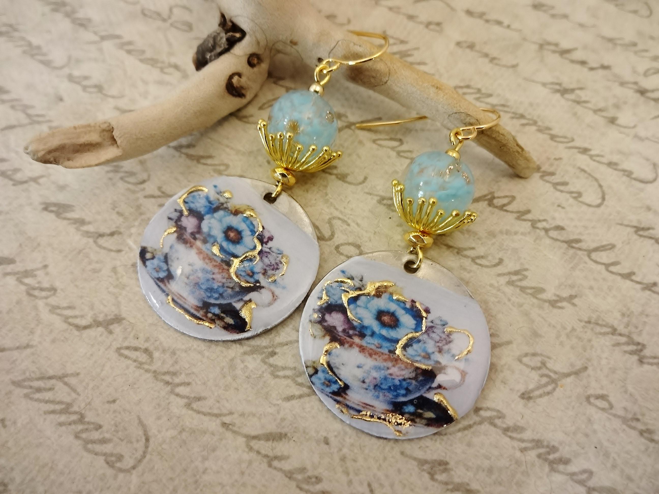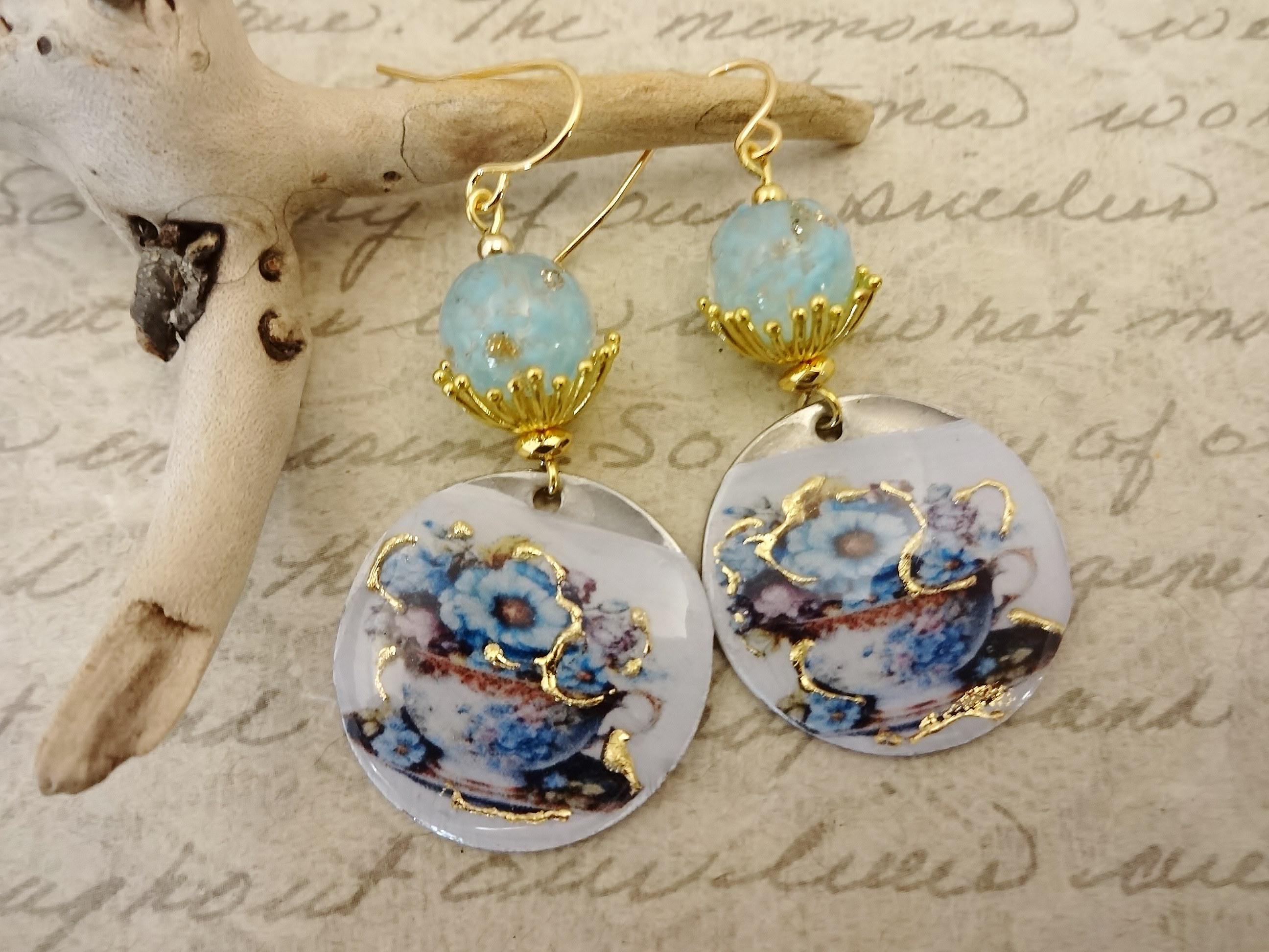Rustic Handmade Resin and Lampwork Glass Earrings: Blue White Teacups