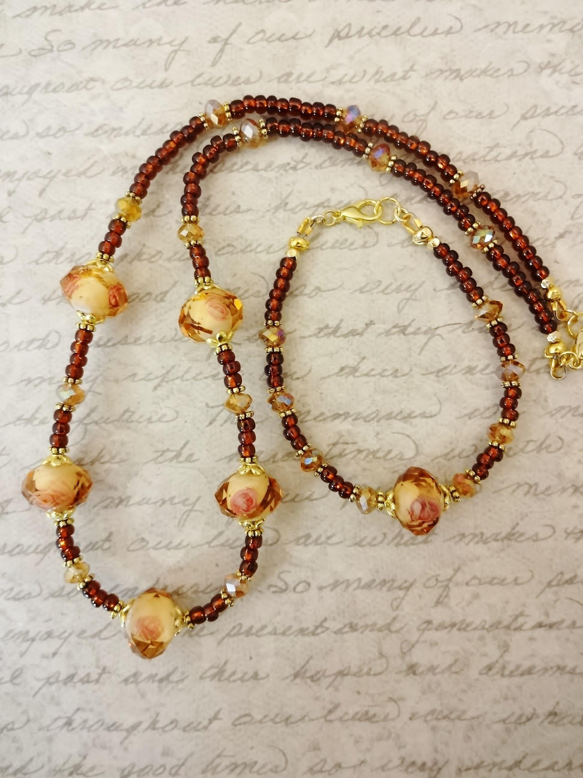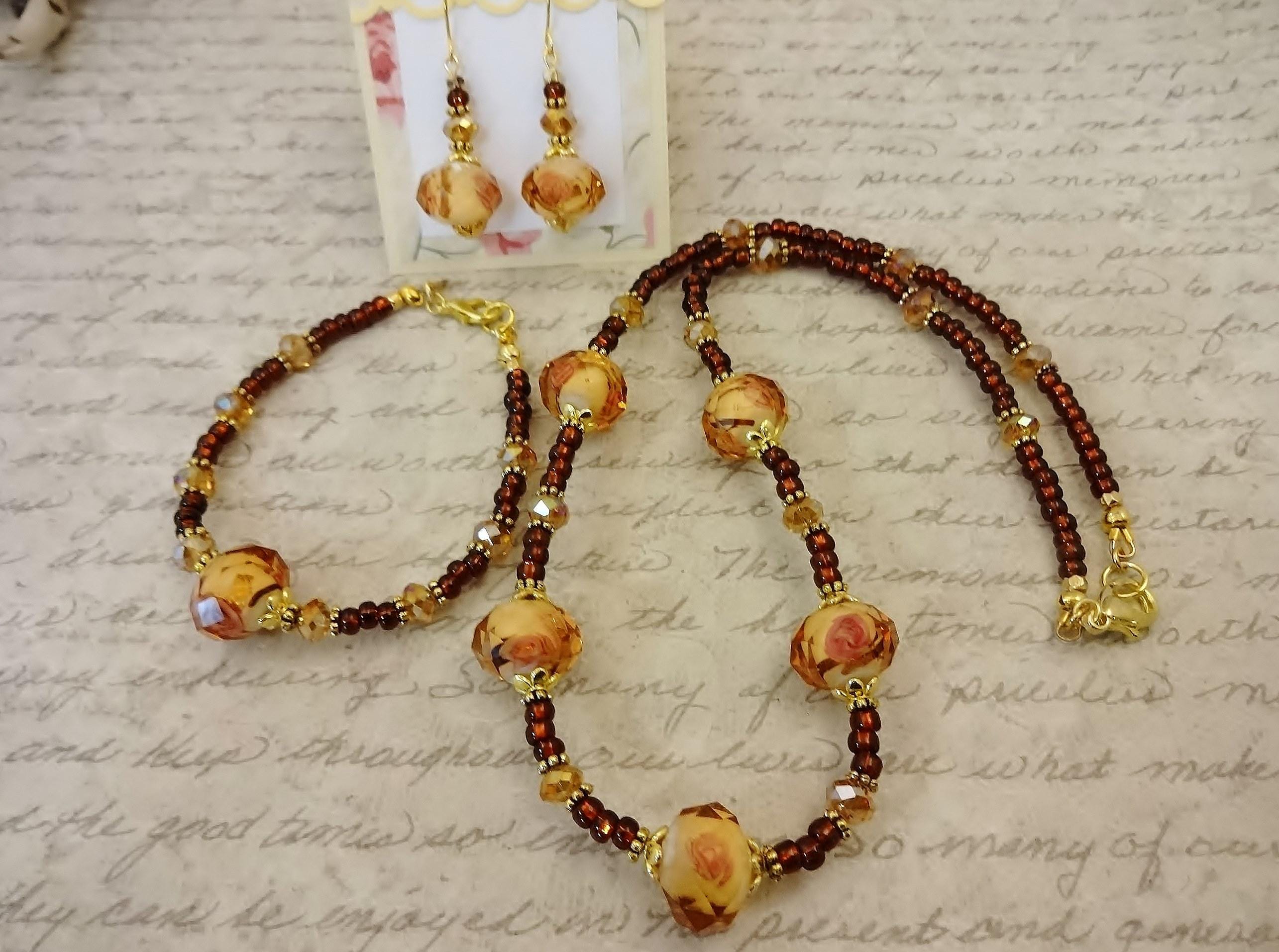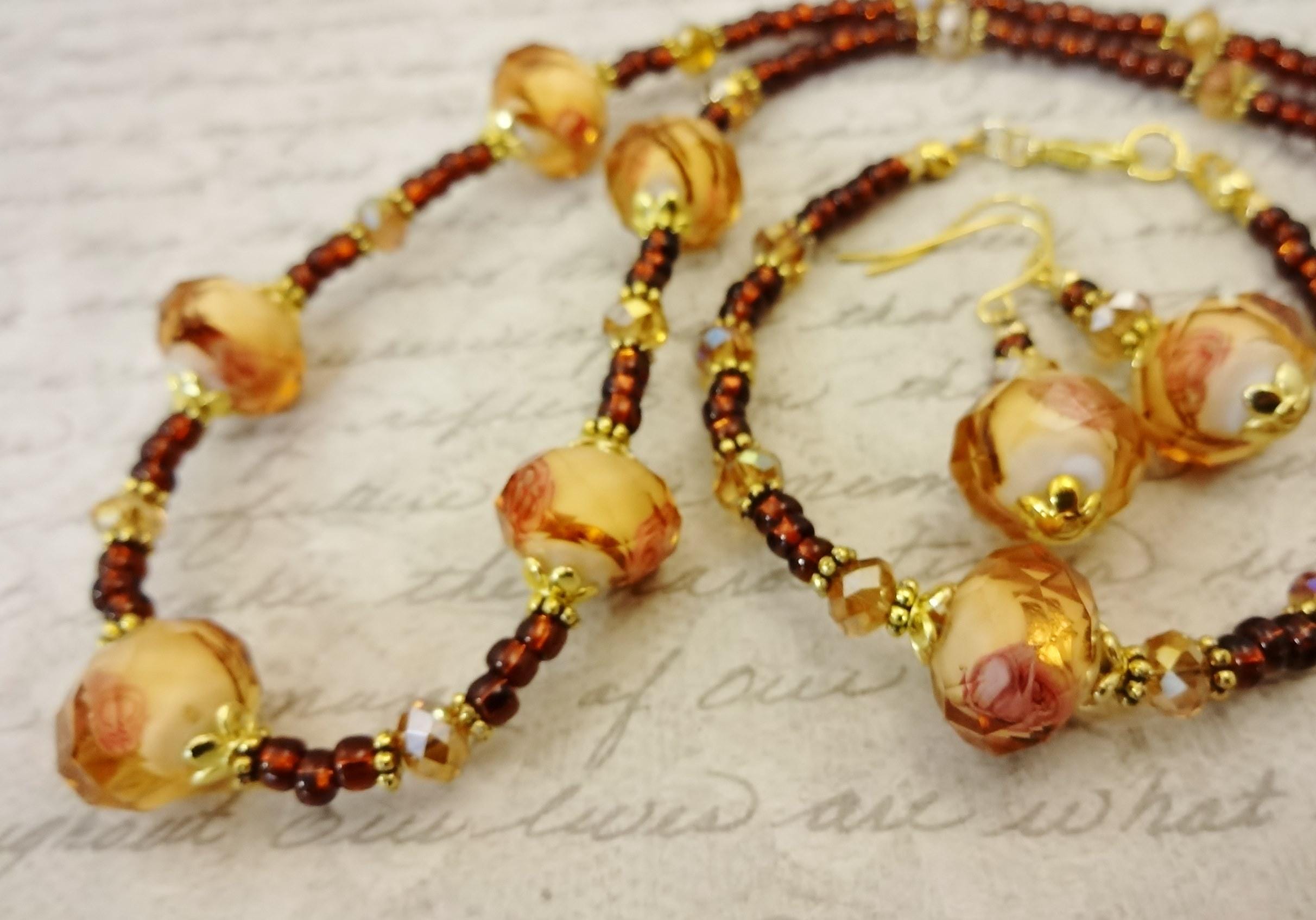 Flower and Foil Lined Glass Necklace Earrings Bracelet Set