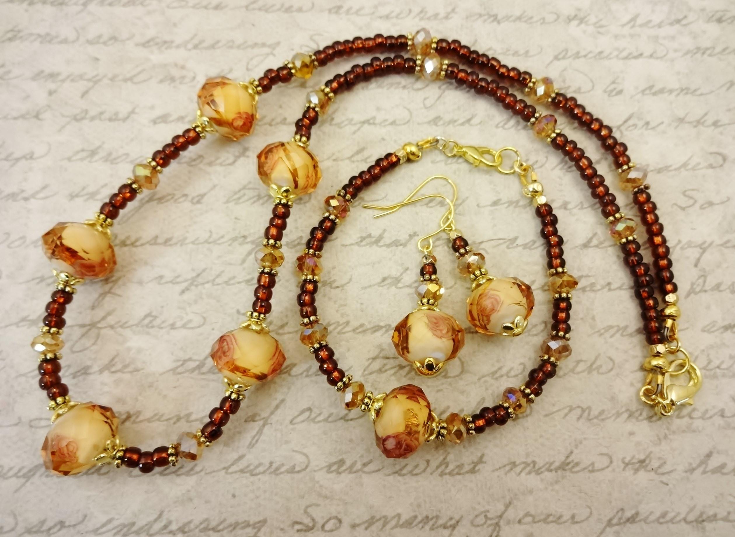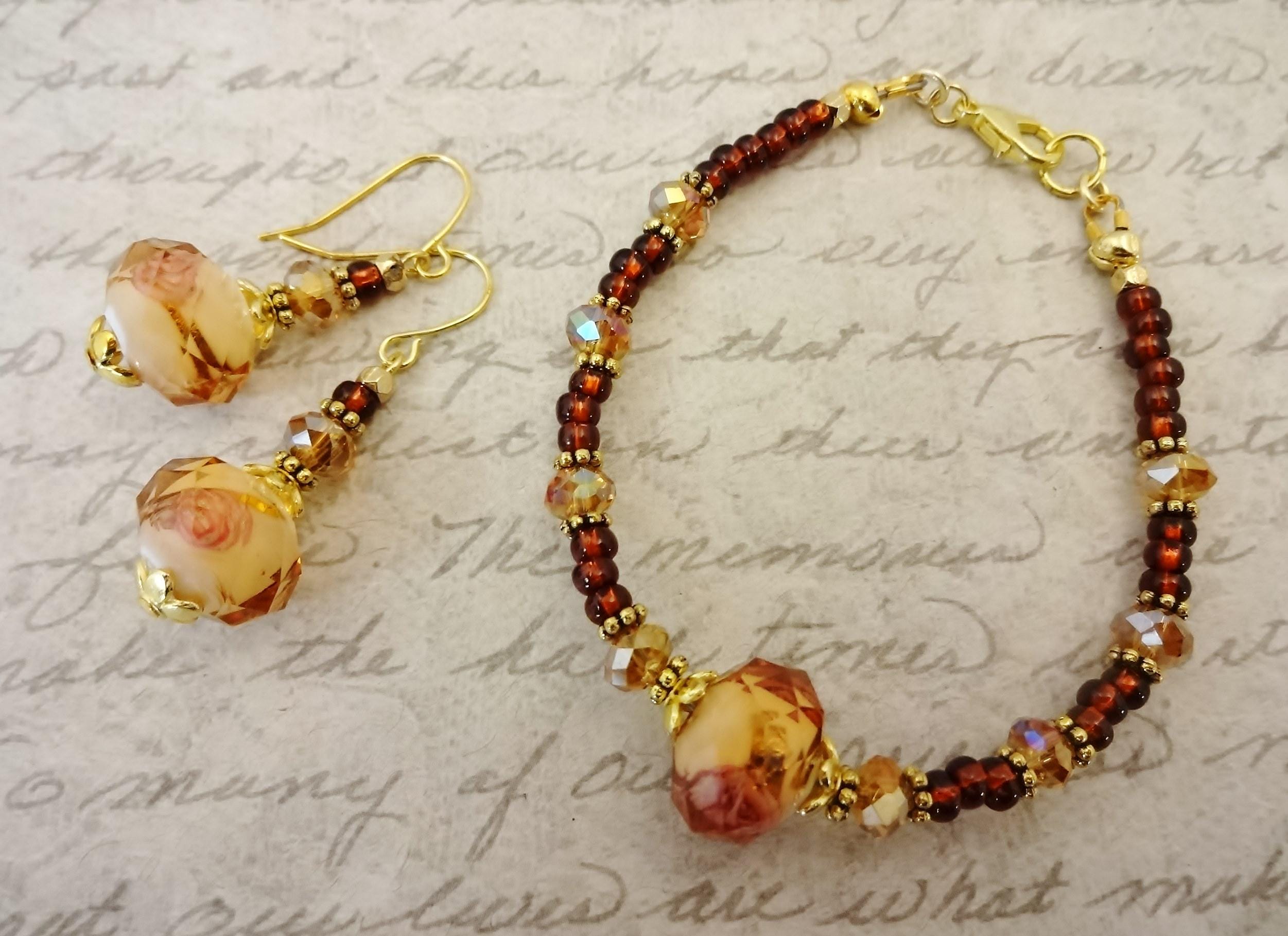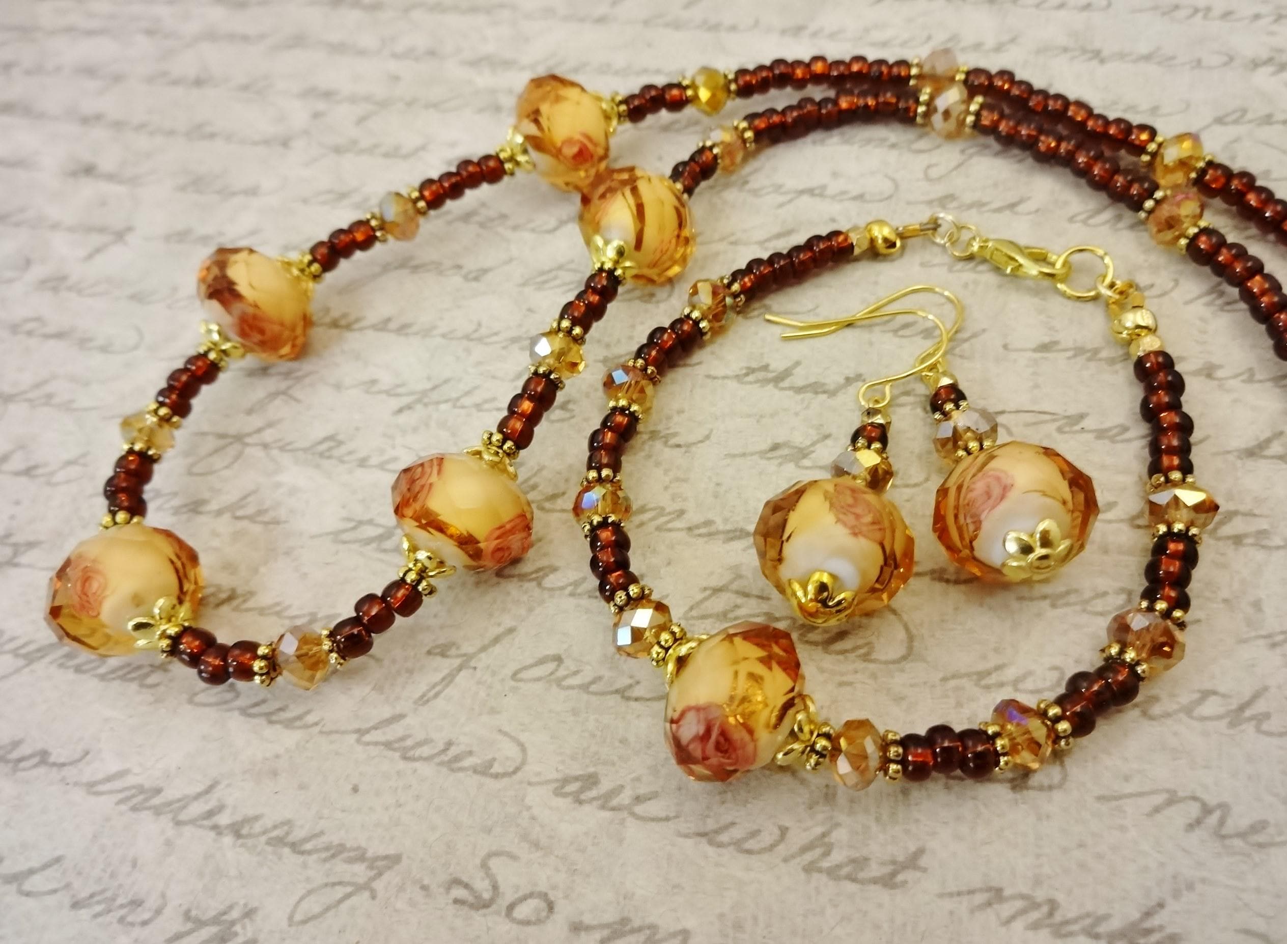 Flower and Foil Lined Glass Necklace Earrings Bracelet Set