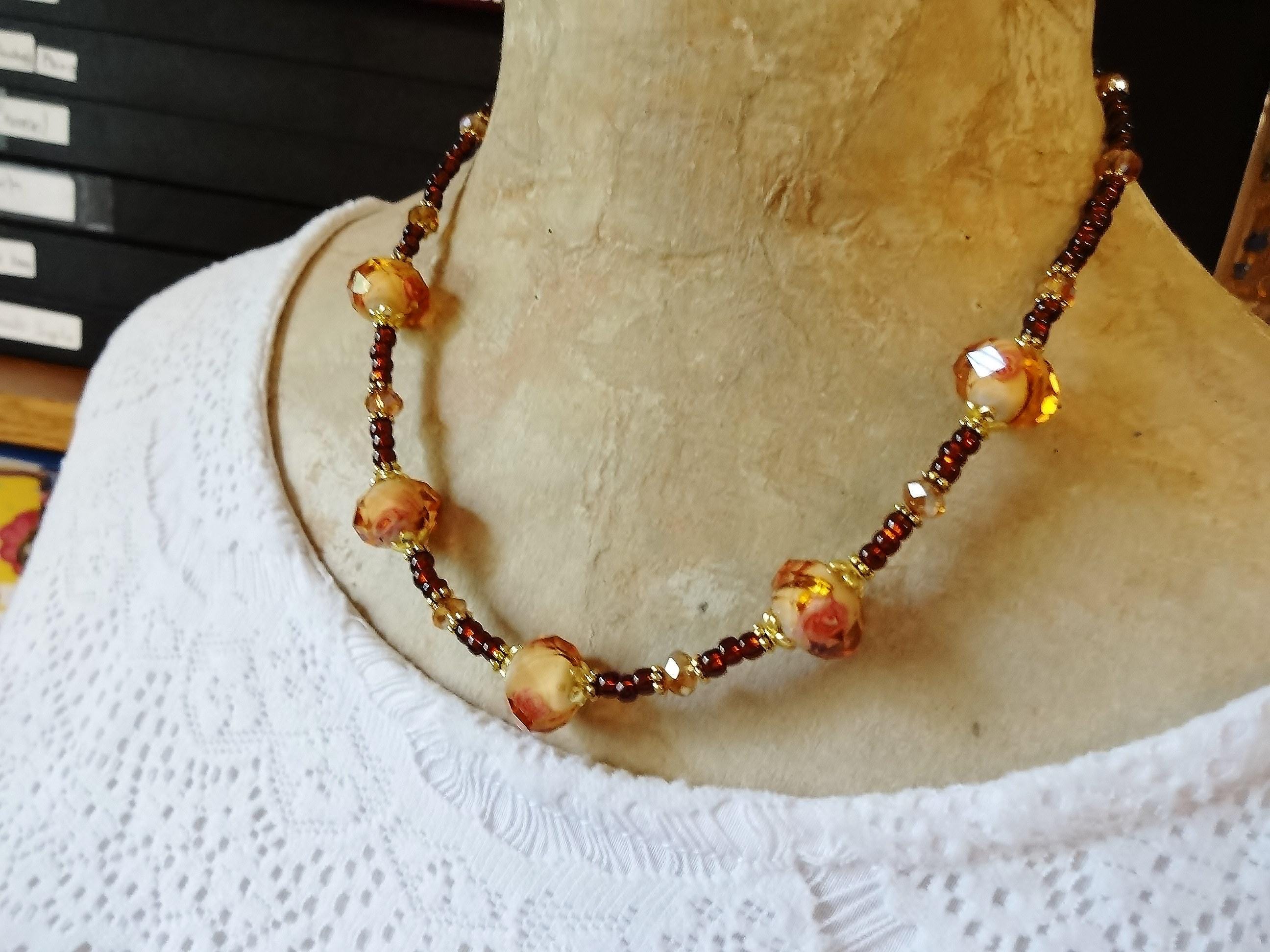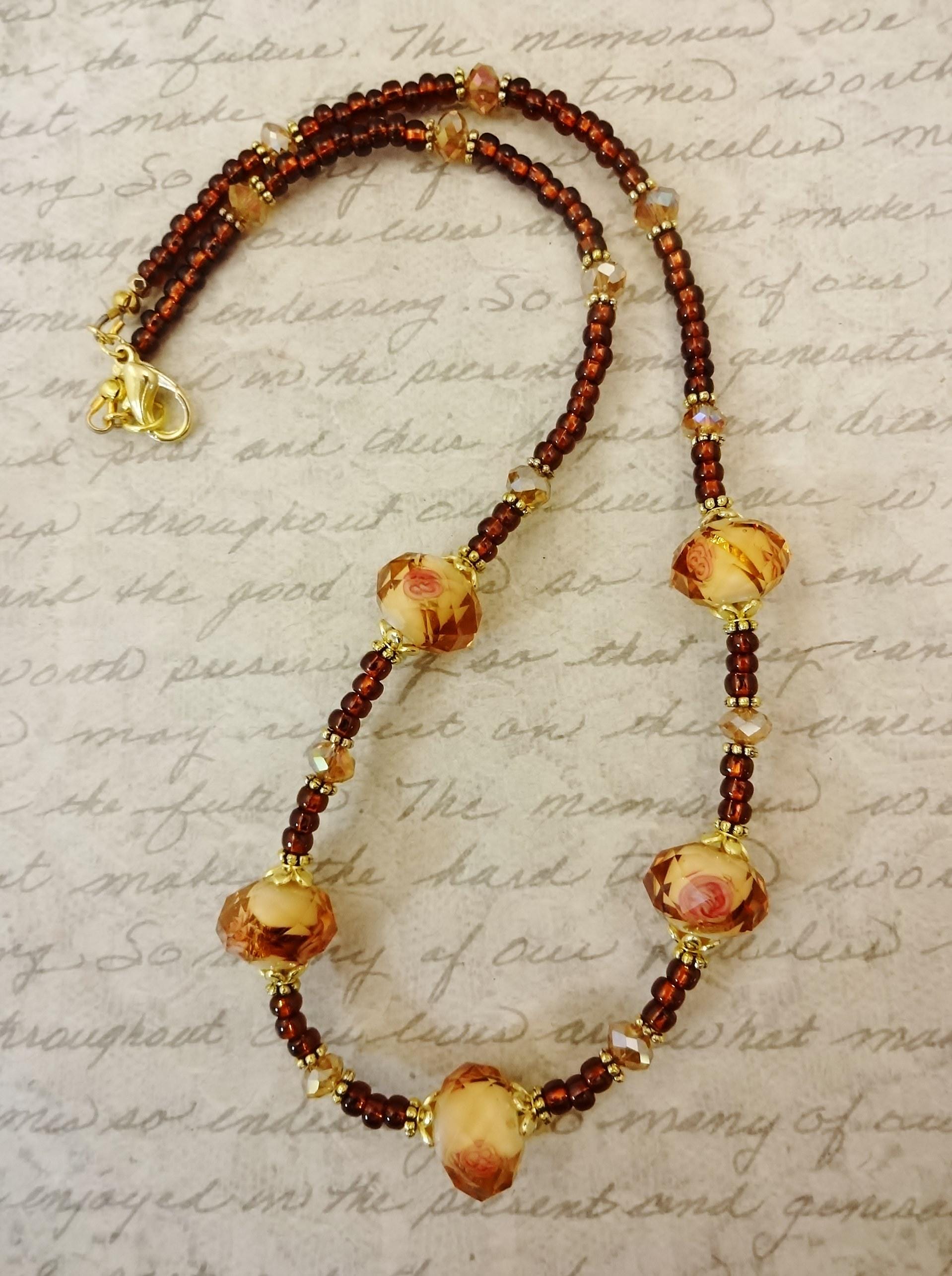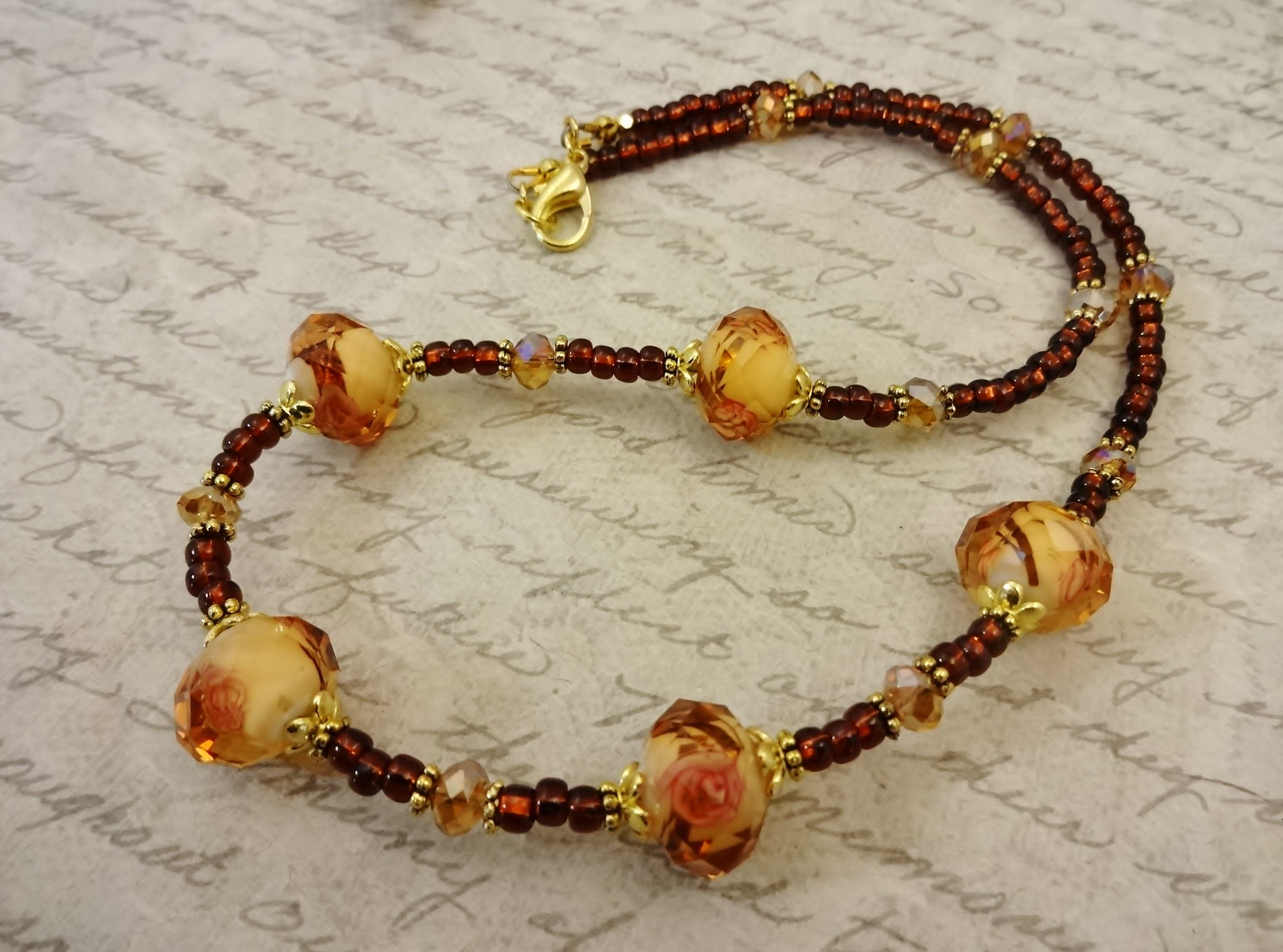 This necklace started with the large crystal Flower rondelles - roses encased in glass. I added the foil lined 6o beads for contrast and because they have an inner glow. With Czech Firepolish rondelles, gold-plated pewter spacer beads and bead caps, the design itself is fairly simple letting the rose beads take center stage.