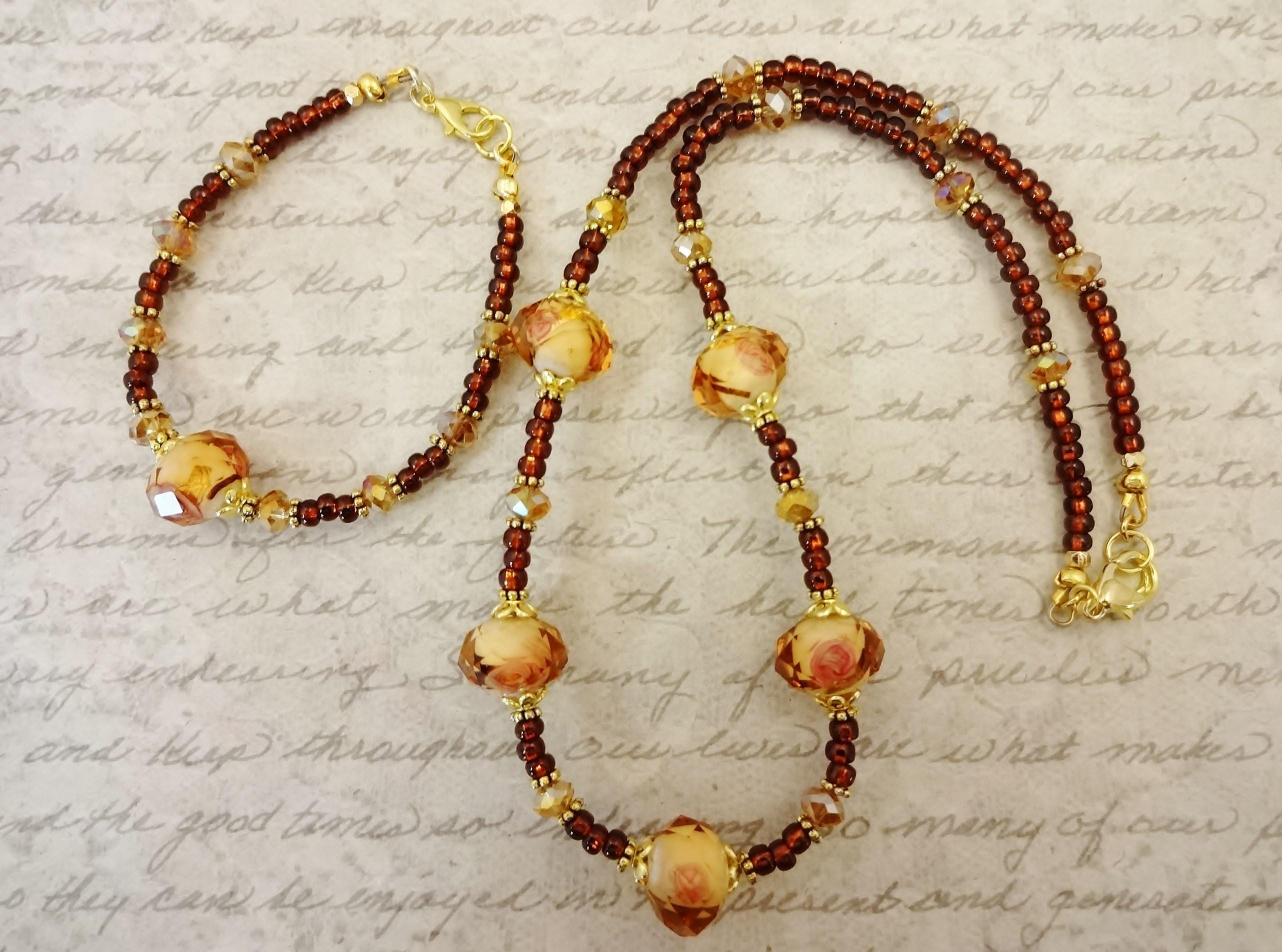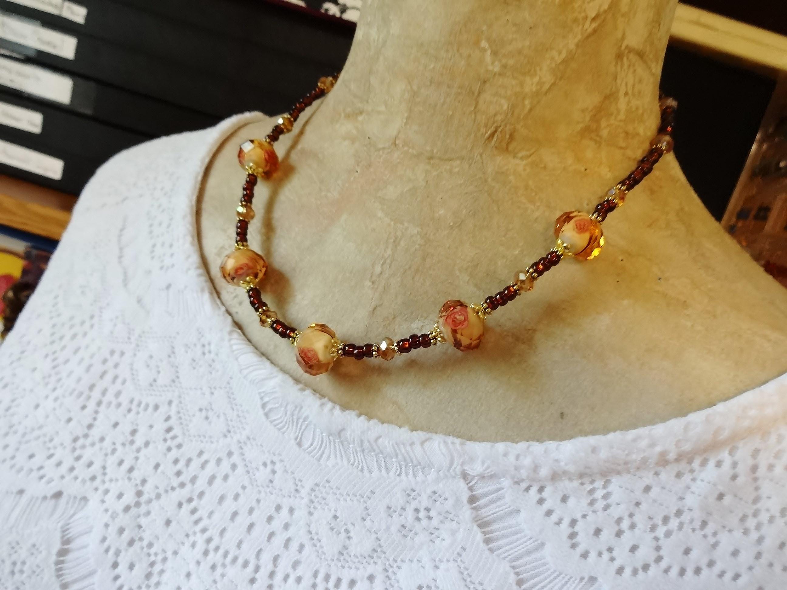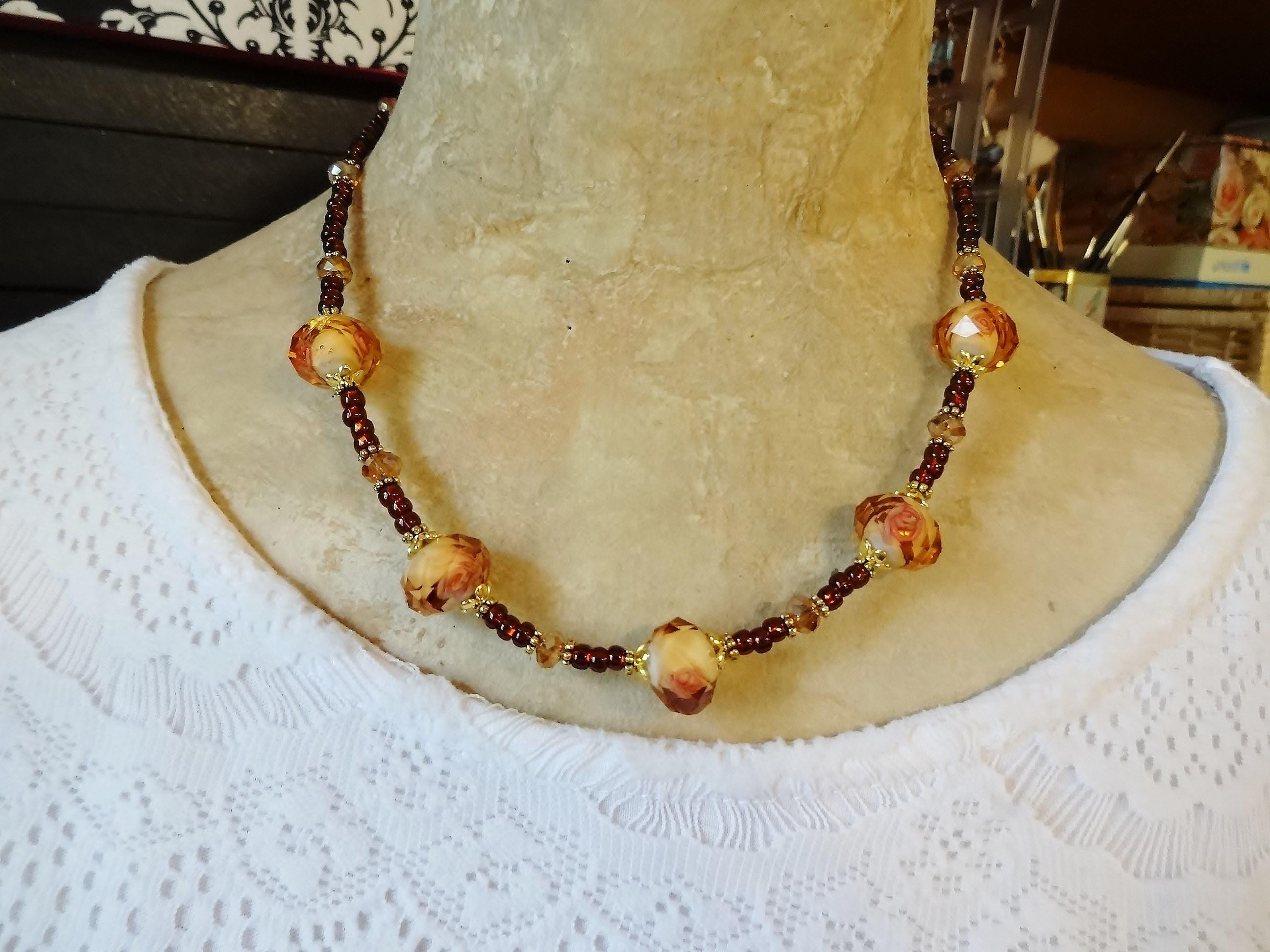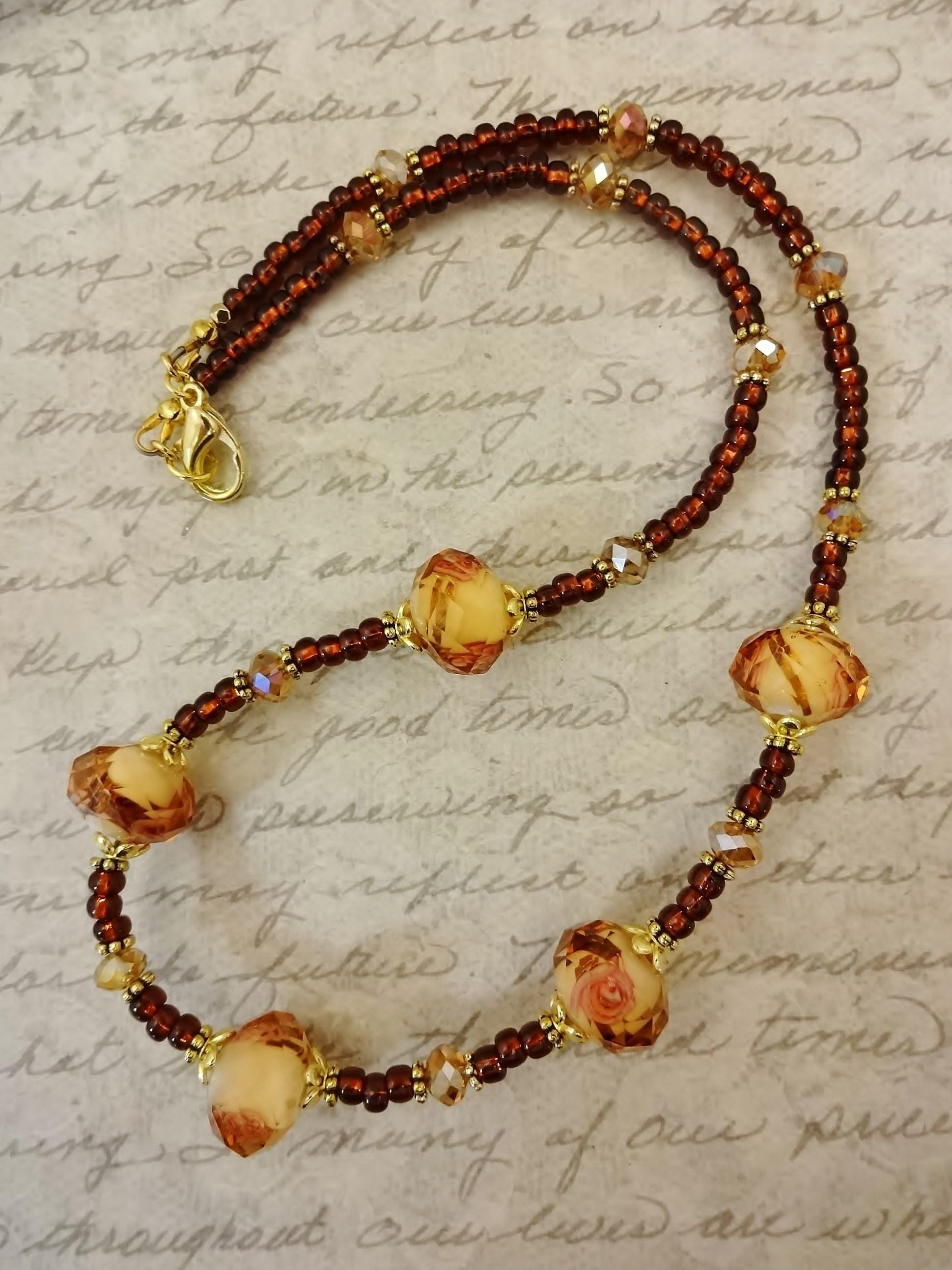 This necklace started with the large crystal Flower rondelles - roses encased in glass. I added the foil lined 6o beads for contrast and because they have an inner glow. With Czech Firepolish rondelles, gold-plated pewter spacer beads and bead caps, the design itself is fairly simple letting the rose beads take center stage.