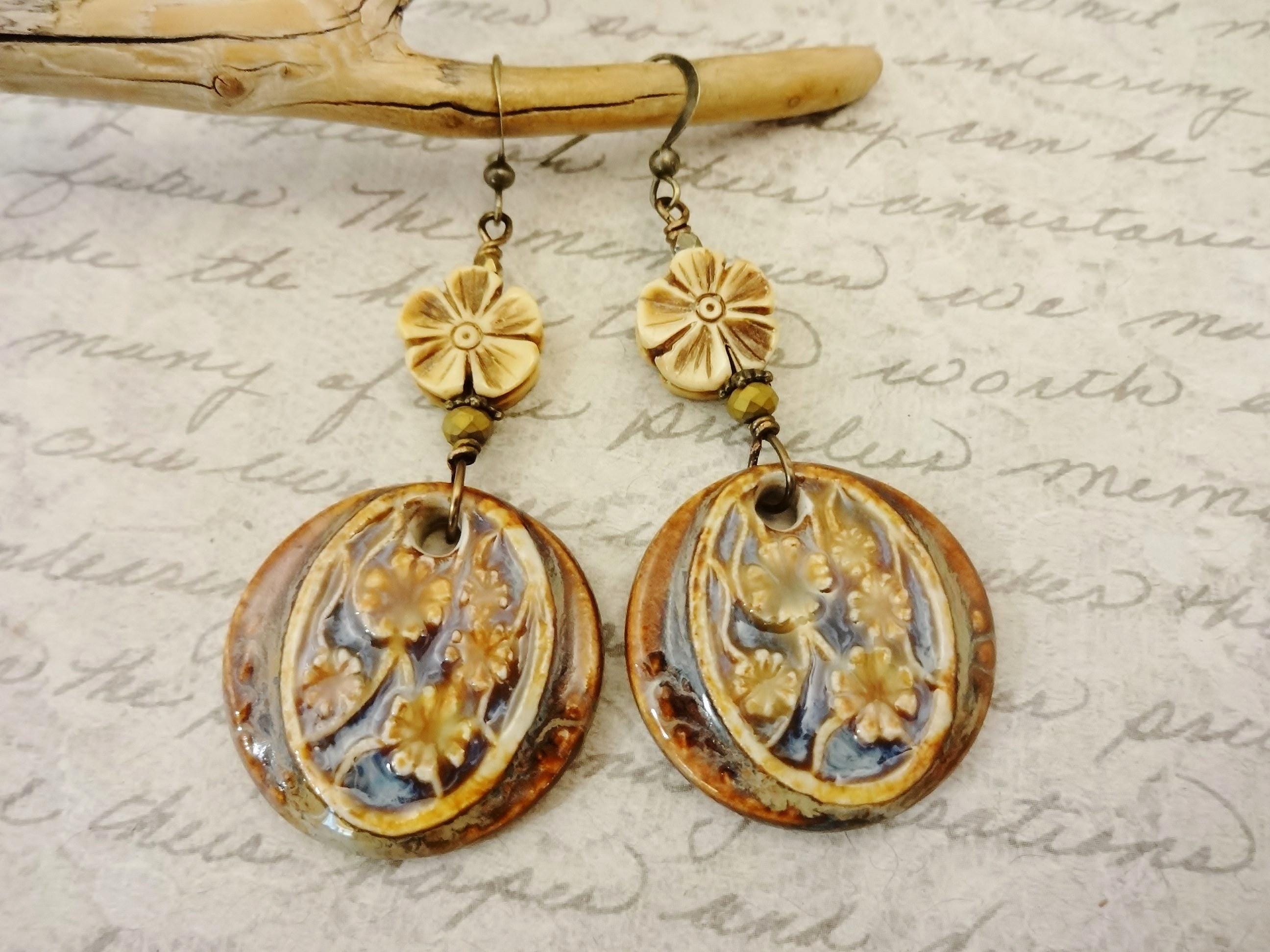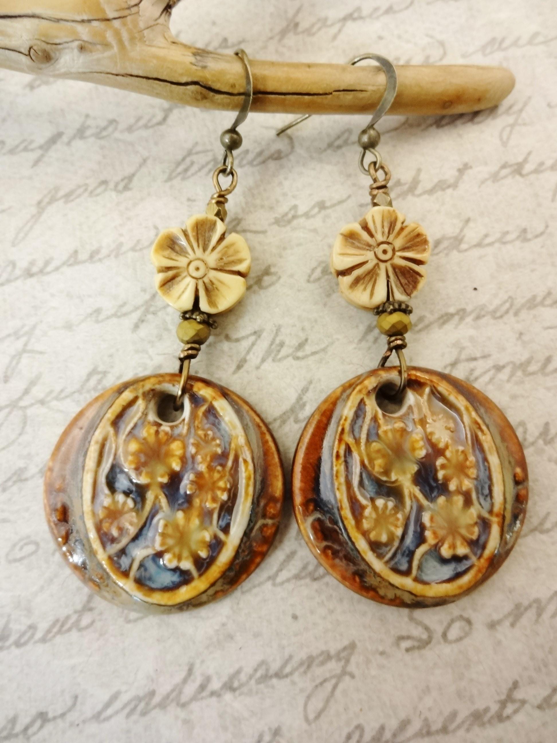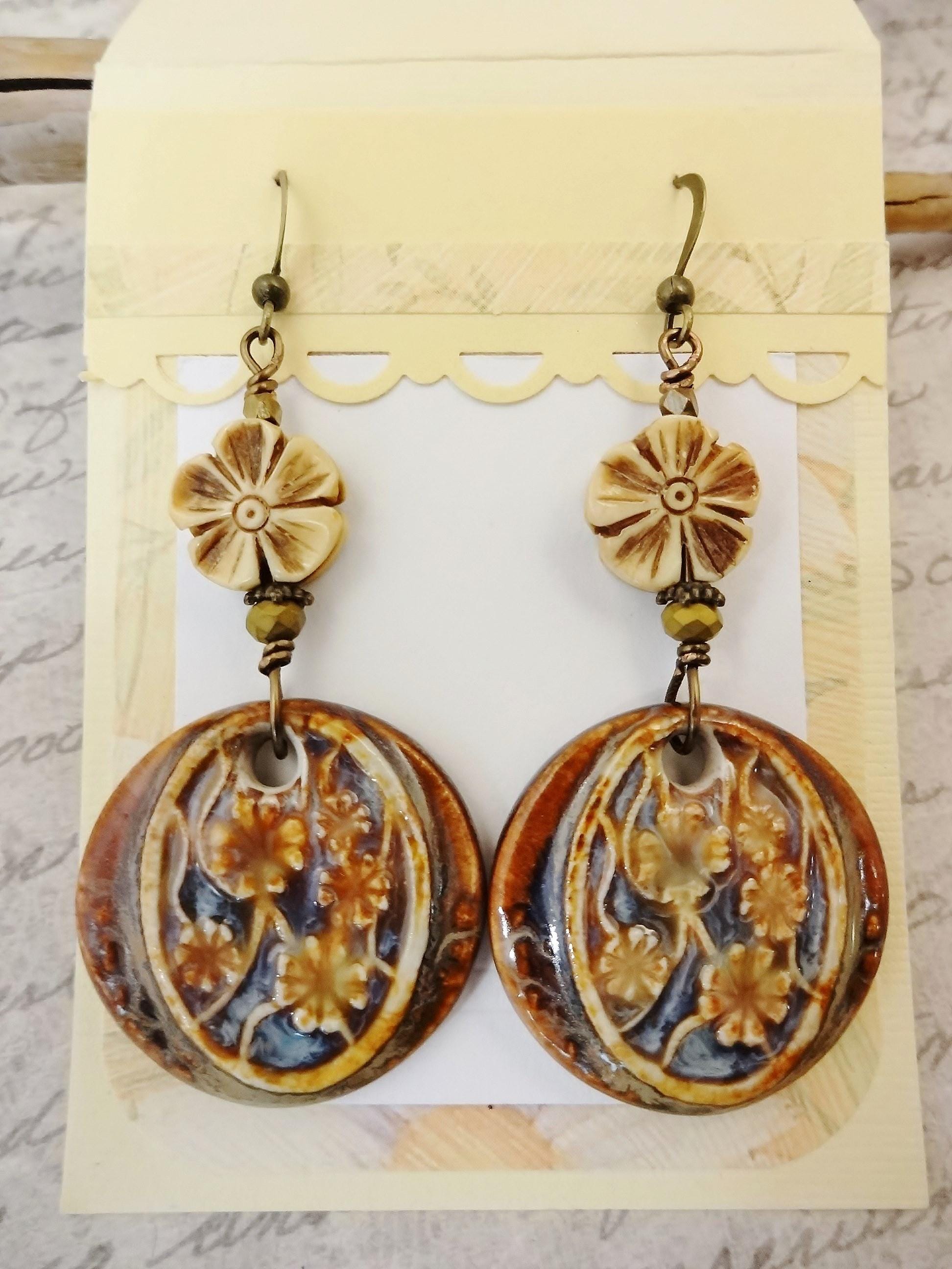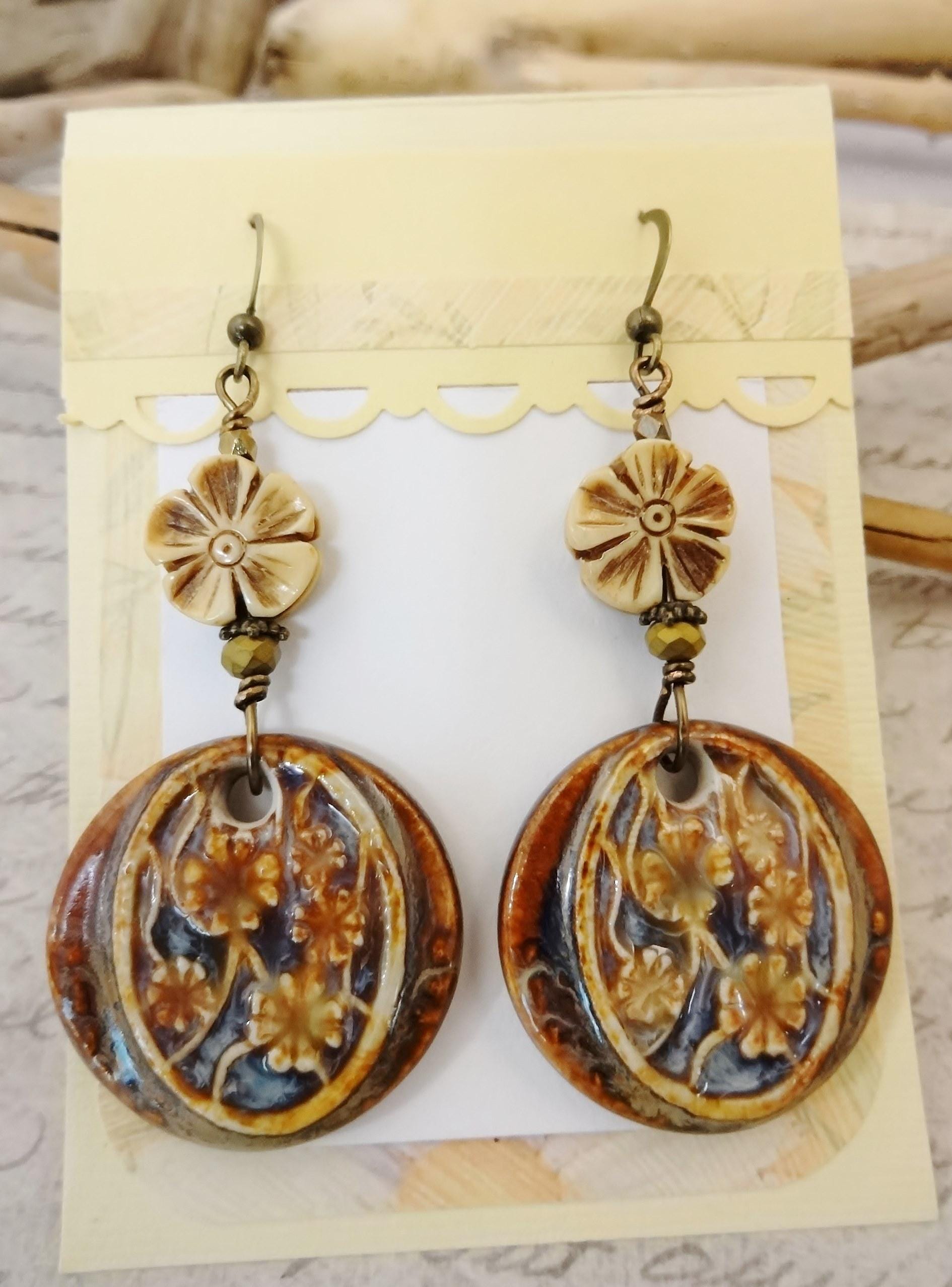 Gorgeous artisan Ceramic components by Maria of Majoyoal are the focal in these artisan earrings. The colors are earthy in browns, sand, caramel and beige.