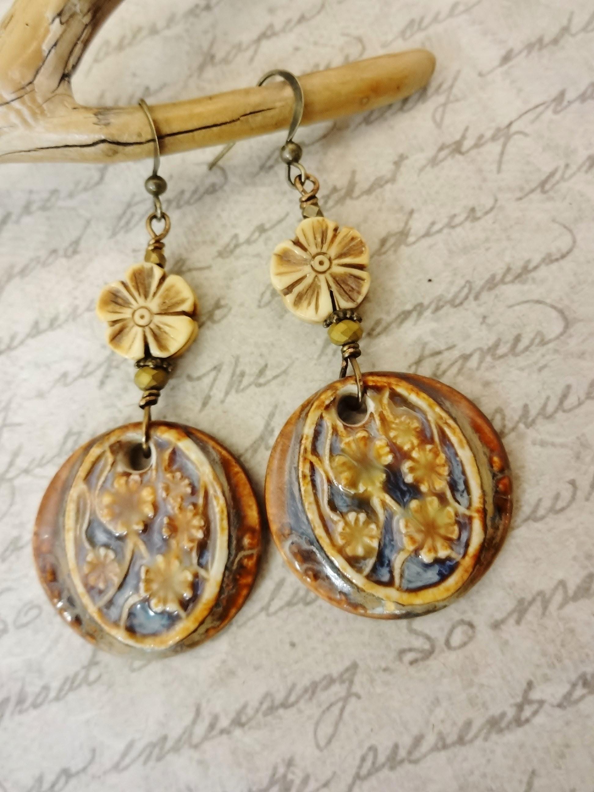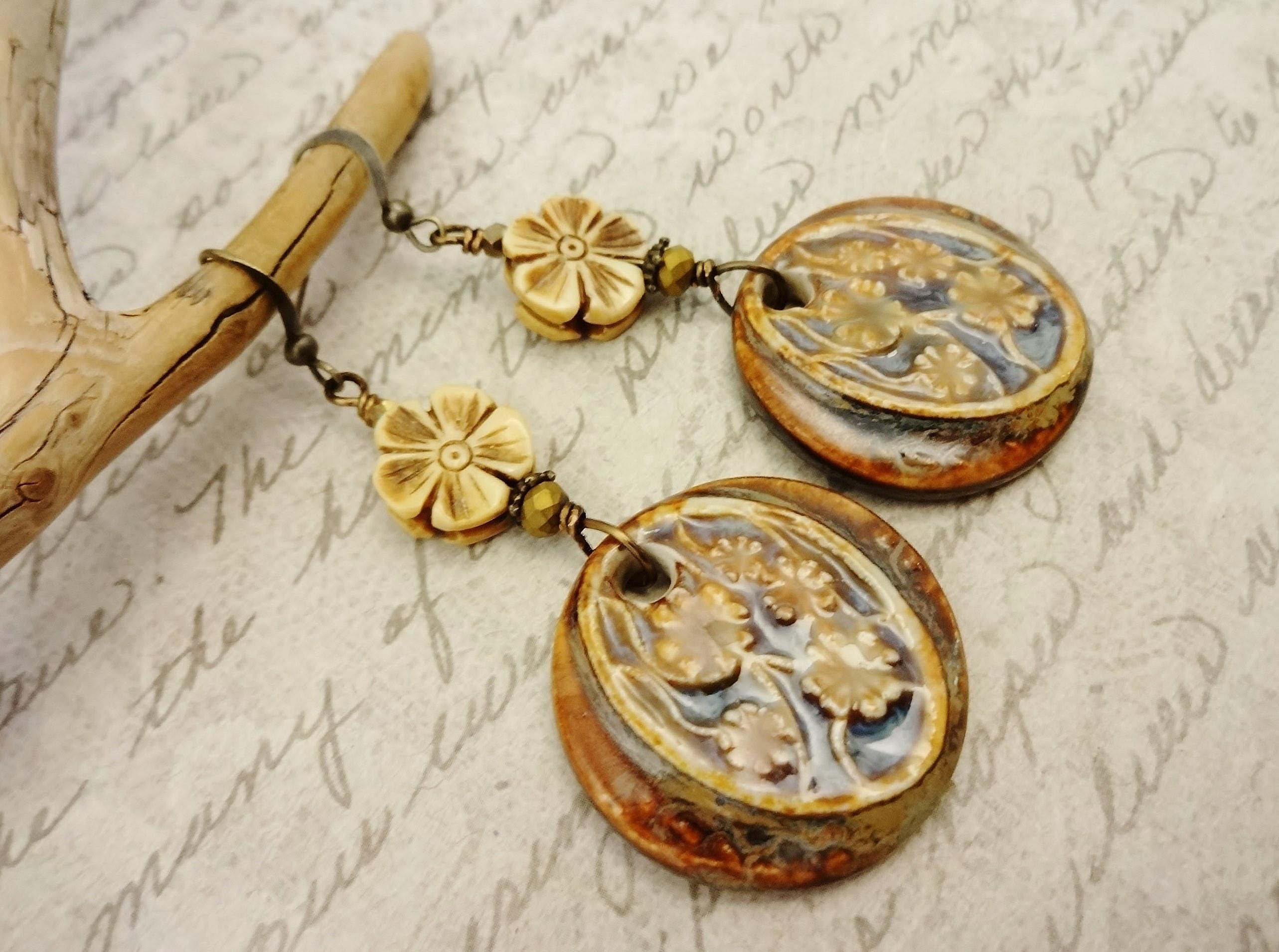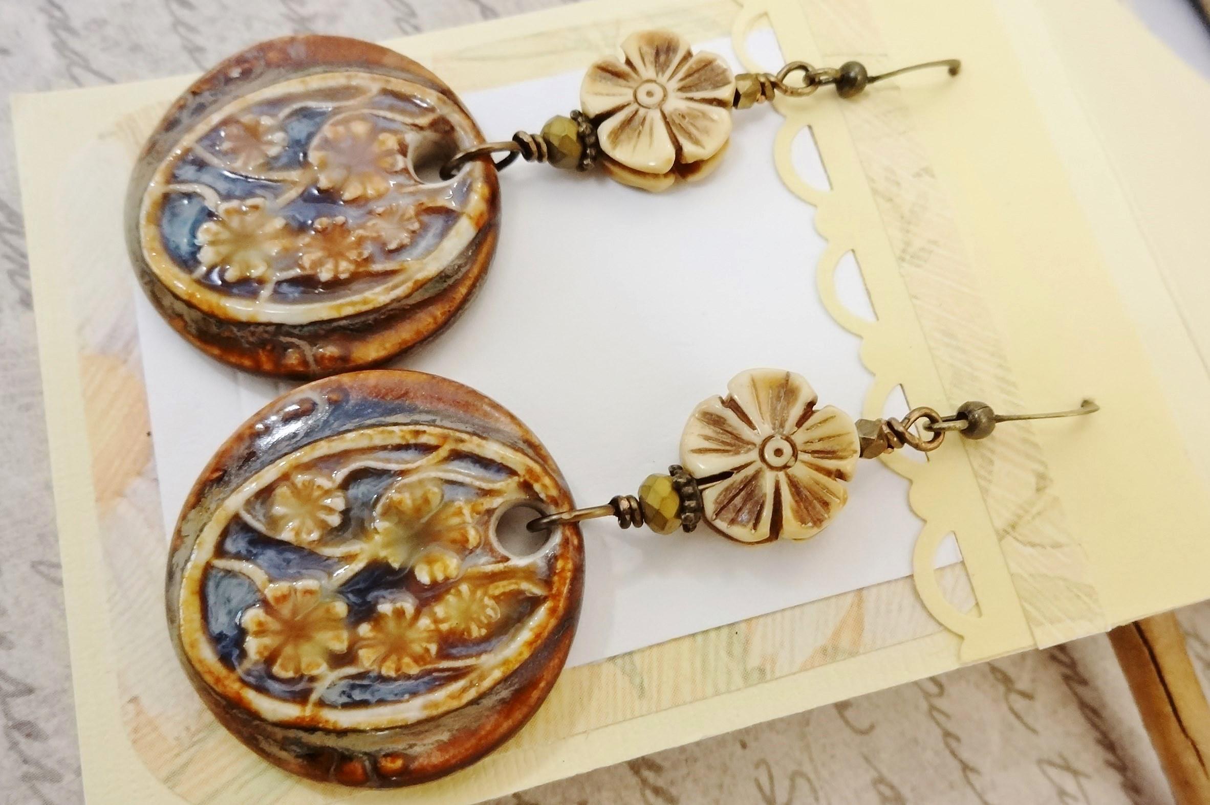 Bohemian Ceramic Earrings: Carved Bone Flower Rustic